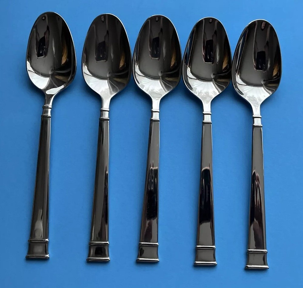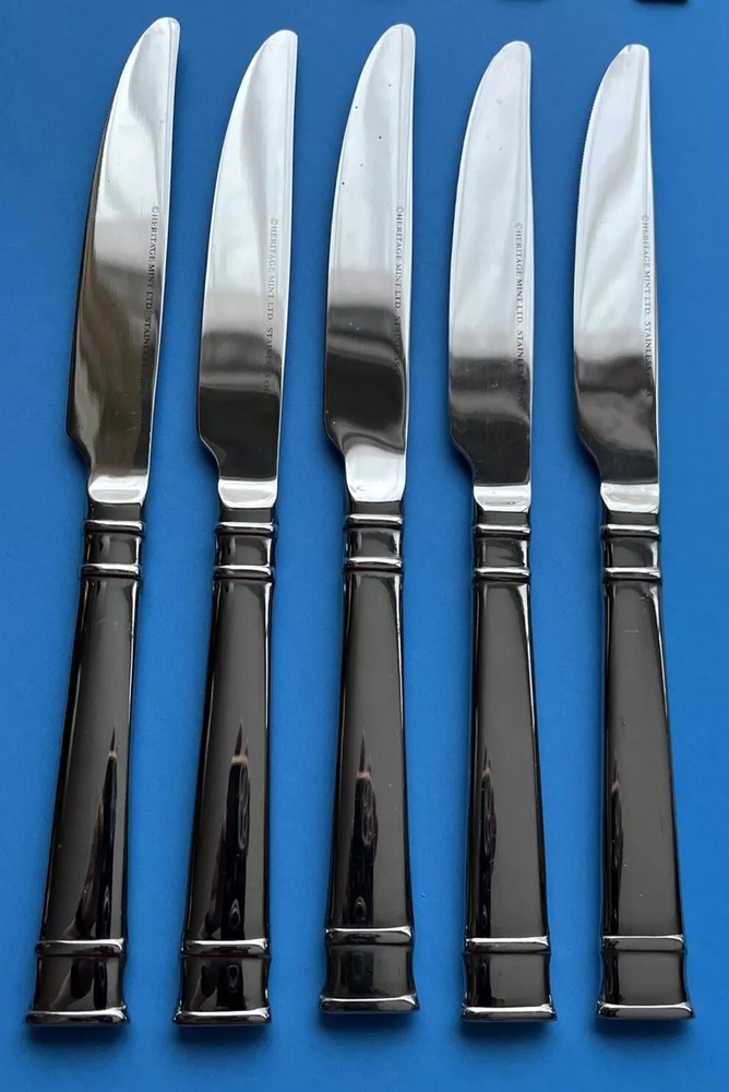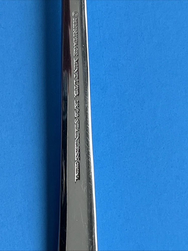 Lot of 22 Bentley by Heritage Mint. Lot includes: 5 dinner forks 7 3/4” 2 salad forks 7” 5 dinner knives 9 1/8” 5 teaspoons 6 3/8” 5 place/oval soup spoons 7” In good condition with no cracks or disposal damage. Scratches consistent with pre owned use. Please see photos.