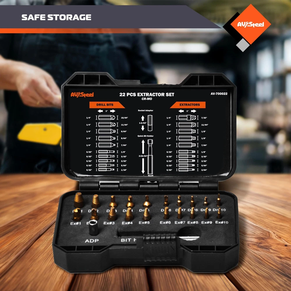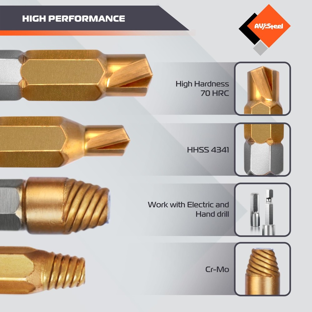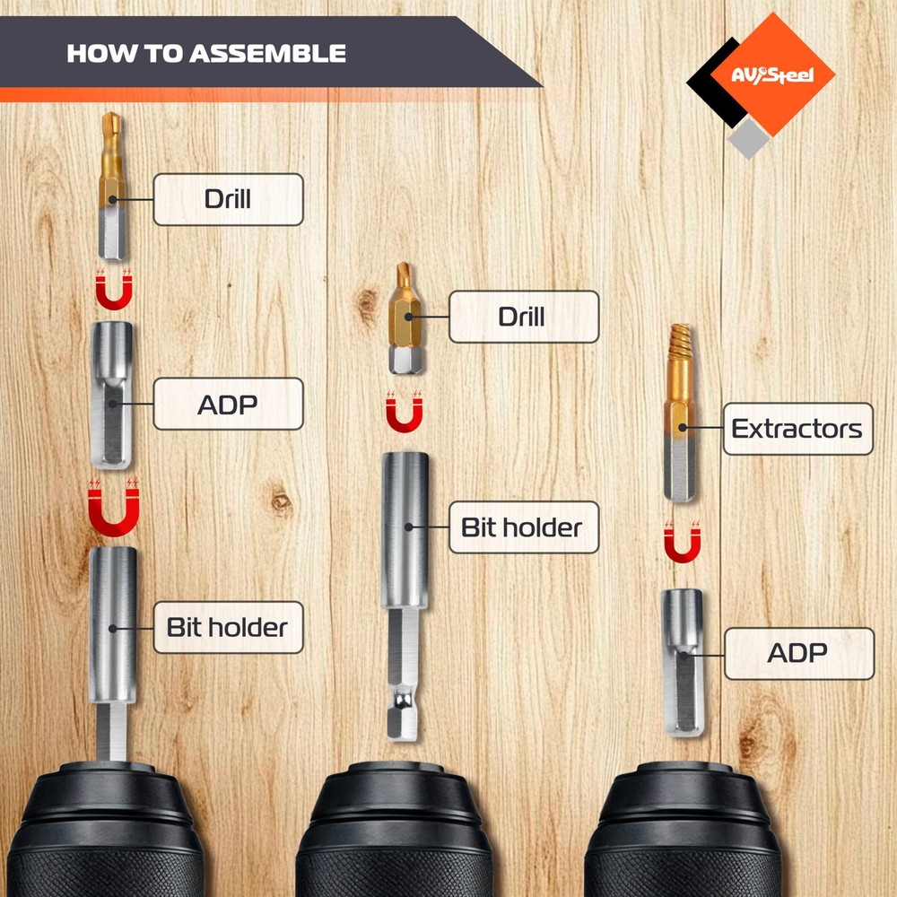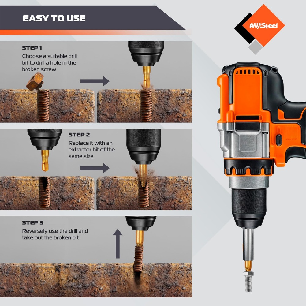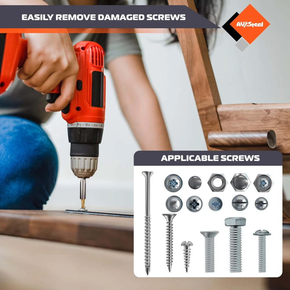 The damaged screw extractor set is constructed from high-quality CR-MO, ensuring long-lasting durability. This easy out bolt extractor set is robust and reliable, allowing for easy removal of damaged screws and enhancing your work efficiency. Select a screw extractor of the right size to easily remove broken or damaged bolts. The compact and portable storage case ensures that you are always ready to tackle unexpected extraction challenges. The striped screw remover kit designed to remove broken screws are perfect for use on both wood and metal. They are well-suited for construction, automotive tasks, home DIY projects, and industrial applications. ✅ Set Includes: Bolt extractor kit includes drill bits size: 5.9 mm, 4.5 mm and 3.5 mm, 2.8 mm, 3.2 mm, 2.5 mm, 2.2 mm, 1.5 mm. Extractors size: 5.7 mm, 4.3 mm, 3.3 mm, 2.6 mm, 3.0 mm, 2.3 mm, 2.0 mm and 1.3 mm. Heavy duty storage case for easy organization and storage with all sizes that are clearly labeled. ✅ Bit Holder: The stripped screw extractor removal tool includes bit holder and ADP. This practical accessory is equipped with a powerful magnet that securely holds bits in place, preventing them from slipping or dropping during use. Its elongated design allows for easy access to tight or hard-to-reach spaces. ✅ Easy to use: Firstly, select a drill bit that is smaller than the damaged screw, attach it to an electric hand drill, and create a hole. Secondly, swap in an extractor that matches the hole size, tighten it by turning it counterclockwise, and then pull it out. ✅ High Quality: Broken screw extractor set is made of quality CR-MO ensuring durability. The easy out bolt extractor set is highly durable and strong, ensuring that it can easily remove damaged screws and make your work more efficient. ✅ Wide Application: Extractor set suitable for allen bolts, machine screws, lag bolts, wood screws, hex bolts, sheet metal screws, and more. The Remover set is suitable for DIY projects at home or garden woodworking, as well as the assembly of small household appliances or electronics. ✅ Customer Service: We provide a lifetime warranty against design, materials, and workmanship defects, along with 24/7 customer service for your peace of mind.