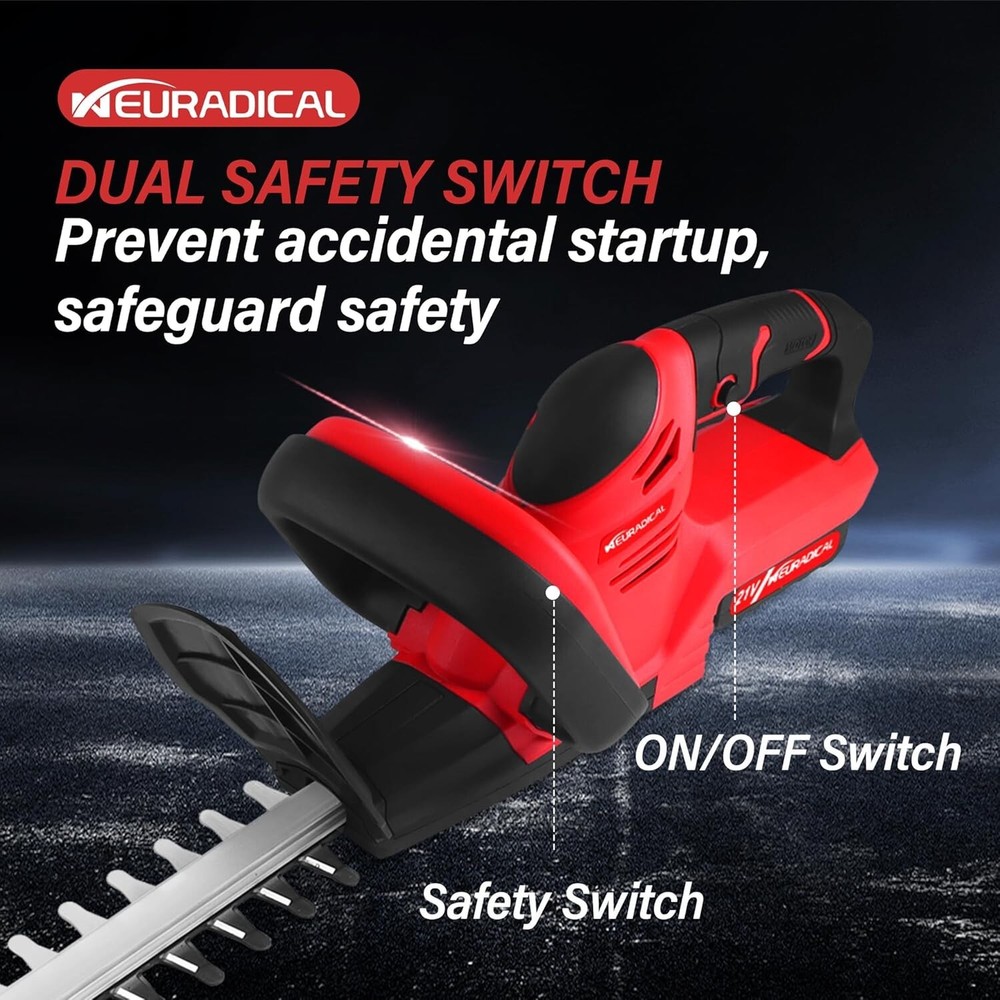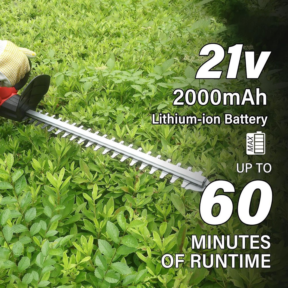 Description: 【Cordless Hedge Trimmer】- Designed with cordless ease, experience hassle-free trimming with our advanced cordless electric hedge trimmer. Trim your flower beds, shrubs, and small branches without the limitations of cords. Get the job done efficiently and conveniently! 【22" Powerful Dual-Action Blade】- This electric hedge trimmer cordless features a 22-inch dual-action laser blade with a 3/5-inch cutting diameter—it can cut through most small to medium-sized trees with ease; Equipped with a powerful pure copper motor with no-load speeds up to 1400RPM, this hedge trimmer can deliver optimal and efficient results under almost all working conditions 【 4.0Ah Battery and Charger】- The power operated hedge trimmers is equipped with 4.0Ah lithium-ion battery, allowing you to charge grass cutter anytime and anywhere, making trimming more convenient. At the same time, the fast charging charger saves your waiting time. 【180° Rotatable】- An adaptable 180° rotating handle for seamless horizontal and vertical trimming. Say goodbye to twisted postures and hello to a garden care routine as flexible as your plants' growth. Experience reduced body and arm strain, thanks to the lightweight design, ensuring a comfortable and enjoyable trimming experience. Specification: Name: Cordless Hedge Trimmer Material: Metal+ABS Color: Red Speed: 2800r/minBattery Number:1 PCS Rated voltage:24V Blade length 51cm Applied for Makita 18V Battery Battery capacity: 3000mAh(Note: A single battery is 1500mah, a total of 2 batteries are connected in series and parallel) Package Included: 1 x Hedge Trimmer 1 x Blade cover 1 x Goggles 1 Pair x Gloves 2 x Battery 1 x Charger 1 x Screwdriver