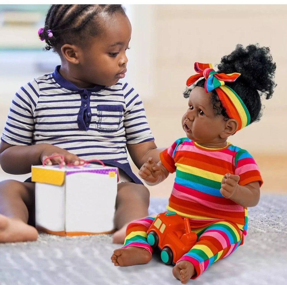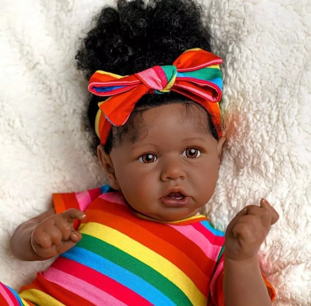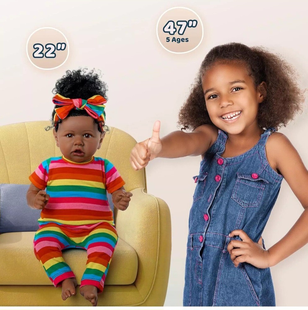 This 22in finished Reborn Baby Doll is a soft and cuddly African American newborn girl that is anatomically correct and has a lifelike feel. It comes with a bottle, outfit, pacifier, headband, and doll, all of which are washable and non-toxic. The doll has curly black hair, medium dark complexion, and random eye color. It is a collector toy that is suitable for all occasions and age levels, especially unisex baby and toddler. The doll is handmade with vinyl material and features removable clothes. This Babies theme doll is a perfect gift for anyone who loves dolls. Note that the packaging is not included.