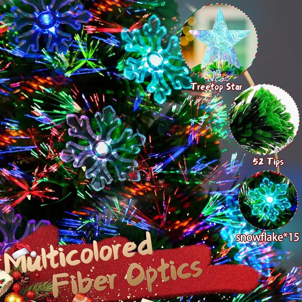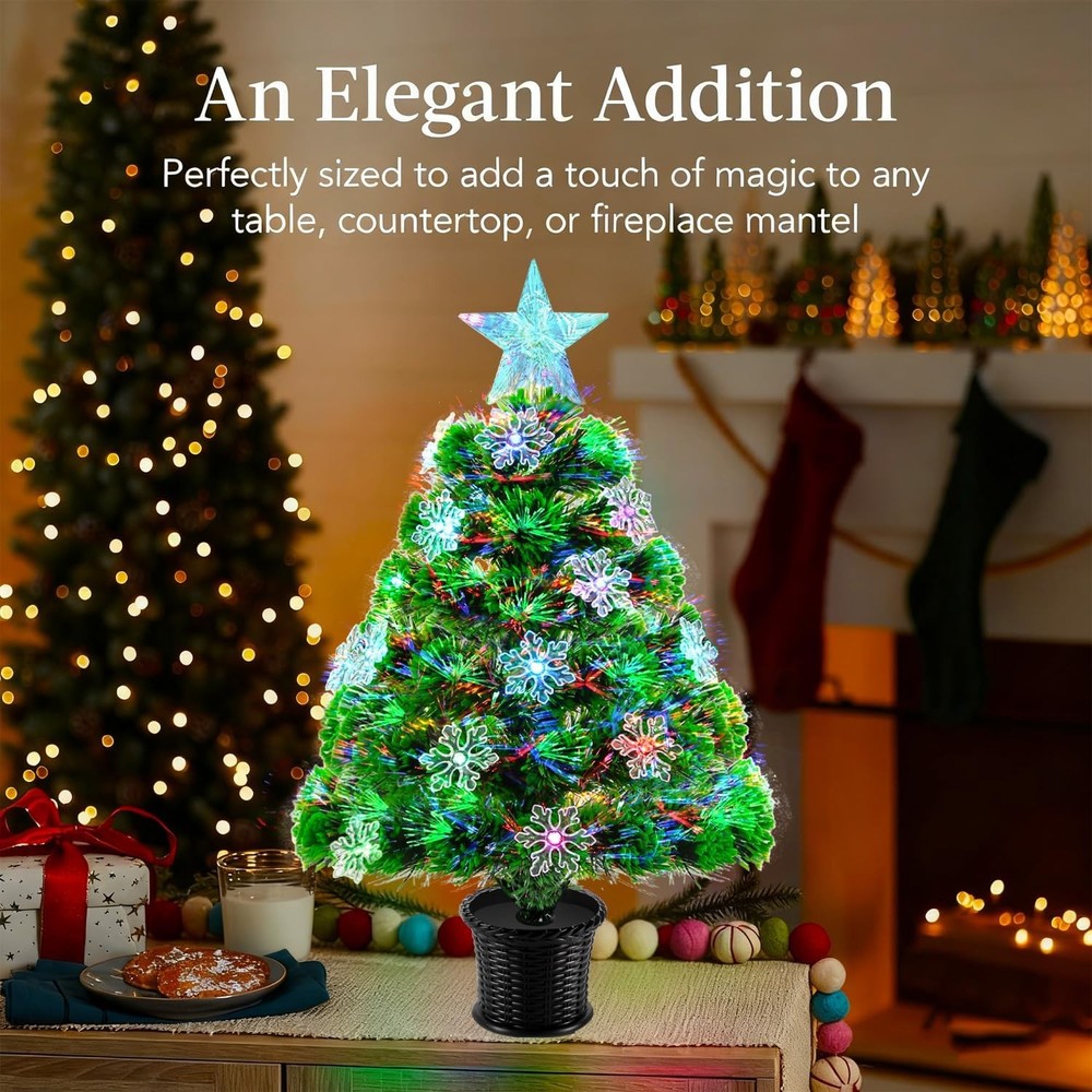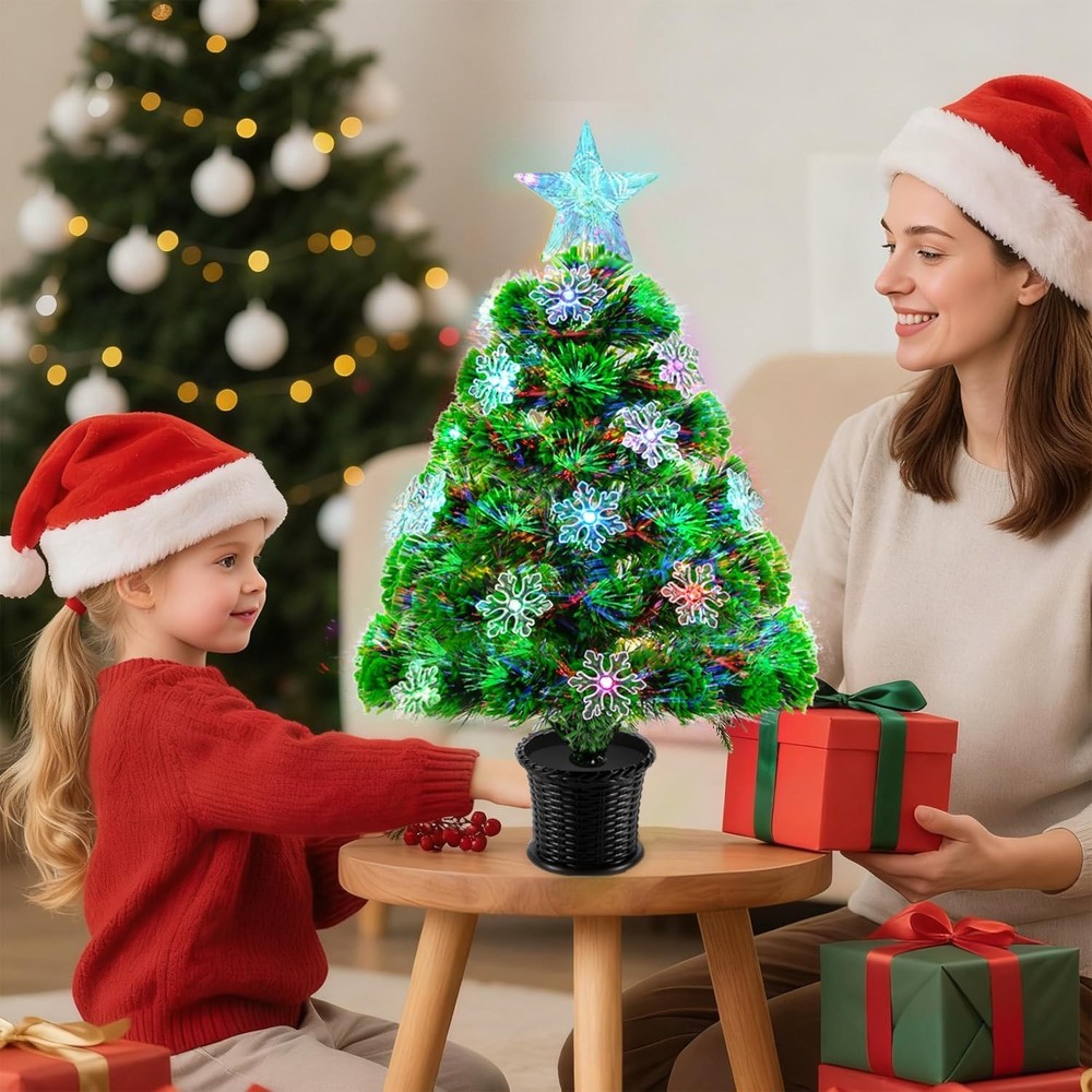🎄 Package includes: Fiber optic little tree*1, snowflake ornaments*15,base*1 and star tree topper*1.Standing 22in tall,measures from top to bottom including the base and tree toper. The fiber optic color can exchange between red, green, blue and mixed colors, it will be your holiday tree for years to come. 🎄Durable PVC Construction:Crafted with 52 tips of high-quality PVC needles, this mini Christmas tree offers a lush, lifelike appearance. The material is anti-aging and flexible, ensuring it stays beautiful year after year. 🎄 Dual Power Options: USB or Battery.Enjoy versatile placement with two power choices: use the included USB cable or 3 AA batteries (not included). 🎄 Stable Base for Secure Display:Includes a strong plastic base that keeps the small xmas tree upright and steady. Designed for high stability, it prevents tipping and ensures your decorative setup stays safe and picture-perfect all season long. 🎄 Indoor & Outdoor Holiday Table Decor:Ideal for adding Christmas charm to apartments, offices, dorm rooms, tabletops, mantels, windowsills, or even covered outdoor spaces. A compact yet eye-catching mini xmas tree that brings magical color to any setting.