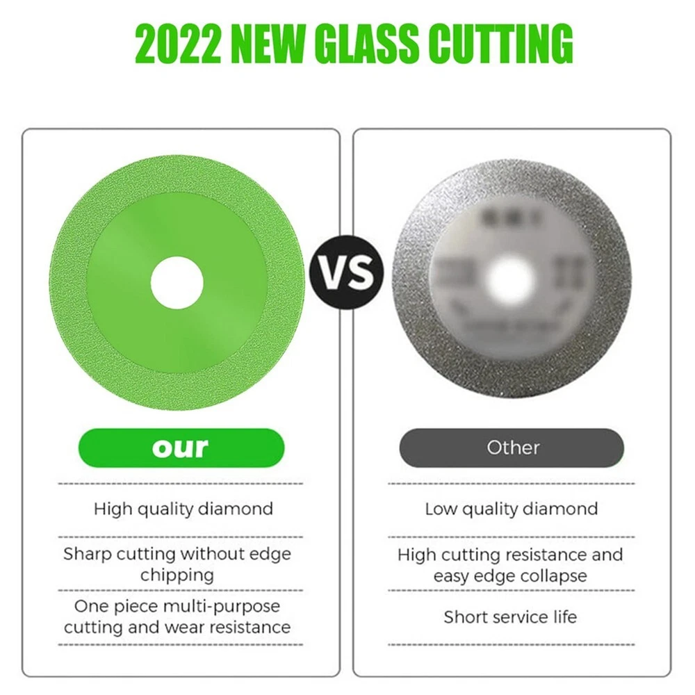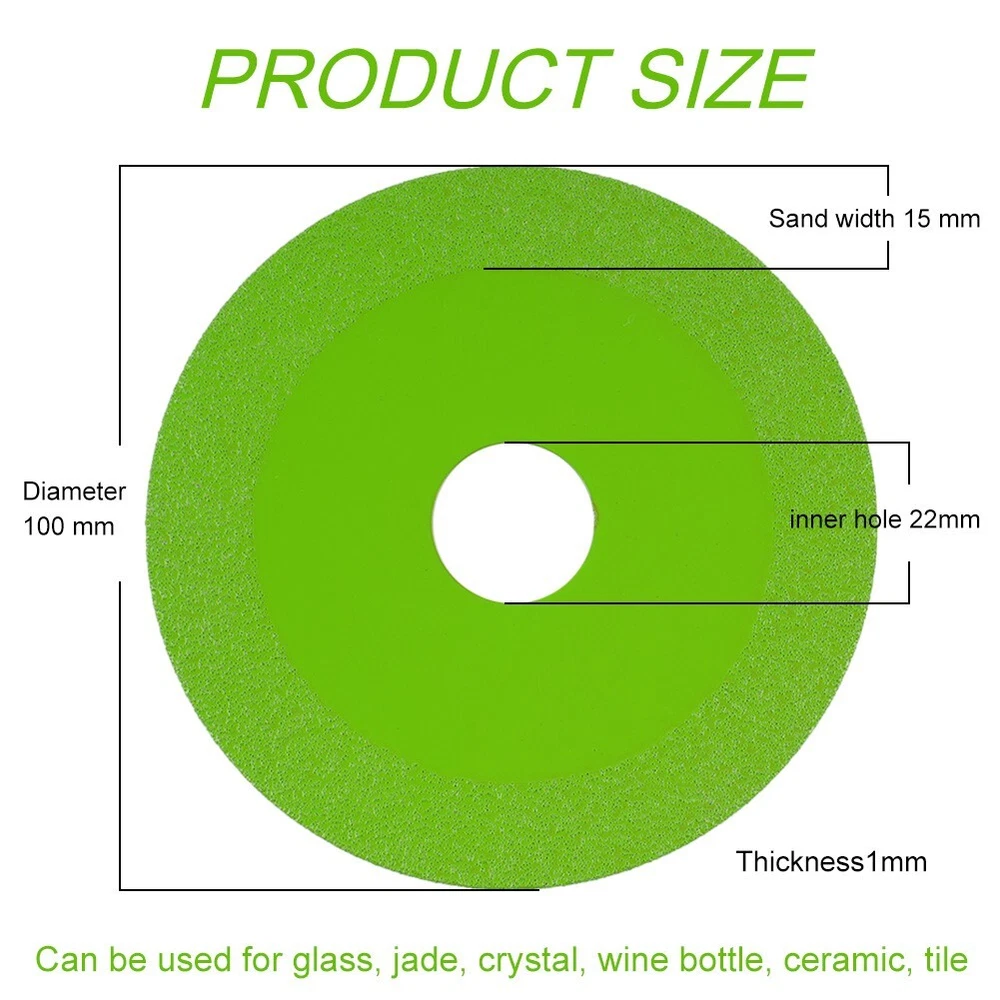 Product Description Features: *Fast and accurate cutting. *The diamond cutting blade is resistant to high temperature, which can reduce vibration and cut straighter and faster. It is and will not collapse. It is multi-purpose, with small incision and is resistant to cutting and wear. *Scope of application: For smooth cutting, chamfering and grinding of glass, jade, for Crystal, wine bottle, ceramic, ceramic tiles and other materials. *Chip free cutting: The 1mm ultra-thin saw blade does not damage the of the object, with uniform grinding force and good flatness. Low grinding noise, less dust, less debris, cutting first-class! *Easy to use: Designed for 100 angle grinder, it is easy to install and use, and can withstand the requirements of dry / wet cutting and long-time continuous cutting. *Advanced materials It adopts diamond high manganese steel, new brazing process, upgraded and improved blade, which is more convenient, safe and has a longer service life. Specifications: *Product name: Glass Cutting Disc *Material: Diamond high manganese steel *Optional Color: green, dark green, champagne *Diameter: approx. 100mm *Bore: approx. 22mm *: 1mm *Suitable for: 100 Type Angle Grinder *Quantity: 1pc Package included: 1 x Glass Cutting Disc Notes: 1. The real color of the item may be slightly different from the pictures shown on website caused by many factors such as brightness of your monitor and light brightness. 2. Please allow slight manual measurement deviation for the data. Payment Payment must be completed within 5 days. If you have any problems about payment, please contact us via ebay message. Delivery details We only ship to confirmed ebay Order addresses. Please comfirm that your Order address is in line with your shipping address. Please kindly note that the c ombined shipping is not provided because the shipping fee is calculated by weight. Also, the each additional item means exactly the the same color and size. It takes about 7 -15 working days to US; about 10-30 working days to other countries. Transit time may be a little delayed because of the bad weather and customs inspection . If you do not receive your item within 30 working days since payment finished, please contact us immediately for further assistance. Contact us We strive for 100% customer satisfaction! Positive Feedback is very important to us. If you have any questions, p lease feel free to contact us via "Ask seller a question" . We will reply your email within 24 working hours. On Nov 6, 2024 at 14:40:50 PST, seller added the following information: