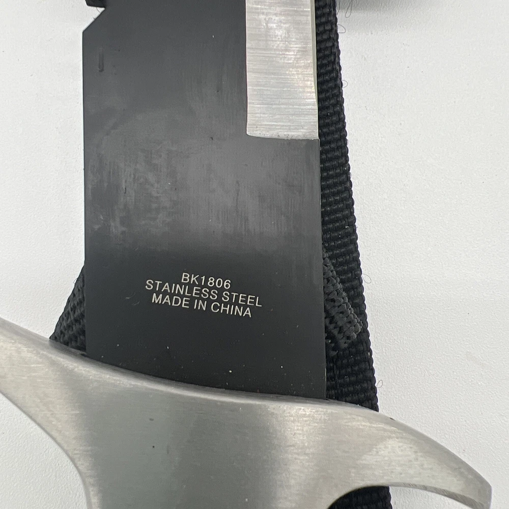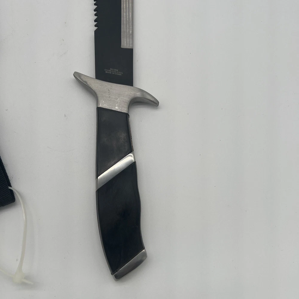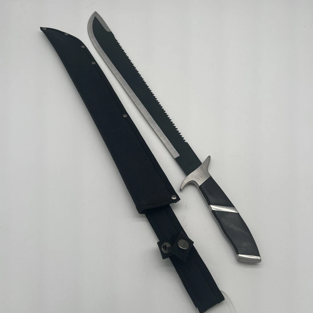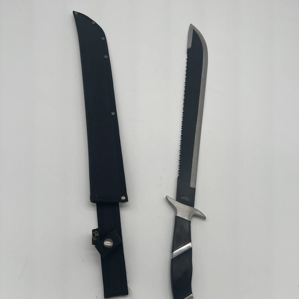 This 23" hunting/survival knife features a 17" black stainless steel blade with a combination edge, perfect for both hunting and survival situations. The handle is made of durable black plastic and comes with a convenient sheath for easy storage and transport. This knife is a must-have for any outdoor enthusiast or collector of modern fixed blade knives. It is manufactured in China and is a great addition to any collection of knives, swords, and blades.