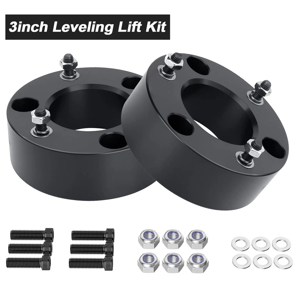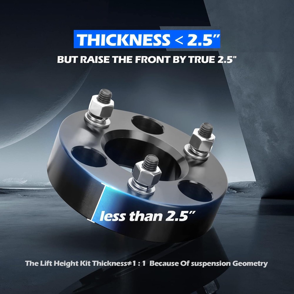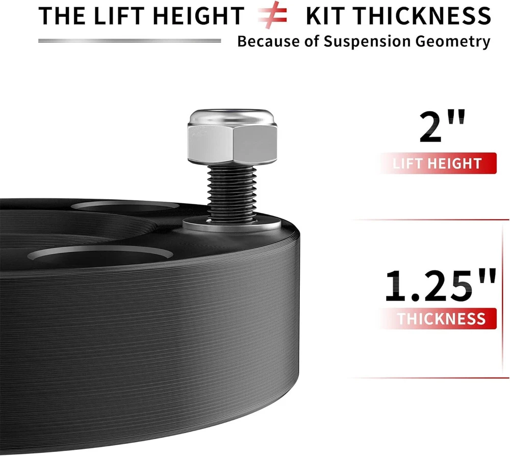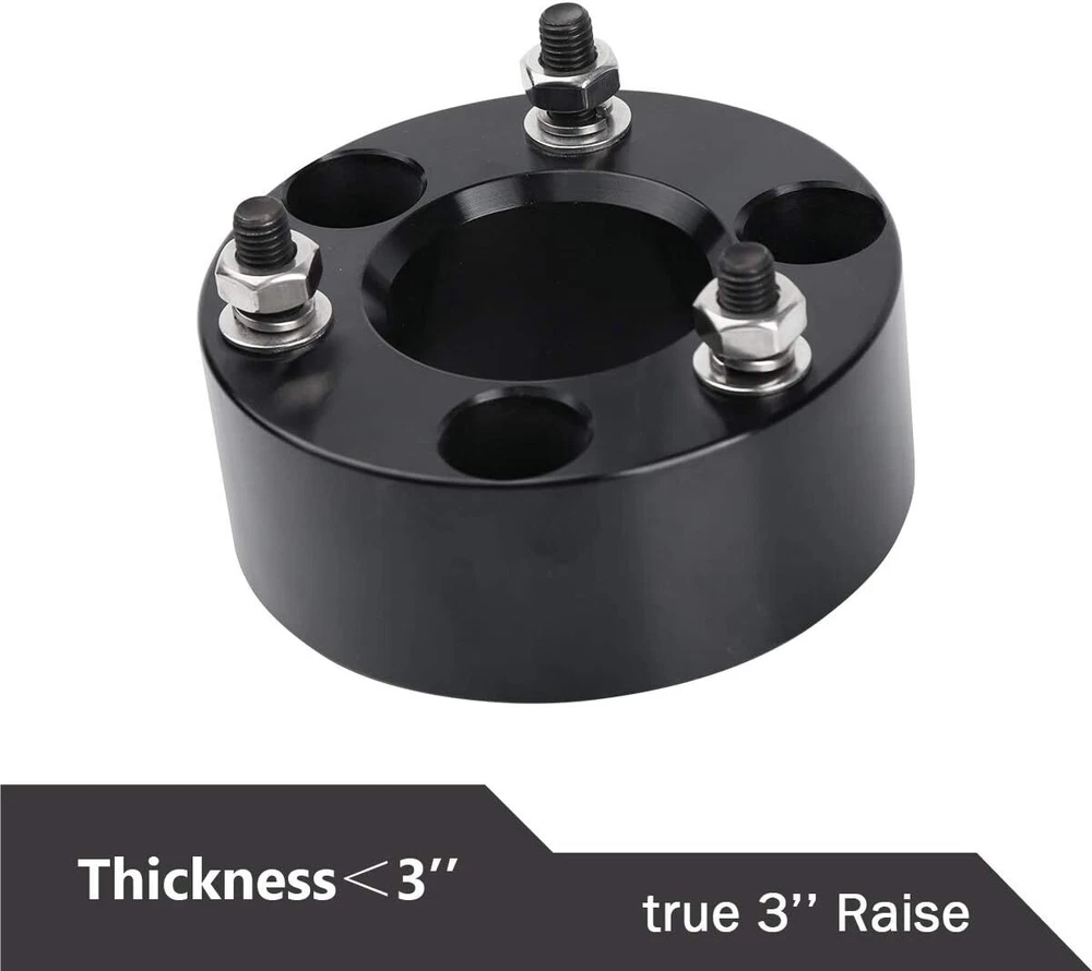 【Compatible】2006-2024 Ram 1500(4WD Only), 2005-2011 Dakota (2WD Only), 2006-2009 Mitsubishi Raider (2WD 4WD) - Not fit Mega Cab Models or Ram Rebel Models.Not compatible with trucks equipped with the Active-Level Four-Corner Air Suspension. 【Benefits】(1)CNC automatic processing ensure high accuracy and stability(0.02mm), Provide accurate hole position for easy installation (2)6061-T6 aluminum forged alloymaterial sturdy and durable (3)High quality pre-installed heat treated 12.9 grade studs 【Function】The kit provides unparalleled ground clearance, Used to conquer off-road obstacles,And allow the installation of larger rims and tires. Make your truck look more aggressive 【Easy Install】Installation can be completed within 1-2 hours, No cutting and drilling required and does not require strut/coil disassembly like other kits 【Note】Improve the front of your truck by 2/2.5/3 inches, bringing a perfect change in the appearance, performance and style of your truck. Because of suspension geometry,the ratio between lift height and kit thickness is not 1:1 Compatible with: 2006-2024 Ram 1500(4WD Only) 2005-2011 Dakota (2WD Only) 2006-2009 Mitsubishi Raider (2WD 4WD) Not fit Mega Cab Models or Ram Rebel Models. Not compatible with trucks equipped with the Active-Level Four-Corner Air Suspension. 2inch Leveling Lift Kit Specifications: Quantity: Two (2) Real thickness: 1.25" Raise height: 2" Material: 6061-T6 Aerospace Grade Aluminum with 12.9 grade studs 2.5inch Leveling Lift Kit Specifications: Quantity: Two (2) Real thickness: 1.6" Raise height: 2.5" Material: 6061-T6 Aerospace Grade Aluminum with 12.9 grade studs 3inch Leveling Lift Kit Specifications: Quantity: TWO (2) Real thickness: 2" Raise height: 3" Material: 6061-T6 Aerospace Grade Aluminum with 12.9 grade studs Important Note: Due to suspension geometry, the ratio of the lifting height to the thickness of the lift kit is not 1:1. Package: 2 x Front Leveling Lift Kit 1 Set Nut.