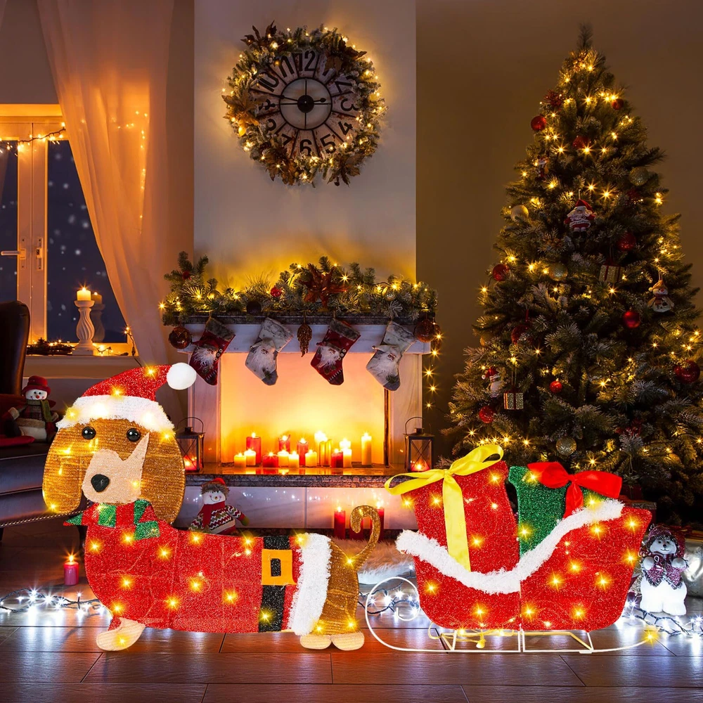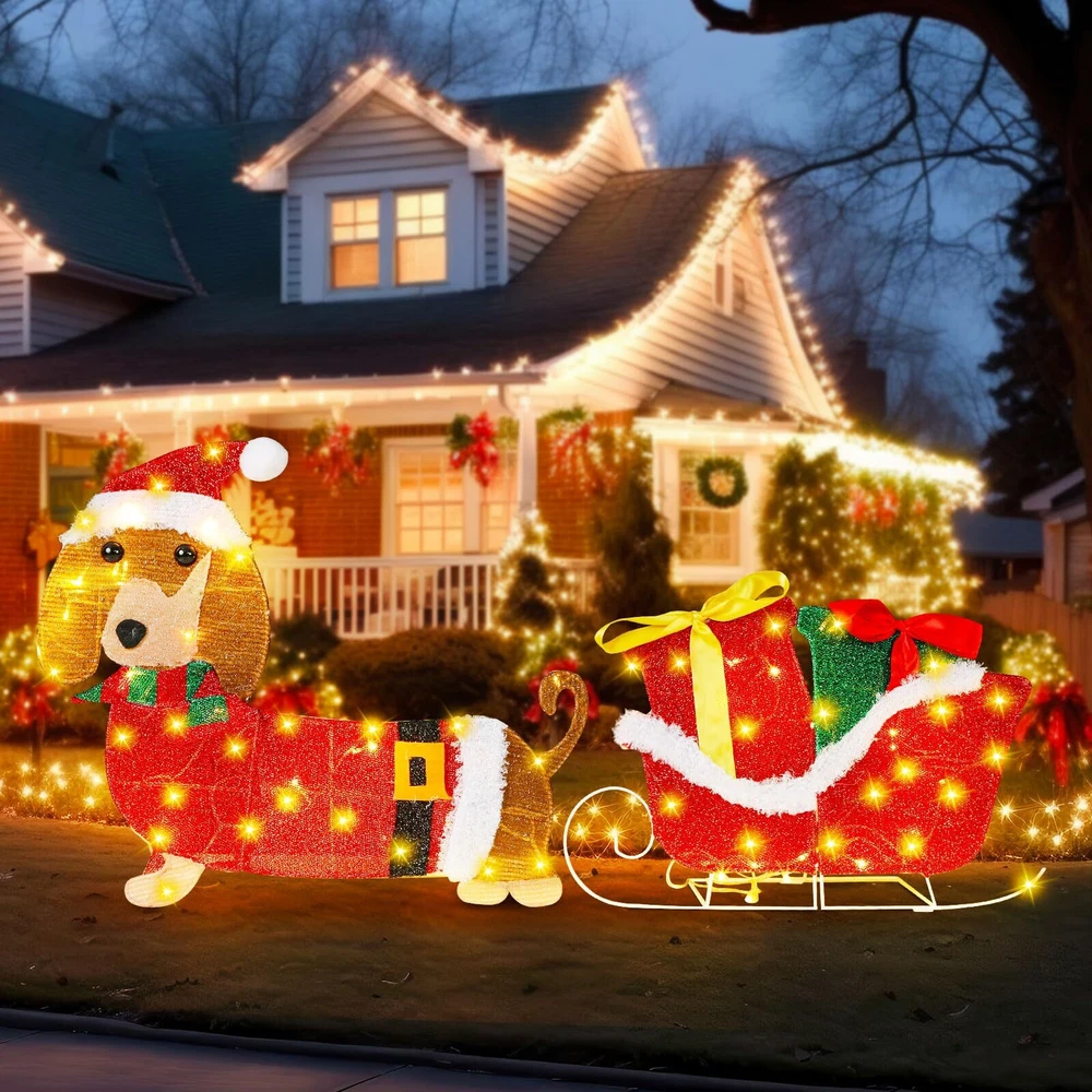 Features: Cute Christmas decorations: Christmas Dachshund decorations wearing green scarves, dragging sleds with gift boxes to welcome your guests, classic appearance effects and cute puppies add Christmas colors to your yard decoration, creating a joyful festive sense. Easy to install: The detachable design allows this outdoor Christmas decoration to be quickly installed in just three steps. But please be careful not to scratch the wire. Specifications: Material: metal Color: red, green, white Size: 23 inches (58 cm) Package includes: 1 x Lighted Christmas outdoor decoration set Notes: Manual measurement, please allow slight errors on size. The color may exist a slight difference due to different screen displays Lighted Christmas Outdoor Decoration Set: transform your holiday display with this lighted Christmas dog decoration set featuring a delightful 23 inches dachshund dog pulling a sleigh; This cheerful Christmas dachshund decoration adds a whimsical touch to your outdoor Christmas decor, welcoming guests with its festive charm. Note: The light string can be directly wrapped around the product, you can also prepare tape or adhesive tape to reinforce Ideal Size for Eye Catching Appeal: standing at an impressive 23 inches, this lighted Christmas dachshund sleigh decoration is designed to stand out in any yard or garden; The size makes it an ideal focal point for outdoor Christmas decorations, ensuring it captures attention and spreads holiday cheer to all who pass by Weather Resistant and Stability: constructed with sturdy metal brackets and lamp tube, this dog Christmas outdoor decoration is built to withstand winter weather; The durable materials ensure that your lighted Christmas yard decorations will remain vibrant and charming throughout the holiday season and beyond Glow Christmas Lawn Display: featuring glowing white lighting effects, this metal Christmas outdoor decoration brings warmth and joy to your festive displays; The illuminated Christmas yard decoration creates a magical sense, perfect for Christmas themed parties, winter holiday parties, nighttime festivities, family gatherings, indoor and outdoor decorations, or terrace decorations Multiple Scenes: classic appearance effects and cute puppy add Christmas colors to your yard decoration, creating a joyful festive sense; This dachshund Christmas outdoor decoration is perfect for a variety of outdoor settings, including yards, gardens, and porches; Ideal for holiday parties, family gatherings, or simply brightening up your neighborhood, this Christmas sleigh outdoor decoration adds a playful and festive touch to any outdoor space