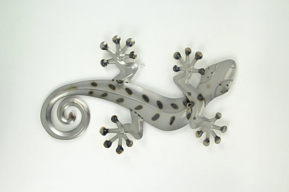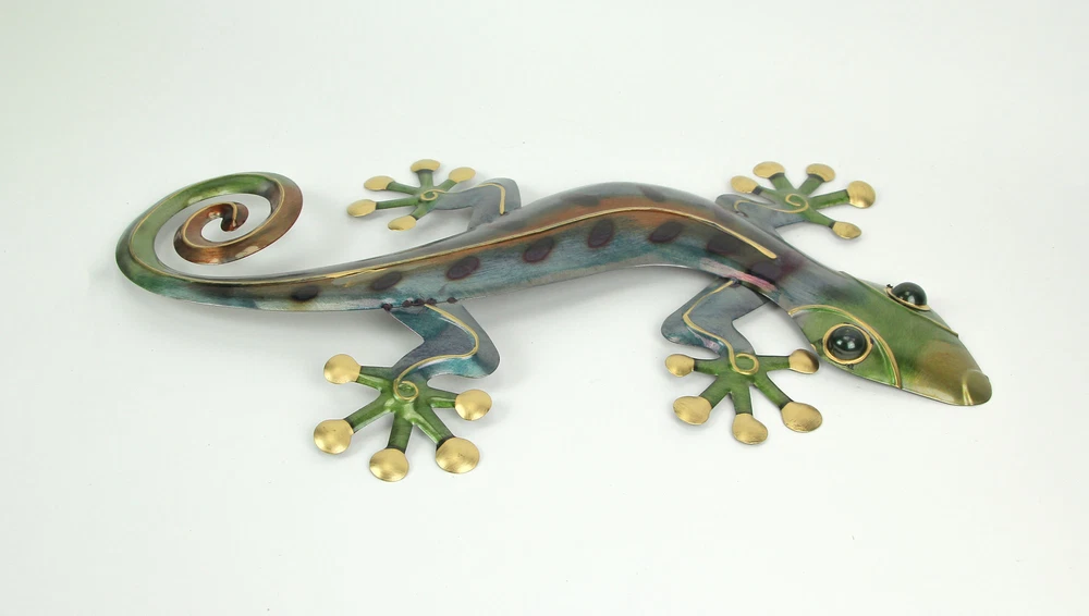 Add some friendly reptile charm to your home with this wall-hanging gecko sculpture. Creatively crafted from galvanized metal for years of maintenance-free display, the hand-painted blue, green, and brass finish give it a unique look that compliments just about any style. Measuring 11.25 inches long, 1.5 inches wide, and 23 inches high; it sports two built-in hangers, allowing you to display it horizontally or vertically with one or two screws (not included). Makes for a great accent or centerpiece in your living room, bathroom, kitchen, or bedroom; or hang it outside on a fence, near a pool or garden area. Our eBay Store About Us Add to Favorite Sellers 23 Inch Metal Gecko Sculpture Wall Hanging Art Home Decor Garden Decoration OVERALL SIZE - 11.25 Inches Long, 1.5 Inches Wide, 23 Inches High (Vertical Orientation) DURABLE MATERIAL - Crafted From Galvanized Metal For Years Of Maintenance Free Display UNIQUE STYLE - Hand Painted Blue, Green, And Bronze Accents Give This Lizard A One Of A Kind Look EASY INSTALL - Built-In Hanger For Quick And Simple Display With A One Or Two Screws, Depending On Orientation (not included) HOME DECOR - Great For A Themed Living Room, Bathroom, Kitchen, Or Bedroom; Or Outside On A Fence Add some friendly reptile charm to your home with this wall-hanging gecko sculpture. Creatively crafted from galvanized metal for years of maintenance-free display, the hand-painted blue, green, and brass finish give it a unique look that compliments just about any style. Measuring 11.25 inches long, 1.5 inches wide, and 23 inches high; it sports two built-in hangers, allowing you to display it horizontally or vertically with one or two screws (not included). Makes for a great accent or centerpiece in your living room, bathroom, kitchen, or bedroom; or hang it outside on a fence, near a pool or garden area. Product Details Color Multicolored Height 23 Length 11.25 Weight 0.75 LB