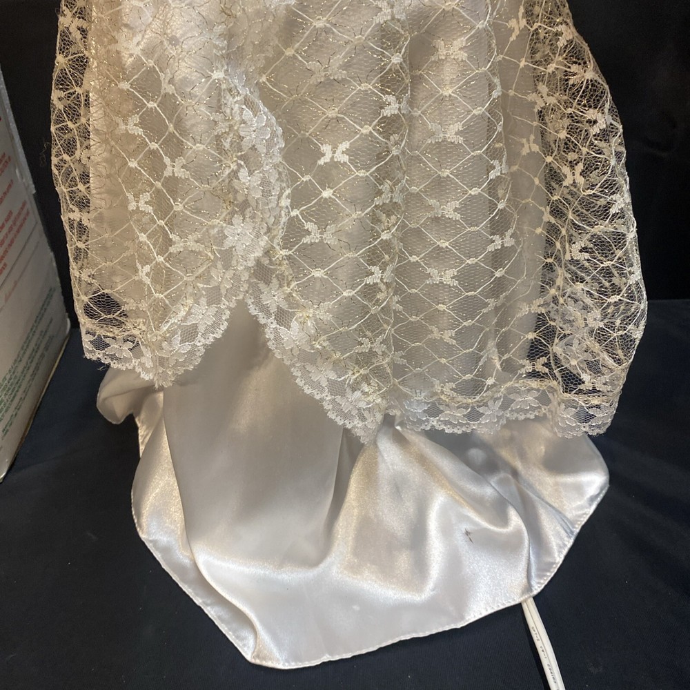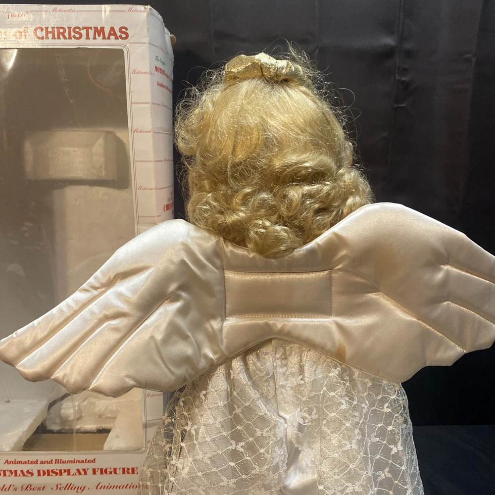 This Animated Angel figurine is the perfect addition to your Christmas decor. Measuring 23 inches tall, it features a cute and cuddly design that will bring joy to both children and adults alike. The figurine is made by Telco and is part of their Motion-ettes collection, which is perfect for those who love animation. The Christmas Angel figurine is designed with intricate details and comes with original packaging, making it a great gift for collectors and fans of all ages. Its light and motion features add an extra touch of magic to your holiday display. Celebrate the season with this adorable Animated Angel figurine, perfect for bringing a touch of animation to your Christmas decor. Box is damaged worn. Angel has some staining on wings and some on arms and bottom of dress. Angel works great !