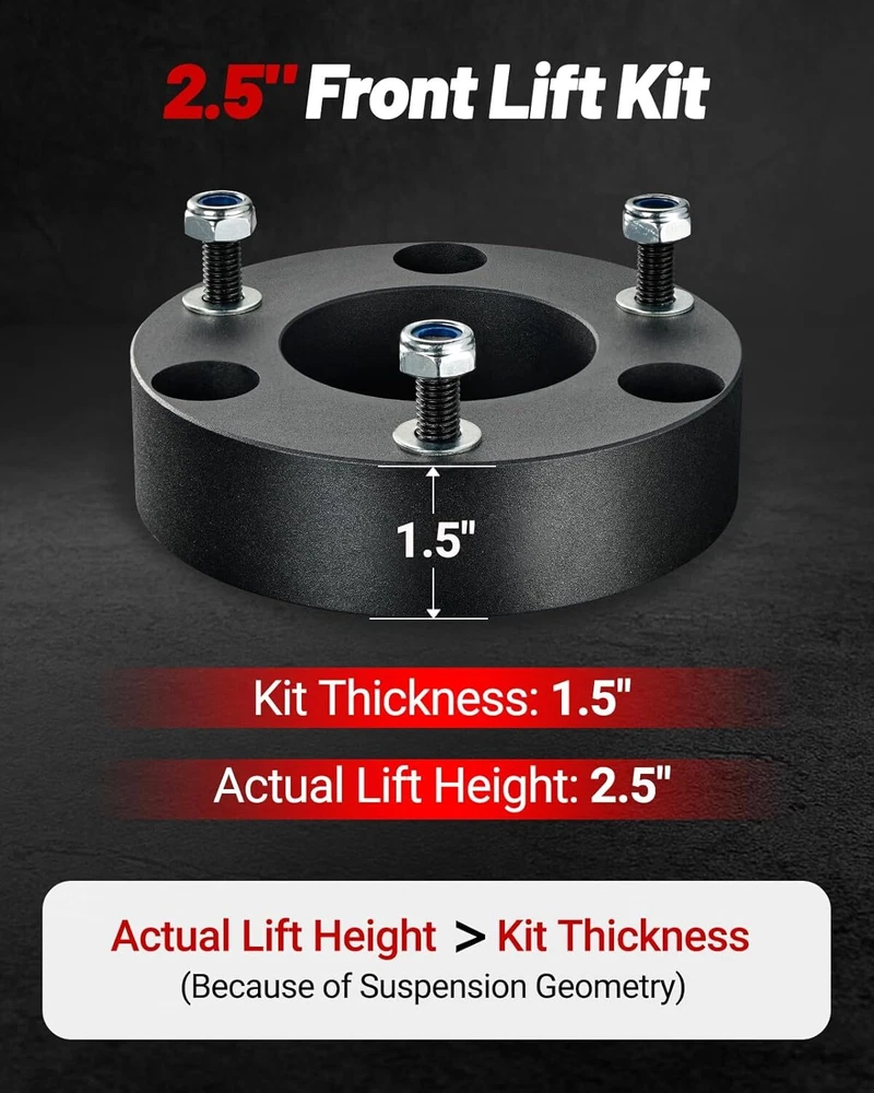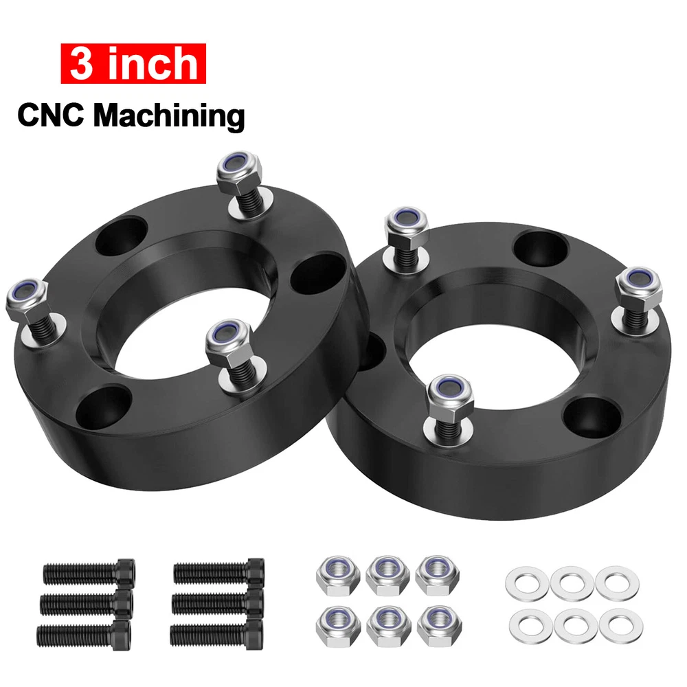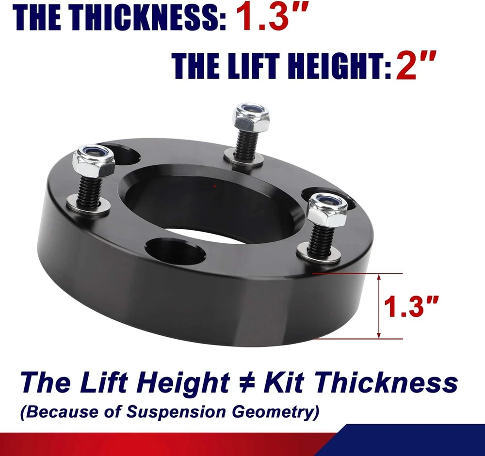 Compatible with: 2007 New Body Style &2008-2024 Silverado 1500 (2WD/4WD) 2007 New Body Style &2008-2024 Sierra 1500 (2WD/4WD) 2007-2022 GMC Sierra 2WD/4WD 2007-2022 Yukon 2WD/4WD 2007-2022 Tahoe 2WD/4WD Package: 2 x 2inch / 3inch Front Leveling Lift Kit (Optional) 2inch Leveling Lift Kit Specifications: Quantity: TWO (2) Real thickness: 1.3" Raise height: 2" Material: 6061-T6 Aerospace Grade Aluminum with 12.9 grade studs Lift the front by 2". Due to suspension geometry, the ratio of the lifting height to the thickness of the lift kit is not 1:1. 3inch Leveling Lift Kit Specifications: Quantity: TWO (2) Real thickness: 2" Raise height: 3" Material: 6061-T6 Aerospace Grade Aluminum with 12.9 grade studs Lift the front by 3". Due to suspension geometry, the ratio of the lifting height to the thickness of the lift kit is not 1:1. Compatible with: 2007 New Body Style &2008-2024 Silverado 1500 (2WD/4WD) 2007 New Body Style &2008-2024 Sierra 1500 (2WD/4WD) 2007-2022 GMC Sierra 2WD/4WD 2007-2022 Yukon 2WD/4WD 2007-2022 Tahoe 2WD/4WD Package: 2 x 2inch / 3inch Front Leveling Lift Kit (Optional)