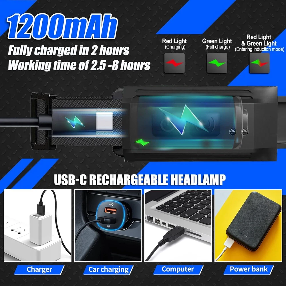 WARNING : California’s Proposition 65 Product Description 6PCS - 230° Wide Range LED Headlamp LED headlamp camping accessories is equipped with the latest intelligent sensors. Features a 230° wide beam and a super bright XPE light on the side, headlight can illuminate the viewing area without moving your head, and you can also use its spotlight to focus on specific areas. Previous page Next page 1 6 Light Modes 2 Product Details 3 USB Rechargeable 4 IPX4 Waterproof 230° Wide Beam & Long-Distance The new 230° wide beam headlight allows you to illuminate the viewing area without moving your head. It has a better area illumination, which can ensure your safety in the dark. Helmet light equipped with two micro-sensing devices, it is more convenient to use and frees your hands. Bright rechargeable headlamps flashlights light up our life! 230° Wide Illumination Lightweight & Comfortable gift for workers Rechargeable Headlamp Headlamp provides excellent 230° wide angle illumination and 1200 lumens. Lightweight Head Light Only 3.5 ounces, you will not feel tired even if you wear it for a long time. Head Lights for Forehead head lights for forehead suitable for almost all types of helmets. Best Headlamp headlamps for adults rechargeable are built to last. LED Headlight Small size design can be folded and removable to easily fit into your pocket. COB Strip Headlamp You can adjust the 4 clips for hardhat to make it perfectly fixed on the helmet. The Best Partner for Hard Hat Previous page Next page