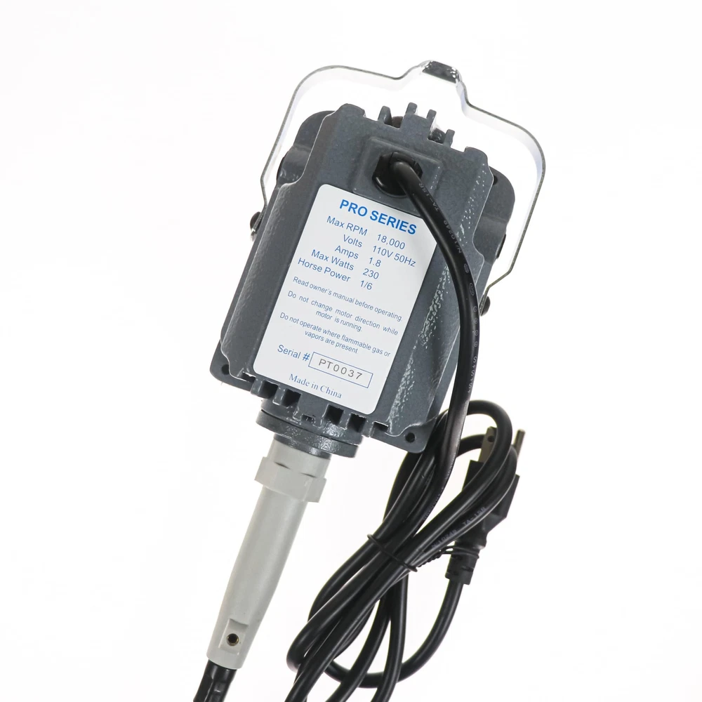 Packing List: 1.Main machine (including carbon brush) 2.Stepless adjustment foot switch 3.Handle 4.Flexible shaft 5.Spare flexible shaft inner core, original carbon brush, 2mm hexagonal wrench 1.The flexible shaft rotary tool has enough power and can work in forward and reverse. 2. It can work continuously for polishing, sanding, engraving, drilling and so on. 3.The handle has high concentricity and can be carved finely. 4. foot switch stepless adjustment, 500-18000 rpm can be controlled freely. 5.1/6hp motor (110V/60Hz)
