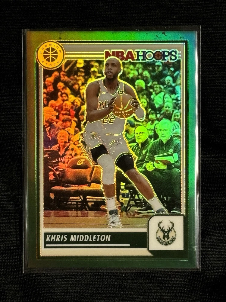 Elevate your basketball card collection with the 2023-24 NBA Hoops Premium Stock Khris Middleton Green Prizm card. This eye-catching variety features a short print run, making it a rare find for enthusiasts and fans of the Milwaukee Bucks star. The card, numbered 73, showcases Middleton in action, capturing the intensity and passion he brings to the court. This collectible is part of the 23-24 NBA Hoops set and is produced by renowned manufacturer Panini, ensuring a high-quality addition to your sports memorabilia. The Green Prizm parallel adds an extra layer of appeal, standing out with its vibrant color and premium finish. Whether you're a seasoned collector or just starting out, this card is a must-have for any NBA fan.