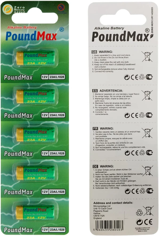 Store New Arrivals Add to Favorite View Feedback Contact 23A / L1028 Batteries 12V Alkaline Battery Combo Pack - 5 Count Description Item model number 23A / L1028 Unit Count 5.0 Count Style Single Battery Cell Composition Alkaline Product Dimensions 7 x 2 x 0.25 inches Item Weight 0.317 ounces Batteries 5 A batteries required. Recommended Uses For Product Watch Number of Batteries 5 A batteries required. Reliable long-lasting power Operating temperatures (-22°F to +140°f) Long shelf life. Used to power Garage Door Openers Remote Controls, Doorbells, Car Alarms Remote Controls, Burglar Alarms Remote Controls, Lighters, Keyless Entry Access Control Devices, Toys, and other Electronic Devices (Check your device for required battery model) 12 V voltage Equivalents: Energizer A23 12V Duracell MN21, GP23AE, 21/23, A23S, 23A, 23AE, V23GA, MN21B2PK, A23bpz, MN21, GP23A, LRV08, L1028, RVO8, MS21, E23A, K23A, 8LR932, 8LR23, VR22, 8F10R, EL12, 23GA PoundMax 5 Pack x Super Alkaline 23AE/A23/LRV08/MN21 12V Alkaline Security Batteries ABOUT US We offer the best prices around on high quality products. Our E-store includes media such as books, movies, music and games while offering electronics, toys, sporting apparel, clothing, tools, general home, garden items and more. SHIPPING We are always working hard to ensure your package arrives as soon as possible. Please understand that some factors like weather, high postal traffic, and the performance of shipping companies are outside of our control. We offer free shipping to the lower 48 states and ship within 2 business days of payment, usually sooner. We do not accept P.O. Boxes. Please provide a physical address. RETURNS We offer a 30-Day Return Policy on items which you are not completely satisfied with. You have the option for a full-refund or an exchange of the item. No returns are available on items shipped outside of the USA. PAYMENT We accept PayPal. CONTACT US This page content is yet to come Please ad us to your favorite seller and visit again later Thank You CUSTOMER SATISFACTION We try our very best to make sure every customer is completely satisfied. If there's a problem, message us! We're happy to help.