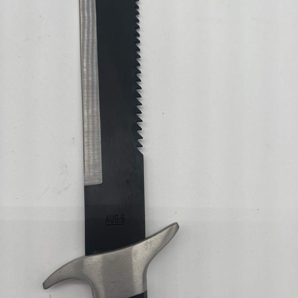 This 23" hunting/survival knife features a 17" black stainless steel blade with a combination edge, perfect for both hunting and survival situations. The handle is made of durable black plastic and comes with a convenient sheath for easy storage and transport. This knife is a must-have for any outdoor enthusiast or collector of modern fixed blade knives. It is manufactured in China and is a great addition to any collection of knives, swords, and blades.
