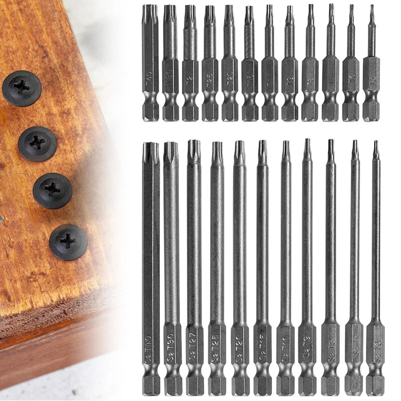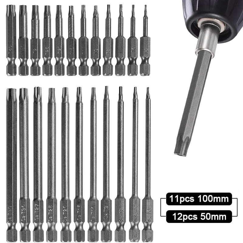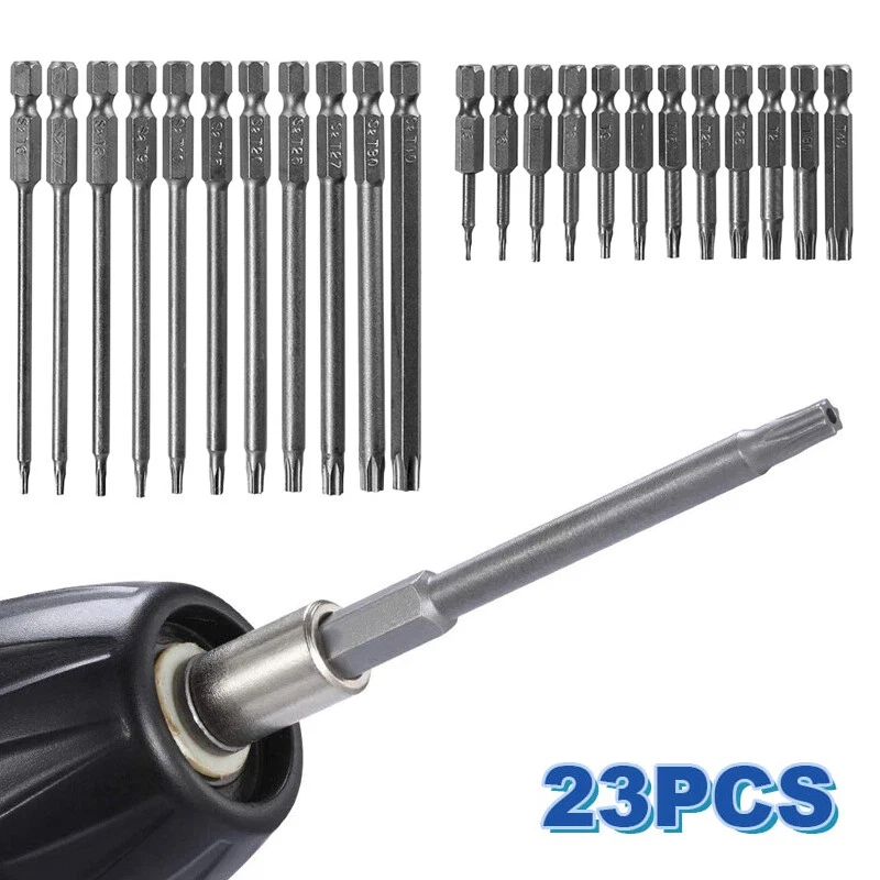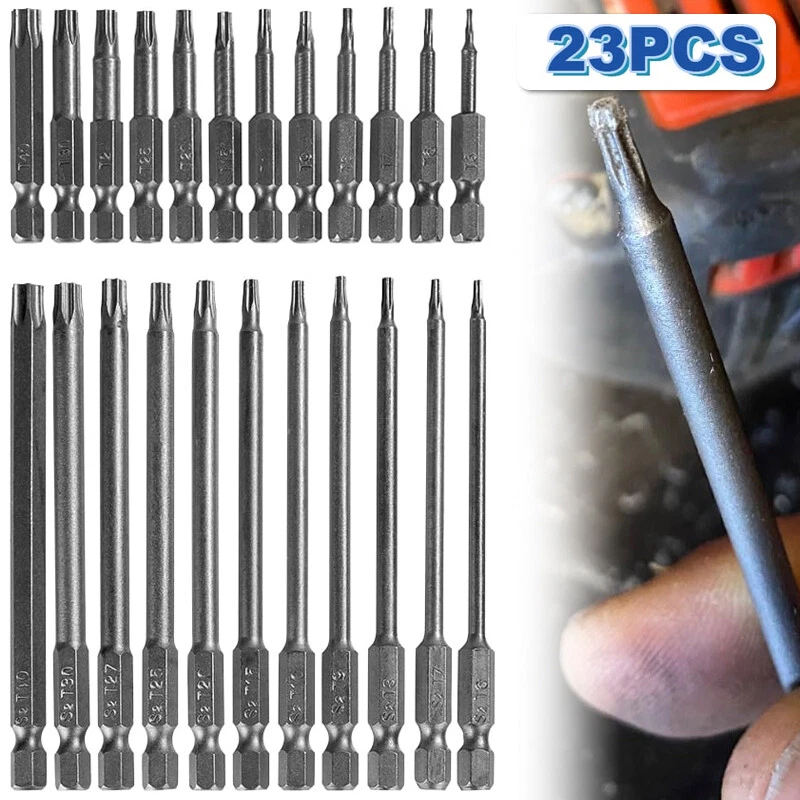 Product D escription 23PCS Torx S crewdriver Drill S et 1/4" H ex S hank 50mm 100mm Product Characteristics High Q uality I ndustrial G rade M aterials: The Torx screwdriver bit set is made of high-quality S2 alloy steel with a special heat treatment process to increase the torque and full hardness of the bit, and it has good wear resistance and is more durable than regular Torx screwdriver bits. High P recision M achining T echnology: The product adopts CNC precision machining technology to ensure the accuracy of the product, so that the drill can withstand the instantaneous impact of large torque pneumatic tools, which greatly improves the service life of the product itself. Magnetic: The magnetic Torx screwdriver drill set can quickly and easily adsorb screws, greatly improving your work efficiency. Repeated use does not diminish the magnetic force. Suitable F or A V ariety O f P ower T ools: The 1/4" hexagon handle allows it to accommodate a wide range of power tools, allowing you to quickly change chucks. Suitable for electric drill, air drill, electric screwdriver, manual screwdriver and so on. A W ide R ange O f U se S cenarios: It can be widely used in automobile, home, industrial and other maintenance, and can also be used in other screw drives. Mechanical P rinciple D esign: Strong torque, high torque, after contact with the screw head, the impact reaction force generated by the impact screwdriver is absorbed by the torque part, effectively preventing the damage of the tool head. Straight and concentric, tight bite. Product Specification Status: 100% Brand New Material: S2 A lloy S teel Shank T ype: 6.35mm/ 1/4" H ex S hank 12PCS: Length: 1.97"/50mm Cutter H ead S pecifications: T5, T6, T7, T8, T9, T10, T15, T20, T25, T27, T30, T40 11PCS: Length: 3.94"/100mm Cutter H ead S pecifications: T6, T7, T8, T9, T10, T15, T20, T25, T27, T30, T40 Package Included 12PCS × 50mm Torx Screwdriver B it 11PCS × 100mm Torx Screwdriver B it Attention P lease 1. Please allow manual measurement error of 1-3mm. Make sure you don't mind before you buy. 2. Due to lighting effects, brightness contrast Settings of the display, etc., there may be some slight differences in the hue of the picture and the actual item, please make sure you don't mind.
