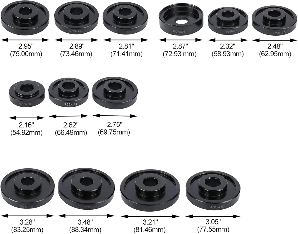 Store New Arrivals Add to Favorite View Feedback Contact 23Pcs FWD Front Wheel Drive Bearing Adapters Puller Press Installer Removal Tool Kit Description Country of Origin China Manufacturer Part Number KC-0131 Item Weight 21.8 pounds Product Dimensions 5.91 x 3.94 x 4.72 inches Wheel bearing press kit is for fast & effective front-wheel drive bearing removal and installation. Easily replaces wheel bearings while keeping the steering knuckle and strut assembled on the vehicle. Wheel bearing removal tool is designed to work with the steering knuckle and strut assembly still on the vehicle, eliminating the need for front end alignment after service while reducing damage to the hub and bearings. This set includes 12 bushing adapters, 4 sleeves with sleeve plates, a wheel hub installer and more. Different sizes and specifications meet your diversified needs Heavy-duty carbon steel construction with black anodic oxidation coating for ultimate rust-resistant performance Bearing press kit works for most front-wheel-drive American domestic and imported cars and small pickup trucks. Product Description FWD Front Wheel Drive Bearing Adapter Press Installer Removal Tool Easily replaces wheel bearings while keeping the steering knuckle and strut assembled on the vehicle. For servicing all the most common sizes, this set makes removing and installing bearings, bushes, and seals a breeze This nearly universal bearing kit is compatible with almost all front-wheel-drive cars and light trucks both import and domestic Sleeve [A-D]: A - 4.03"(102.25mm) O.D. x 2.55"(64.65mm) Length B - 3.61"(91.68mm) O.D. x 2.55"(64.65mm) Length C - 3.41"(86.66mm) O.D. x 2.55"(64.65mm) Length D - 3.00"(76.23mm) O.D. x 2.55"(64.65mm) Length Washer [E]: E - 1.52"(38.6mm) O.D. & 0.91"(23mm) I.D. Bushing [F-Q]: F - 2.16"(54.92mm) O.D. x 0.55"(14.01mm) Thickness G - 2.32"(58.93mm) O.D. x 0.55"(14.01mm) Thickness H - 2.48"(62.95mm) O.D. x 0.55"(14.01mm) Thickness I - 2.62"(66.49mm) O.D. x 0.55"(14.01mm) Thickness J - 2.75"(69.75mm) O.D. x 0.55"(14.01mm) Thickness K - 2.81"(71.41mm) O.D. x 0.55"(14.01mm) Thickness L - 2.89"(73.46mm) O.D. x 0.55"(14.01mm) Thickness M - 2.95"(75.00mm) O.D. x 0.55"(14.01mm) Thickness N - 3.05"(77.55mm) O.D. x 0.55"(14.01mm) Thickness O - 3.21"(81.46mm) O.D. x 0.55"(14.01mm) Thickness P - 3.28"(83.25mm) O.D. x 0.55"(14.01mm) Thickness Q - 3.48"(88.34mm) O.D. x 0.55"(14.01mm) Thickness Wheel Hub Installer [R]: R - 2.87"(72.93mm) O.D. x 0.79"(20.02mm) Thickness Sleeve Plate [S-T]: S - 4.03"(102.38mm) O.D. x 0.71"(18.03mm) Thickness T - 3.39"(86mm) O.D. x 0.71"(18.03mm) Thickness Sliding Forcing Screw [U]: U - 1.26"(31.95mm) Hex x 8.27"(210mm) Length Sliding Forcing Nut [V]: V - 1.25"(31.81mm) Hex x 2.36"(60mm) & 0.78"(19.75mm) I.D. ABOUT US We offer the best prices around on high quality products. Our E-store includes media such as books, movies, music and games while offering electronics, toys, sporting apparel, clothing, tools, general home, garden items and more. SHIPPING We are always working hard to ensure your package arrives as soon as possible. Please understand that some factors like weather, high postal traffic, and the performance of shipping companies are outside of our control. We offer free shipping to the lower 48 states and ship within 2 business days of payment, usually sooner. We do not accept P.O. Boxes. Please provide a physical address. For shipping outside of the continental USA, we only use eBay's Global Shipping Program.The item is shipped to KY and then sent to the rest of the world. International customers are responsible for all duties and taxes. Continue to check out in order to calculate costs for shipping the item to your country. Messages regarding eBay's Global Shipping Program MUST be directed at eBay EXCLUSIVELY. RETURNS We offer a 30-Day Return Policy on items which you are not completely satisfied with. You have the option for a full-refund or an exchange of the item. No returns are available on items shipped outside of the USA. PAYMENT We accept PayPal. CONTACT US This page content is yet to come Please ad us to your favorite seller and visit again later Thank You CUSTOMER SATISFACTION We try our very best to make sure every customer is completely satisfied. If there's a problem, message us! We're happy to help. WE ACCEPT Copyright © 2021 AutoDS. | All Rights Reserved