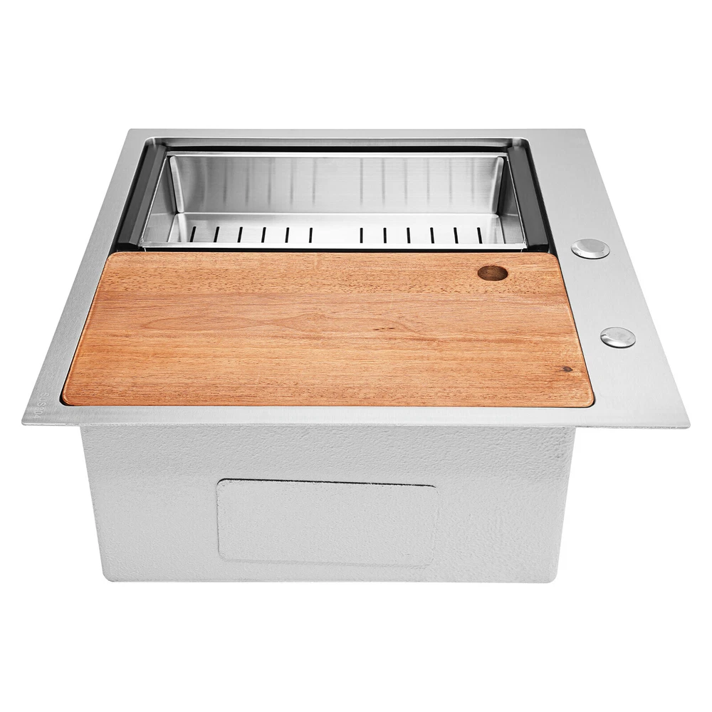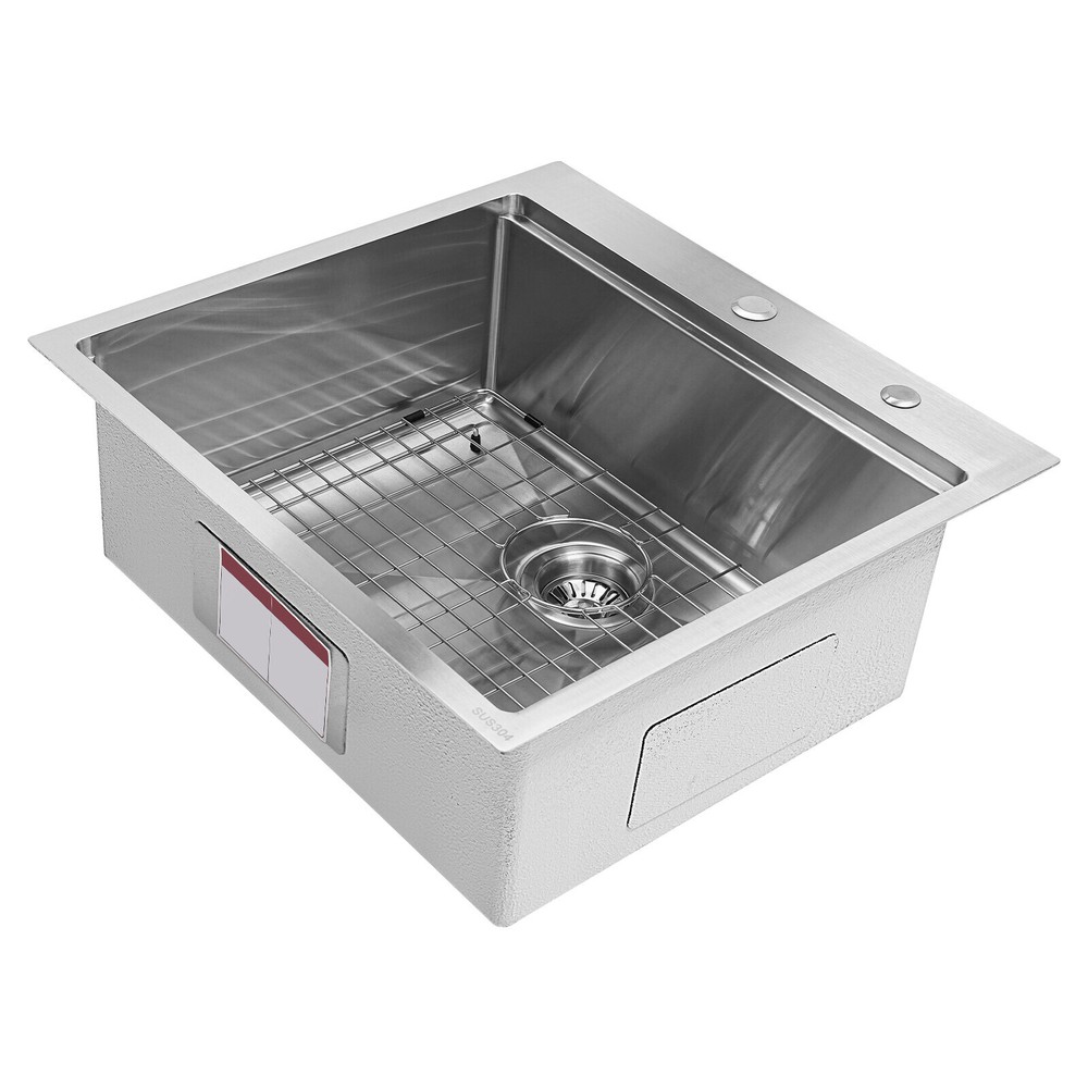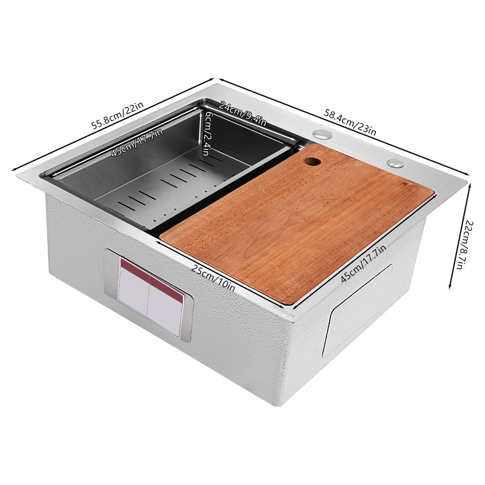 Application It can be widely used in homes, restaurants, laundries, basements, bars, kitchens, food trucks, dessert stores, coffee shops, hotels, garages, gardens, etc. for washing dishes and cutting vegetables and fruits. Specification Material: 304 Stainless Steel Color: Silver Style: Modern Process: Brushed Shape: Rectangular Mount Type: Topmount, Undermount, Flushmount Assembly Required: Yes Thickness: 100mm/0.39in Drain Hole Diameter: 8.9cm/3.5in Cutting Board Size: 45*25cm/17.7*10in Drainage Frame Size: 45*24*6cm/17.7*9.4*2.4in Product Size: 58.4*55.8*22cm/23*22*8.7in Package Size: 63*50*28cm/24.8*19.69*11.02in Gross Weight: 11kg/24.25lbs Net Weight: 10.2kg/22.49lbs Kitchen Sink 23 x 22 Inch Drop-in Bar Sink Stainless Steel Topmount Kitchen Sink welcome~ Description Made of high-quality 304 stainless steel, this kitchen sink is exquisitely crafted, wear- resistant , and corrosion- resistant . Its enlarged and deepened sink not only alleviates the splashing problem but also increases space utilization for cleaning numerous cookwares. The design with a cutting board, bottom rinse grid, roll-up dish drying rack and drainage frame allows you to wash and cut fruits and vegetables simultaneously, with which you can enjoy a more convenient life. Key Features Strong and Durable: Made of premium 304 stainless steel through the brushed process, it is corrosion and heat- resistant and will remain as good as new for a long time, even in the face of frequent daily use and all kinds of kitchen utensils collision. Space Optimization: The workstation sink is designed to hold the cutting board and drainage frame on a single track, maximizing the available space on the countertop. Large Capacity: Its large size ( 23*22in ) allows you to clean large amounts of plates, dishes, and pots, and wash fruits, and vegetables at one time without splashing, saving time. Life Assistant: This sink with a cutting board, bottom rinse grid, roll-up dish drying rack and drainage frame cleverly combines washing and meal preparation functions, allowing you to enjoy a convenient life. Invisible and Beautiful: It supports three mount types: top mount, flush mount, and under mount, which will not affect the aesthetics when the sink is flush with the countertop, and the smooth lines and low-key silver-colored appearance can also add a touch of simplicity and elegance to the kitchen. Hassle-free Cleaning: The brushed surface is not easy to leave marks, you can remove surface dust and grease by wiping with a damp cloth and detergent (not included). User Friendly: The rubber mute mat can effectively reduce the noise generated by the faucet water release and the collision of dishes, creating a quiet kitchen environment. The anti-condensation coating effectively prevents excessive temperature differences and protects the cabinet from moisture. Rapid Drainage: The X-shaped water guidelines and enlarged 3.5-inch drain hole help drain water quickly. The equipped drainage frame also ensures that the kitchen is dry and hygienic. Customer Service: We aim to provide quality products and services. If you have any problems, please feel free to contact us. We will reply to you and solve the problem for you as soon as possible. Details Rounded Corners: They are not easy to leave hygiene blind spots, making it convenient for you to clean the sink. Bottom Rinse Grid: With protective covers, it can prevent scratches on the kitchen utensils and sink. Utensils can be placed on the rinse grid for fast drainage. Roll-up Dish Drying Rack: It facilitates you to quickly clean your cookware and drain the bowl quickly to prevent bacteria growth. Hanging Hole: It is convenient for you to hang the cutting board freely in your kitchen after use to keep it dry and hygienic. Application It can be widely used in homes, restaurants, laundries, basements, bars, kitchens, food trucks, dessert stores, coffee shops, hotels, garages, gardens, etc. for washing dishes and cutting vegetables and fruits. Specification Material: 304 Stainless Steel Color: Silver Style: Modern Process: Brushed Shape: Rectangular Mount Type: Topmount, Undermount, Flushmount Assembly Required: Yes Thickness: 100mm/0.39in Drain Hole Diameter: 8.9cm/3.5in Cutting Board Size: 45*25cm/17.7*10in Drainage Frame Size: 45*24*6cm/17.7*9.4*2.4in Product Size: 58.4*55.8*22cm/23*22*8.7in Package Size: 63*50*28cm/24.8*19.69*11.02in Gross Weight: 11kg/24.25lbs Net Weight: 10.2kg/22.49lbs Package Included 1* Stainless Steel Kitchen Sink 1* Cutting Board 1* Bottom Rinse Grid 1* Strainer 1* Drainage Frame 1* Roll-up Dish Drying Rack All Accessories for Use Notes Please check the style and size before purchasing. Please do not scratch its surface with sharp objects to prolong its service life. If you want to get a better installation effect, we suggest you ask professional workers to install it. Please allow the slight color difference caused by the shooting light and 1-3cm error due to manual measurement and make sure you do not mind before ordering. Payment Delivery details Terms of sales About us Contact us Payment We accept ebay payment 。 Fees such as import duties, taxes are not included in the item price or shipping costs. These charges are the buyer's responsibility. Delivery details Shipping: 2-9 working days to: USA Terms of sales We maintain high standards of excellence and strive for hundred percent customer satisfaction. Feedback is very important to us. We hope that you contact us immediately before you give neutral or negative feedback, so that we can address your concerns. It is impossible to address issues if we do not know about them! About us Your satis faction is our ultimate goal. We work hard to earn your trust and future business. Our certified technicians have tested each item before shipping. The unit comes with 1 year limited warranty on all manufacturing defects. a) If you receive a defective item, you may return it or ask for a discount. Please contact us within 14 days afte