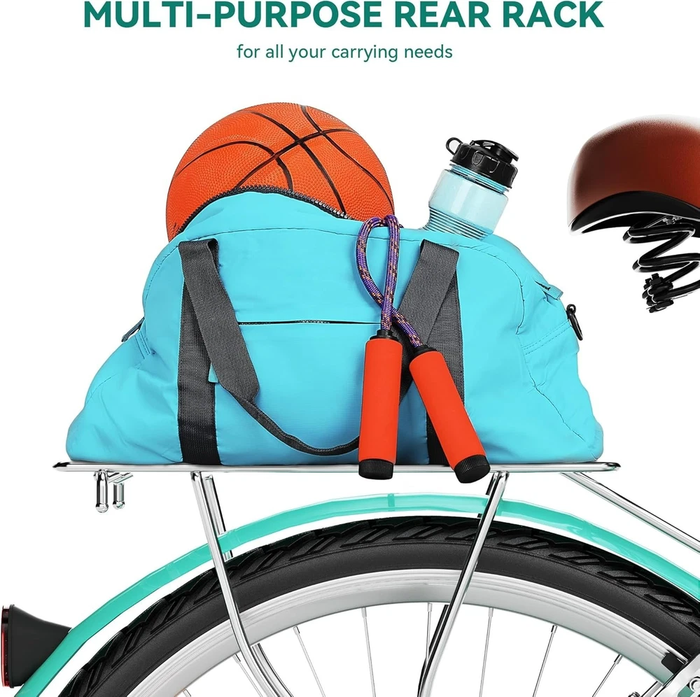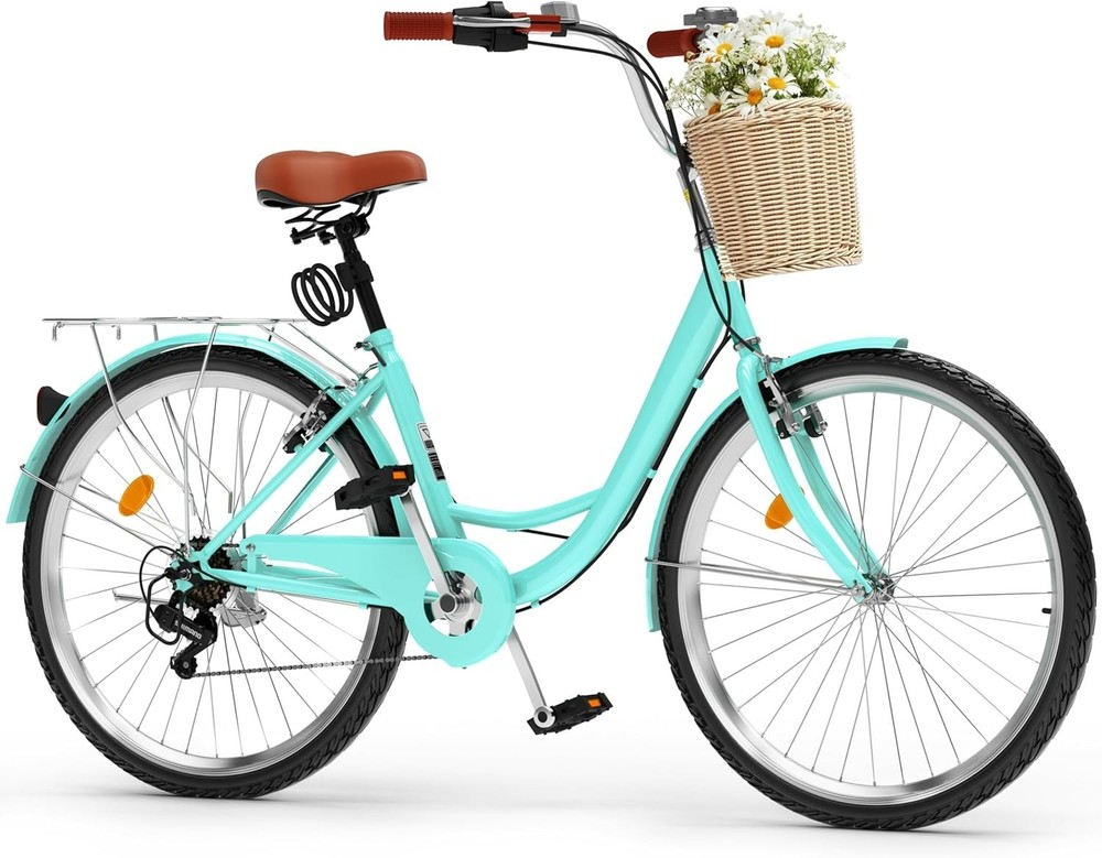 Assembly Required: Yes gtin13: Does Not Apply Bike Type: Cruiser Tire Type: Standard Tires Size: 24" Wheel/7 Speed Custom-Built: No Package Weight: 43 Pounds Number of Speeds: 7 Speed Is Autographed: No Brake Style: Linear Pull Age Range (description): Adult Department: Women Frame Material: Carbon Steel Bicycle Gear Shifter Type: Trigger Gear Change Mechanism: Derailleur Gears Power Source: Human Item Weight: 43 lb Suggested Users: Unisex-adult Item Width: Womens Cruiser Bike Wheel Material: Carbon Steel UPC: Does Not Apply Suspension Type: Dual Shifter Style: Trigger Shifter Frame Size: 24 in Frame Number: 197839622616 Material: Carbon Steel Derailleur Configuration: Rear Brake Type: Linear Pull Skill Level: Beginner Item Length: Womens Cruiser Bike Theme: Beach Handlebar Type: Cruiser Bar Special Feature: Adjustable Brand: Unbranded Color: Mint Green Item Package Dimensions L X W X H: 49.21 X 28.15 X 8.26 Inches Wheel Size: 24 in Included Components: Basket, Lock, Pump, Reflectors, Tool Kit Item Height: Womens Cruiser Bike Features: Adjustable Seat, Basket, Lock, Pump, Reflectors, Tool Kit Style: 24" Wheel/7 Speed Bicycle Drivetrain Type: Derailleur Specific Uses For Product: Beach