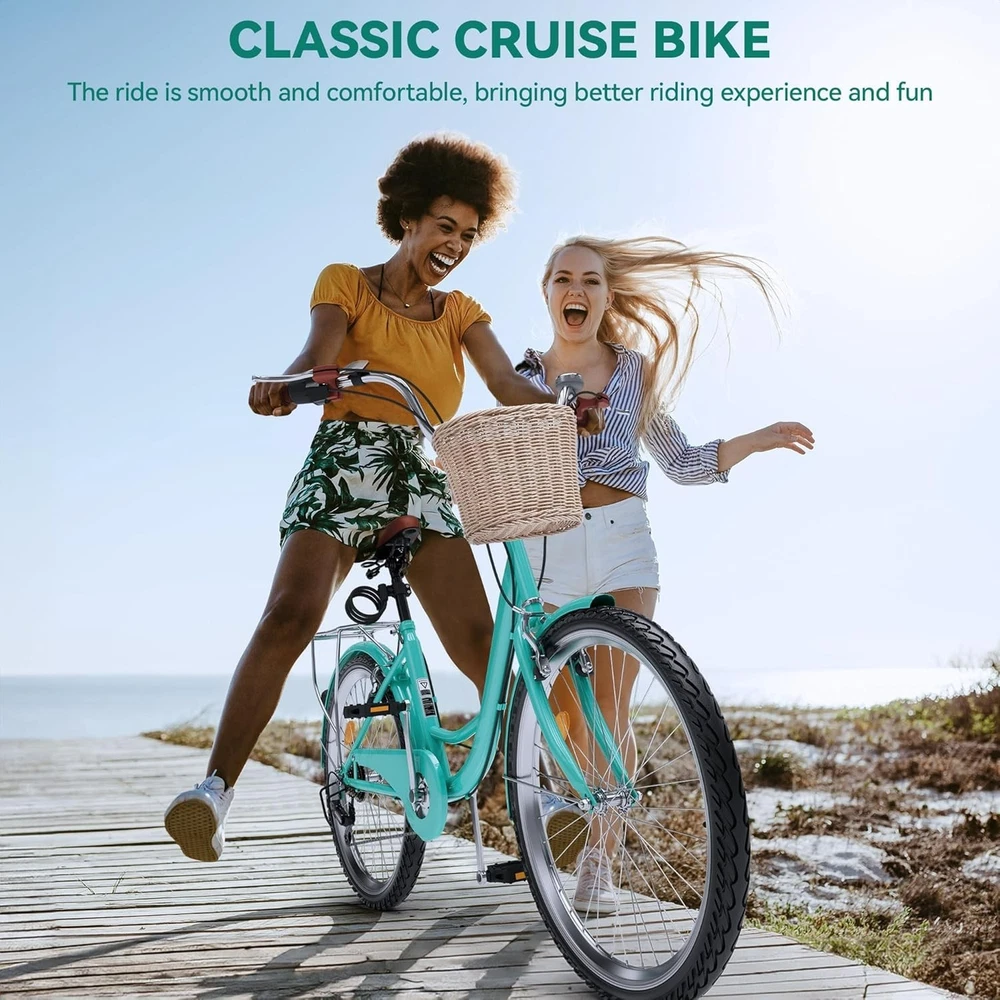 24 & 26 Inch Women's Beach Bike - Carbon Steel Frame & User-Friendly Assembly ‹ › ‹ › ‹ › ‹ › ‹ › ‹ › ‹ › ‹ › 24 & 26 Inch Women's Beach Bike -Carbon Steel Frame & User-Friendly Assembly Classic Beach Cruiser Bike: This cruiser bike for women boasts a sleek, curved frame design that artfully combines style and simplicity, creating a classic and understated appearance that's perfect for beachside strolls or casual rides. 7-Speed Design: Equipped with a 7-speed derailleur and user-friendly shifters. Effortlessly tackle long-distance journeys and moderate inclines. Versatile for various terrains, providing enhanced safety and control. Comfortable Riding Experience: Promotes a natural, relaxed riding position for ease and comfort. Adjustable seat height for personalized comfort levels. Tire: Features tires with double-layered rims and anti-slip treads. Reliable performance and enhanced stability for a smooth, enjoyable ride. Convenient Assembly: Majority of components pre-assembled for quick setup. Assemble your bike in approximately 30 minutes for a hassle-free experience. Why Choose Our Women's Beach Bike? This 24 & 26 Inch Women's Beach Bike is the epitome of elegance and functionality, merging a classic design with modern features that promise a superb biking experience. With a user-friendly assembly process, you can be riding the waves of tranquility in no time. Enjoy the sensation of cruising comfort with a bike that’s versatile enough to handle any of your adventures. Don't miss your chance to elevate your seaside lifestyle - order your Classic Beach Cruiser Bike today and embrace the joy of effortless riding! Shipping Free & Fast Shipping - We offer free shipping to most of the USA with a normal delivery time of 3-7 days. However, due to the current situation, additional delivery time (up to 3 weeks) may be required for some items. Alternative Carriers - We may use alternative carriers (e.g. USPS, FedEx, UPS, etc.) to ensure your package arrives safely and on time. Due to the use of multiple carriers, we are unable to provide a tracking number automatically. Handling Time - Orders are processed and shipped within 1-2 business days of receiving cleared payment. Shipping Restrictions - Shipping to Alaska, Hawaii, Puerto Rico, Guam, and other US territories may incur shipping charges or delivery restrictions. Please contact us before ordering, or your order can be refunded/cancelled. State Restrictions - There may be restrictions based on your state of purchase. For example, certain items may not be shipped to California due to state regulations. Contact for Tracking Updates - If you require tracking updates or have any concerns about the delivery of your order, please feel free to contact us, and we will be happy to assist you. Return 30-Day Hassle-Free Returns - We want you to be completely satisfied with your purchase. If you are not, you can return the item within 30 days of receiving it for a full refund or exchange. Easy Return Process - To start a return, simply contact us and we will provide you with a prepaid return shipping label and detailed instructions. Restocking Fee - There are no restocking fees for returns. However, the buyer is responsible for return shipping costs if the return is not due to a seller's error. Refund Processing Time - Refunds will be processed within 5 business days of receiving the returned item in its condition. Payment We accept all major credit cards, PayPal, and Apple Pay for your convenience. Your payment information is secure and encrypted to ensure a safe and seamless transaction. Please complete your payment within 3 days of purchase to avoid any delays in shipping. Feedback Your feedback is extremely important to us. We strive to provide the best products and customer service possible. If you are satisfied with your purchase, please take a moment to leave us a positive review. If you have any concerns or issues with your order, please contact us before leaving negative feedback. We are committed to resolving any problems and ensuring your satisfaction. Contact Us If you have any questions or concerns, please feel free to out to our customer support team. You can contact us through the eBay messaging system. We are available Monday to Friday, 9:00 am to 5:00 pm EST, and we will do our best to respond to your inquiry within 24 hours. Buy it now and enjoy a pleasant shopping experience! Frame Number: 197839622616 Item Height: Womens Cruiser Bike Item Length: Womens Cruiser Bike Item Width: Womens Cruiser Bike Unit Quantity: 1 Material: Carbon Steel Features: Adjustable Seat,Basket,Lock,Pump,Reflectors,Tool Kit Bike Type: Cruiser Frame Size: 24 in Wheel Size: 24 in Suspension Type: Dual Color: Mint Green Number of Speeds: 7 Speed Brake Type: Linear Pull Handlebar Type: Cruiser Bar Tire Type: Standard Tires Shifter Style: Trigger Shifter Gear Change Mechanism: Derailleur Gears Item Weight: 43 lb