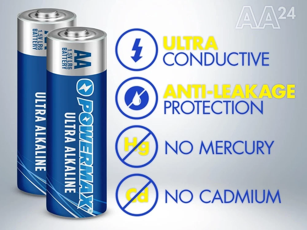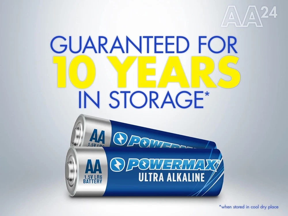 DOUBLE A BATTERIES: Combo pack includes 24 AA bulk batteries that are bundled in a recloseable package for easy storage and organization, and feature 1.5 volts of long-lasting power. These are NOT rechargeable batteries EVERYDAY DEVICES: Each Powermax AA battery delivers optimal power to common everyday household devices such as wireless mice, flashlights, clocks, remote controls, game controllers, digital cameras, computer mice, electronic toys and more LONG LASTING POWER: Powermax ultra alkaline batteries deliver long lasting power that is consistent and reliable 10-YEAR SHELF LIFE: All Powermax alkaline batteries are built to last with an impressive ten-year shelf life. We advise keeping your batteries in a cool dry place and out of the sun ENVIRONMENTAL IMPACT: Our 1.5-volt batteries contain no mercury or cadmium, making them a smart choice for your family and for the environment Powermax AA Alkaline Batteries are equipped with superior battery technology you can depend on. Powermax alkaline batteries are ultra long lasting batteries and provide optimum performance in high-drain and super high-drain devices. This reclosable assortment pack includes 24 size AA batteries that deliver the right amount of power for your needs. Powermax alkaline batteries are great to have on hand for a variety of everyday household devices, including clocks, remote controls, game controllers, digital cameras, toys and more. Powermax AA alkaline batteries won't leak and are designed to last ten years in storage. The 1.5-volt batteries contain no mercury or cadmium, making them a smart choice for your family and for the environment. At Powermax, our mission is to provide trusted and dependable power for everyday needs.