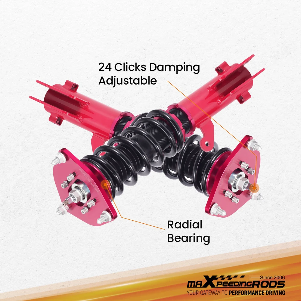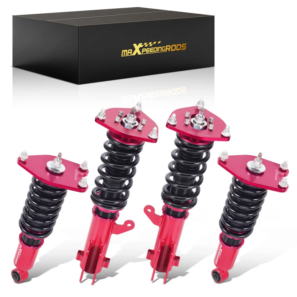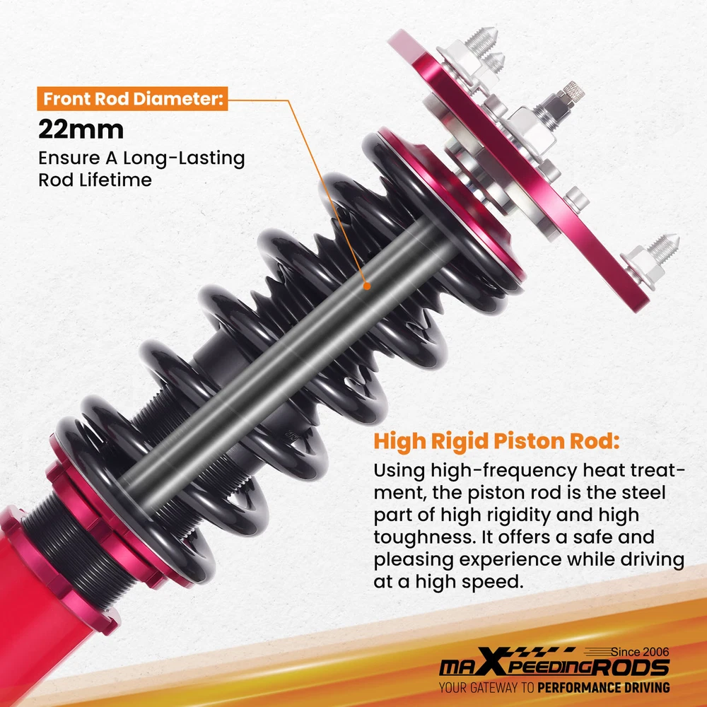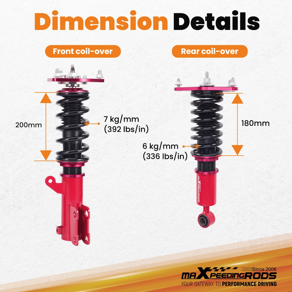 ZJPSS 24 Click Damper Coilovers Lowering Kit for Mitsubishi Eclipse 06-12 Coilovers 24 Way Damper Adjustable Lowering Kit for MITSUBISHI LANCER 2002-2006 Camber Plate with Pillow Ball Mount Provides More Precise Feel From Suspension And Steering Top Camber Plate with Pillow Ball Mount Provides More Precise Feel From Suspension And Steering Rebound Damping Force Adjustable 24 Step To Adjust Soft / Hard Adjustment According To Your Preference. Anodized Shock Body With Anti-Corrosion Coating Manufactured From High Quality T-6061 Billet Aluminum With Anodized Finish For Superior Strength And Corrosion Protection. Specification Front Spring rate 7 kg/mm (392 lbs/in) Rear Spring rate 6 kg/mm (336 lbs/in) Adjustable camber plate Yes Damping adjustable Yes, 24 levels of rebound damping force Height adjustable Yes, lowering 25-75mm depending on the vehicle models Package included 2 Front + 2 Rear Warranty 2 Years Maxpeedingrods' street coilovers are designed and developed for all motoring enthusiasts that want excellent handling without sacrificing comfort. This suspension system is ideal for daily driving and occasional, light track use. High quality components are adopted to ensure product durability and stability. Each application is fully test fitted and completely road tested to guarantee all our customers perfect performance and comfort expectations. Features - Independent ride height adjustable: Easily adjust the height of your ride! This coilover also allows for height and preload adjustments. This means you can reach optimal suspension tuning while maintaining a stable, comfortable ride at all times. - 24 Levels Damping Force Adjustable : Provides an extensive range of adjustability, making it easy to customize for various purposes and achieve desired ride comfort. - High Durability Bearing and Thrust Seat : Utilizes top-quality components for durability and noise reduction, ensuring long-lasting performance and silent operation. - Reinforced Rubber Bushing Upper Mount : Specifically designed for each vehicle, enhances silence and comfort. Adjustable camber angle for certain strut mechanism suspension cars. Full Length Adjustable Type: Allows ride height adjustment without affecting suspension stroke, maintaining comfort while customizing height. - 55CrSi Steel Cold-bent Spring : Features extreme lightweight and high durability with world-class tensile strength, reducing metal fatigue and enhancing performance. - Balanced Comfort & Performance : Strikes a harmonious blend between sporty handling dynamics and daily drivability. Application For Mitsubishi Eclipse IV 2006–2012 (DK2A/DK4A) For Mitsubishi Galant (DJ) 2004-2012 Specification - Front top mount: Pillow ball with camber plate - Rear top mount: Standard rubber - Damping adjustable: Available, 24 levels of rebound damping force - Camber adjustable: Available, front only - Height adjustable: Yes, lowering 25-75mm depending on the vehicle models - Spring Rate Front: 7 kg/mm(392lbs/in) - Spring Rate Rear: 6 kg/mm(336lbs/in) - Front spring inner diameter: 70.5 mm - Rear spring inner diameter: 70.5 mm - Spring length Front: 200 mm - Spring length Rear: 180 mm - Spring Preload advised: 7-10 mm - Color: Red body with black spring Package included 2x Front coil-overs 2x Rear coil-overs 1x Allen wrench 2x C spanners ★ 30-day Money Back & 12-Month Replacement Guarantee. Please feel free to contact us if there is any question. Height Adjustable Lowering Kit; Independent Ride Height And Spring Tension Settings; 24 Clicks of Rebound Damping Force Adjustment; High Rigidity 55CrSi Steel Cold-bent Springs; Anodized Shock Body With Anti-Corrosion Coating; Top Camber Plate with Pillow Ball Mount Provides More Precise Feel From Suspension And Steering; Full 1 Year Limited Warranty From Date Of Purchase. Other items you might also like 2-4" Lift Front Upper Control Arms For 95-04 Toyota Tacoma / 96-02 4Runner 6 Lug Front Passenger Right Side Power Window Lift Motor for Toyota RAV4 2001-2005 4 Ignition Coils & Spark Plugs For Mazda 3 6 CX-7 L4 2.0/2.3/2.5L UF540 90083 Intake + Exhaust Camshaft Phaser for Ford Mustang Taurus Edge 3.5L AT4Z6C525B 20AN Nylon Braided Stainless Steel Hose Hose Fuel line Oil Cooling Line 5Ft Steering Torque Sensor For Saturn Aura l4 2.4L 2007-2009 23232310 New 1PC Turbo Intercooler for Ford F-150 Expedition for Lincoln Navigator FL3Z6K775B Power Steering Gear Box for Chevy Malibu Chevelle Camaro Monte Carlo 27-6509 Dual Steering Stabilizers For Dodge Ram 2500 3500 Truck 2014-2022 6 Ignition Coils & Spark Plugs For BMW 320i 325Ci 325i 325xi 330Ci UF522 7092 Engine Motor & Trans Mount Set of 3 for Scion XA/XB 04-06 for Toyota Echo 00-05 12 V 125 A Alternator for Chevy Malibu Cobalt for Pontiac G5 for Saturn Vue Aura Shipping Terms of Sales Payment Contact us All orders will be shipped within 1 business day after payment has been processed. For orders placed before 5:30 AM PST on business days, most items will be shipped out on the same day. All orders will be shipped with a tracking number via USPS, UPS, or FedEx Express and delivered within 2-6 business days We do not ship to P.O. Boxes, APO/FPO addresses, or Military Mail Boxes. Please ensure your address is confirmed by PayPal before checkout, as we only ship to confirmed addresses. 30-day free return and money back guarantee If you are not satisfied with your purchase, you can return the item with its original packaging to us for a full refund with no restocking fee. Please note that the return cost should be paid by the seller. One Year Unlimited Mileage Quality Guarantee If you receive incorrect items, items that are damaged during transportation, or defective items, we will accept returns and cover the return freight. Please note that the return cost should be prepaid by the buyer. After inspecting the faulty item, we will issue a refund of the return cost to the buyer. We offer a full refund or replacement for all faulty items, which includes the cost of original s