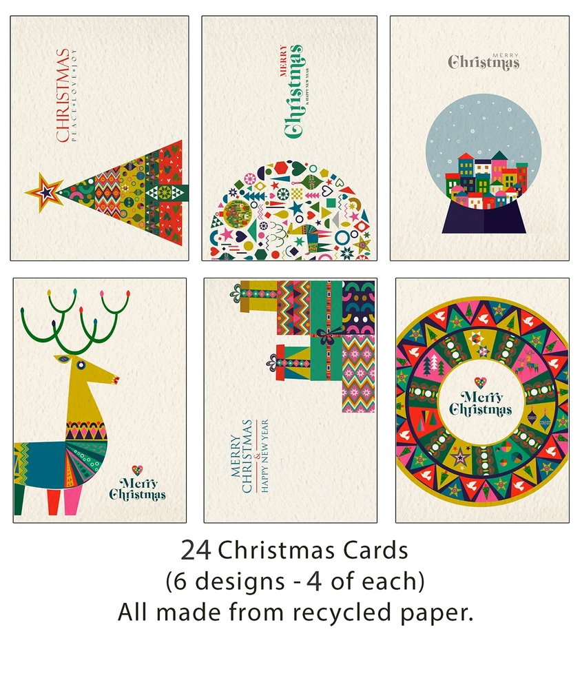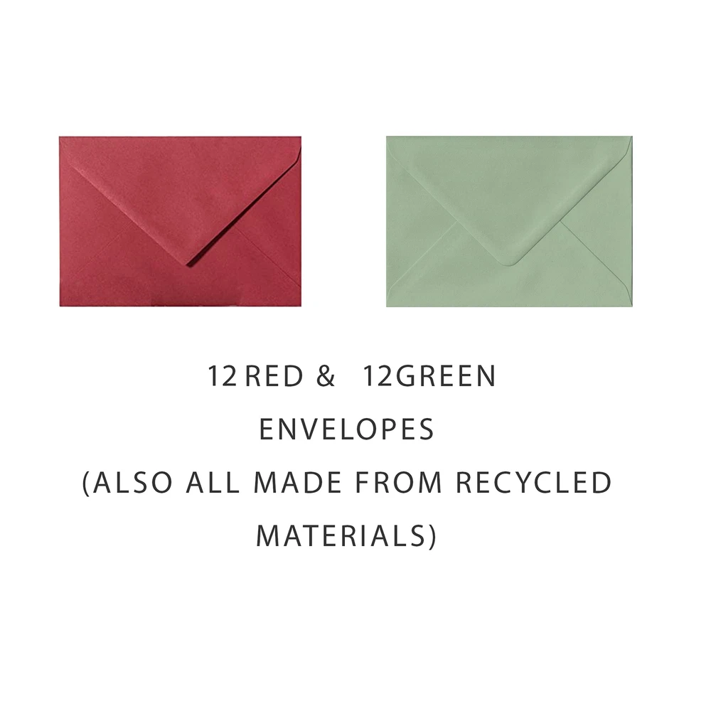 Stylish and contemporary recycled Christmas card set, send a message this year using eco friendly cards. Both the cards and the envelopes are made from recycled paper making them a better alternative to send to your friends and family than a lot of other cards. A6 size when folded: 4.1 x 5.8 inch 12 recycled red and 12 recycled green envelopes which will make your Christmas cards look and feel a little different from a standard letter. 24 cards, six designs and 4 copies of each design. Great value eco friendly cards.