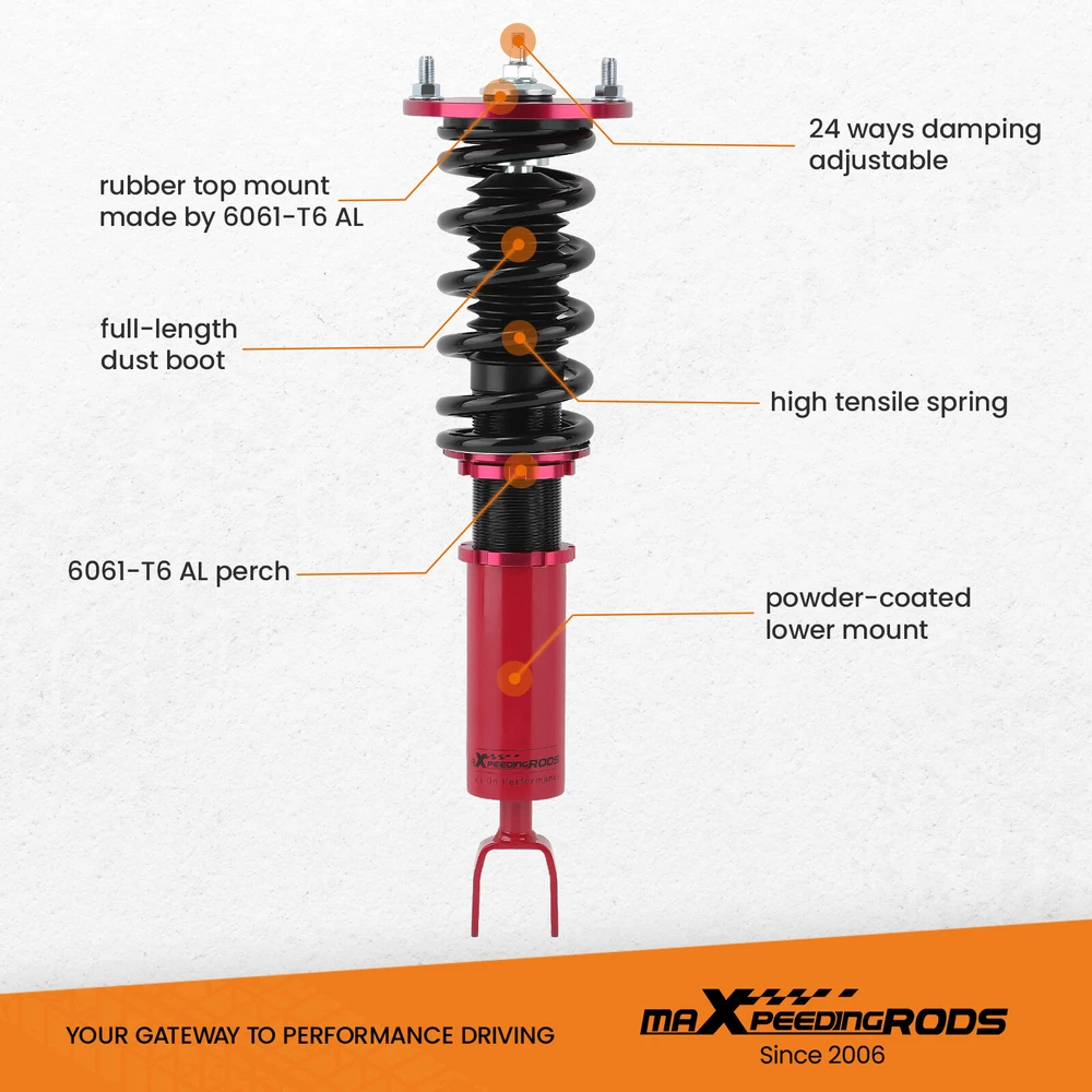 maXpeedingrods Canada Store Home About maXpeedingrods View Feedback Contact Us WHY CHOOSE US 24 Damping Levels Coilover Coilovers For Honda Accord DX/EX/LX CD5 CD7 1990-1997 Description Introduction MXR-SLC based on MXR-SNA coilovers, which is also height adjustable but adds damping adjustment ability by a knob the top of the shaft. They are also made for street use, but the 24 level rebound damping control allows you the ability to perfectly dial in your coilover setup. You will experience better ride quality in all road conditions. Application For Honda Accord DX/EX/LX 1990-1997, Chassis Code: CB7/CD5/CD7 For Honda Acura CL 1997-1999, Chassis Code: YA1 Notice: The coilovers kit will "Lower your car" and does not keep to the original ride height. Specification Front and Rear top mount: Rubber Damping: 24 levels rebound damping adjustable Spring rate Front: 10 kg/mm (560 lbs/in) Spring rate Rear: 7 kg/mm (392 lbs/in) Spring length Front: 200mm Spring length Rear: 200mm Adjustable height: lowering 1-3 inch Coilover overall length Front: 450mm-490mm Coilover overall length Rear: 525mm-620mm Shock type: Twin tube Spring Preload: 7-10 mm Color: Red body with black spring Package included Complete coilovers assembly 2 front and 2 rear A pair wrench for height adjustment Dimension Package dimension : 64*52*21 Weight: 23260g Features 1. Lowered height adjustment from 1" - 3" which allow lower center of gravity and also add a more aggressive stance 2. A 24 rebound damping adjustment level allows you the ability to perfectly dial in your coilover setup. You will experience better ride quality in all road conditions. 3. Rubber top mounts help to deliver a smooth and forgiving ride for city use at any speed and rubber joints assist in absorbing hard impacts. 4. Twin-Tube structure allows sufficient stroke within the shock absorber. 5. Complete Suspension Kit of 4 Shock Absorbers & 4 Springs for an easy installation. 6. Separate height adjustment does not affect damper stroke. 7. Height can be adjusted with coilovers installed on the vehicle. 8. High Tensile performance spring - STRESS TESTED OVER 600,000 times while the spring distortion is less than 0.04%. Plus the special surface treatment improves the durability and performance. 9. Height Adjustment tools included. 10. Most pieces in our coilover systems, including mounts, collars and spring perches, are designed from 6061-T6 Billet Aluminum resulting in lightweight, durable and rust resistant components. 11. Steel shock bodies with special surface treatment to improve the durability. 12. Full rebuildable. Notice - Hi-performance aftermarket parts; professional installation is suggested. - Please check our store for other auto parts you may be interested in. Other items you might also like Coilovers Coil Spring Shock Strusts For Mitsubishi Lancer (CX/CY) 2008-2016 24 Ways Adjustable Damper Coilovers For Lexus IS300 IS200 JCE10L GXE10 1999-2005 Street Coilovers Suspension For Nissan S13 Silvia 240SX 200SX 180SX 1989-1998 24 Ways Adjustable Damper Coilover For Honda Civic EJ EK EM 96-00 Acura Integra 24 Damping Level Coilover For Honda Civic 4-door Sedan FA1 FA2 FA3 FA4 FA5 06-11 Coilover Lowering Kit For BMW 3 E90 E91 RWD 330i 318i 320i 323i 325i 328i 04-11 maXpeedingrods T6 Adjustable Damper Coilover For Jaguar XJ8 XJR X358 2007-2009 Coilover Suspension Kit For Honda Civic VIII 2-door coupe Si FG1 FG2 2006-2011 Coilover Spring & Shock For Honda Accord CG2 CG3 1998-2002 Acura TL CL 99-03 Coilovers Suspension Kit For Ford Ford Mustang S-197 2005-2014 Spring & Shock Street Coilovers Suspension For Hyundai Genesis Coupe 2010-2016 2-Door ONLY maXpeedingrods T6 Adjustable Damper Coilover For MINI Clubman R55 Cooper 07–14 About MaXpeedingrods Shipping Policy Returns Policy