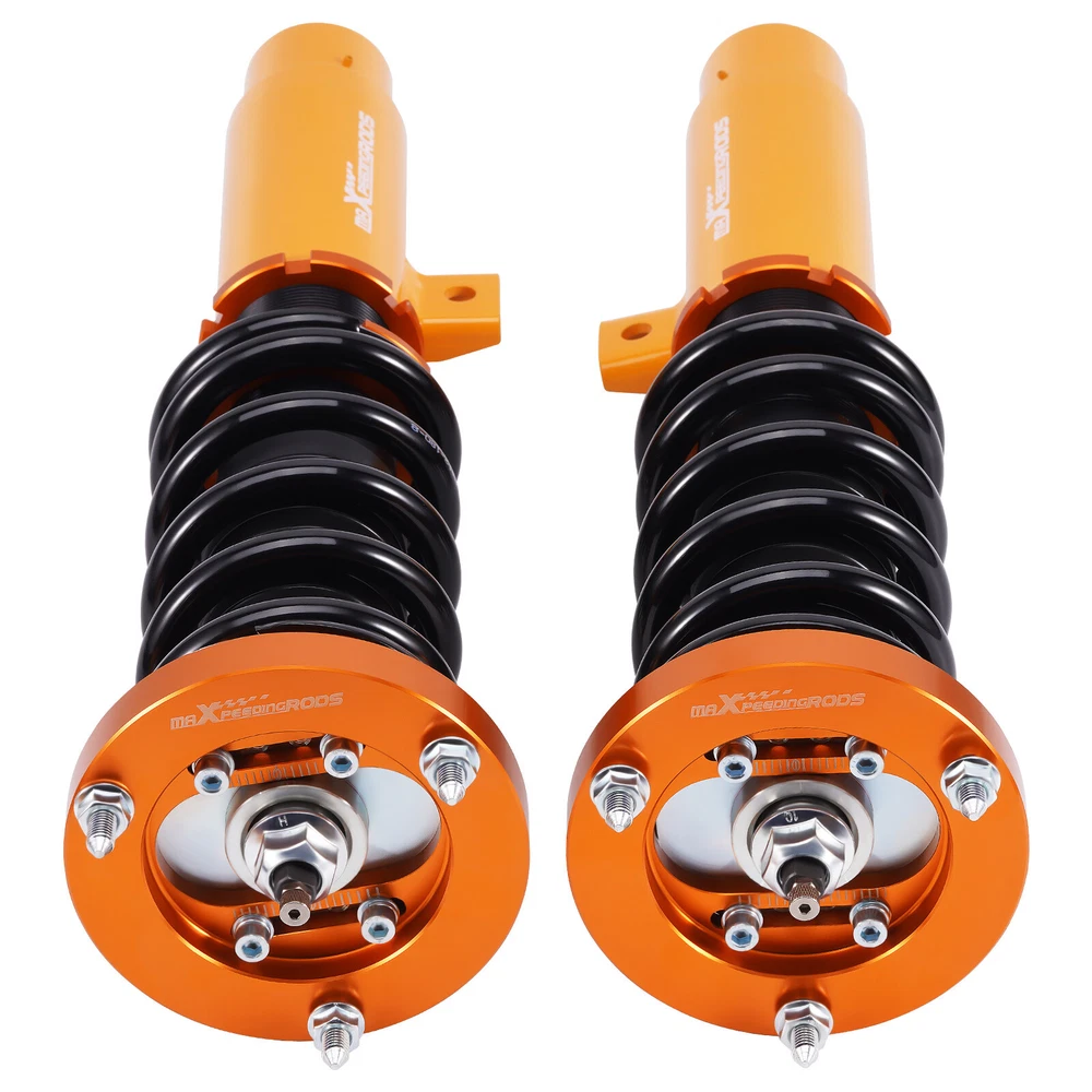 maXpeedingrods Canada Store Home About maXpeedingrods View Feedback Contact Us WHY CHOOSE US 24 Damping Levels Coilover For BMW 3 Series Convertible E93 318i 320i 2006-2013 Description Introduction MXR-SLC based on MXR-SNA coilovers, which is also height adjustable but adds damping adjustment ability by a knob the top of the shaft. They are also made for street use, but the 24-level rebound damping control allows you the ability to perfectly dial in your coilover setup. You will experience better ride quality in all road conditions. Application This product fit RWD vehicle only, not for the M3 model. For BMW 3 Coupe (E92) (2005-2013) 316i, 318i, 320i,323i,325i,328i,330i,335i,320d,325d,330d, 335d For BMW 3 Convertible (E93) (2006-2013) 318i, 320i, 323i, 325i, 330i, 335i, 320d, 330d, 325d. Note: We suggest adding washers to avoid the engine bar and drilling the front OE shock top mount upper part a little bigger to a diameter of 12mm. Specification Front Top mounts: Pillow ball top mount with camber plate Rear Top mounts: OE top mounts required Damping: 24 levels rebound damping adjustable Spring rate Front: 6 kg/mm (356 lbs/in) Spring rate Rear: 10kg/mm (560 lbs/in) Spring length Front: 180mm Spring length Rear: 230mm Adjustable height: lowering 1-3inch Coilover overall length Front: 540mm-640mm Coilover overall length Rear: 550mm-660mm Shock type: Twin tube Spring Preload: 7-10 mm Color: Gold Package included 2x Front coil-overs 2x Rear coil-overs 2x Sway bar end links 2x C spanners Dimension Weight: 26600g Size: 63*51*21 cm Feature 1. Lowered height adjustment from 1" - 3" which allow lower center of gravity and also add a more aggressive stance 2. A 24 rebound damping adjustment level allows you the ability to perfectly dial in your coilover setup. You will experience better ride quality in all road conditions. 3. Twin-Tube structure allows sufficient stroke within the shock absorber. 4. Separate height adjustment does not affect damper stroke. 5. High Tensile performance spring - STRESS TESTED OVER 600,000 times while the spring distortion is less than 0.04%. Plus, the special surface treatment improves the durability and performance. 6. Height Adjustment tools included. 7. Camber plate top mounts help to eliminate the need for a separate camber kit. 8. Pillow ball top mount - It improves the steering feel and response. 9. Most pieces in our coilover systems, including mounts, collars and spring perches, are designed from 6061-T6 Billet Aluminum resulting in lightweight, durable and rust resistant components. 10. Full rebuildable. Notice * Professional installation & alignment suggested. * Please check our store for other auto parts you may be interested in. Other items you might also like Coilovers Coil Spring Shock Strusts For Mitsubishi Lancer (CX/CY) 2008-2016 24 Ways Adjustable Damper Coilovers For Lexus IS300 IS200 JCE10L GXE10 1999-2005 Street Coilovers Suspension For Nissan S13 Silvia 240SX 200SX 180SX 1989-1998 24 Damping Level Coilover For Honda Civic 4-door Sedan FA1 FA2 FA3 FA4 FA5 06-11 24 Ways Adjustable Damper Coilover For Honda Civic EJ EK EM 96-00 Acura Integra maXpeedingrods T6 Adjustable Damper Coilover For Jaguar XJ8 XJR X358 2007-2009 Coilover Spring & Shock For Honda Accord CG2 CG3 1998-2002 Acura TL CL 99-03 Coilovers Suspension Kit For Ford Ford Mustang S-197 2005-2014 Spring & Shock Street Coilovers Suspension For Hyundai Genesis Coupe 2010-2016 2-Door ONLY maXpeedingrods T6 Adjustable Damper Coilover For MINI Clubman R55 Cooper 07–14 Coilover Lowering Kit For BMW 3 E90 E91 RWD 330i 318i 320i 323i 325i 328i 04-11 Coilover Suspension Kit For Honda Civic VIII 2-door coupe Si FG1 FG2 2006-2011 About MaXpeedingrods Shipping Policy Returns Policy