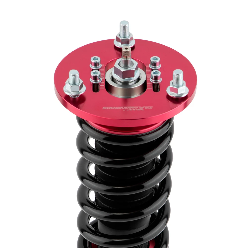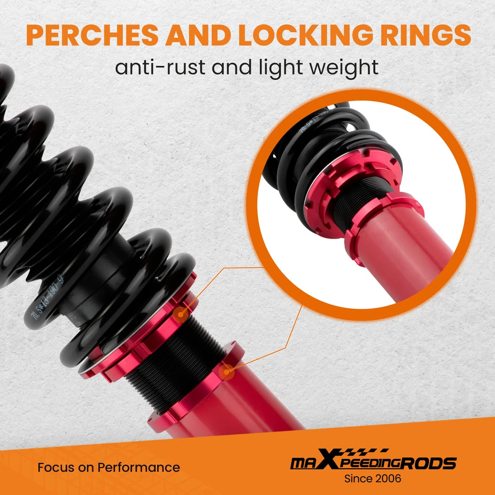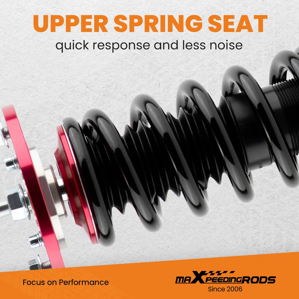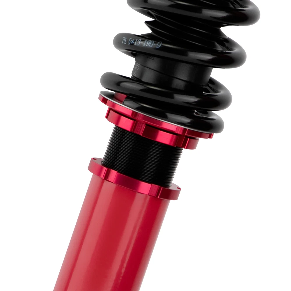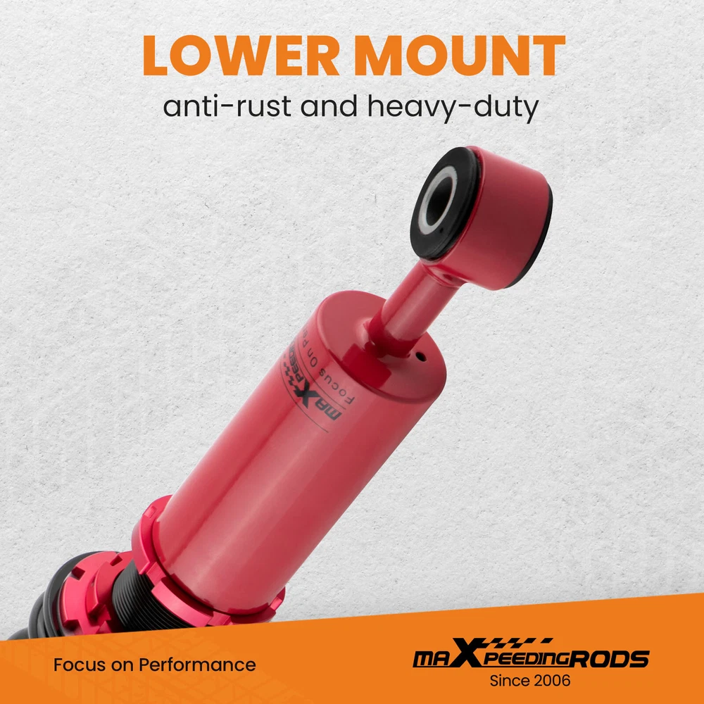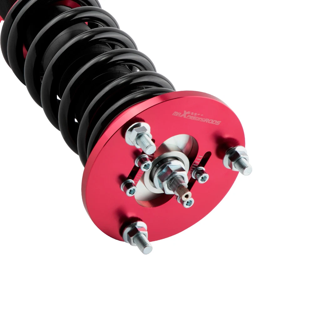 maXpeedingrods Canada Store Home About maXpeedingrods View Feedback Contact Us WHY CHOOSE US 24 Damping Levels Coilover For Mitsubishi Eclipse D38A D33A D32A D31A 95-99 Description Introduction MXR-SNA coilovers are designed as an entry level for street use. It features with full length height adjustable and adjustable camber plates (applicable for some vehicles), which offers you a lowered stance, improved performance for your daily use vehicle. Application for For Mitsubishi Eclipse 1995-1999 USA D38A CONVERTIBLE, 4CYL/TURBO For Mitsubishi Eclipse 1995-1999 USA D33A 4CYL/TURBO For Mitsubishi Eclipse 1995-1999 USA D32A 4CYL/TURBO For Mitsubishi Eclipse 1995-1999 USA D31A 4CYL/NON TURBO Specifications Top mount: Front camber plate; rear rubber Damping: 24 levels rebound damping adjustable Front Spring Rate: 12kg/mm (672 lbs/in) Rear Spring Rate: 9kg/mm (504lbs/in) Spring length Front: 190mm Spring length Rear: 190mm Coilover overall length Front: 445mm-495mm Coilover overall length Rear: 485mm-575mm Adjustable height: Yes lowering 1" to 3" Spring Preload: 7-10 mm Shock type:Twin tube Color: Red body with black spring Package included Complete coilovers assembly 2 front and 2 rear A pair wrench for height adjustment Dimension Package dimension : 63*51*21 Weight: 25260g Feature 1. Lowered height adjustment from 1" - 3" which allow lower center of gravity and also add a more aggressive stance. 2. A 24 rebound damping adjustment level allows you the ability to perfectly dial in your coilover setup. You will experience better ride quality in all road conditions. 3.Camber plate top mounts help to eliminate the need for a separate camber kit. 4.Twin-Tube structure allows sufficient stroke within the shock absorber. 5.Complete Suspension Kit of 4 Shock Absorbers & 4 Springs for an easy installation. 6.Separate height adjustment does not affect damper stroke and height can be adjusted with coilovers installed on the vehicle. 7.High Tensile performance spring - STRESS TESTED OVER 600,000 times while the spring distortion is less than 0.04%. Plus the special surface treatment improves the durability and performance. 8.Most pieces in our coilover systems, including mounts, collars and spring perches, are designed from 6061-T6 Billet Aluminum resulting in lightweight, durable and rust resistant components. 9.Steel shock bodies with special surface treatment to improve the durability. 10. Full rebuildable Notice * No instruction included; Professional installation & alignment suggested. * Please check our store for other auto parts you may be interested in. Other items you might also like Coilovers Coil Spring Shock Strusts For Mitsubishi Lancer (CX/CY) 2008-2016 24 Ways Adjustable Damper Coilovers For Lexus IS300 IS200 JCE10L GXE10 1999-2005 Street Coilovers Suspension For Nissan S13 Silvia 240SX 200SX 180SX 1989-1998 24 Damping Level Coilover For Honda Civic 4-door Sedan FA1 FA2 FA3 FA4 FA5 06-11 24 Ways Adjustable Damper Coilover For Honda Civic EJ EK EM 96-00 Acura Integra Coilover Lowering Kit For BMW 3 E90 E91 RWD 330i 318i 320i 323i 325i 328i 04-11 Coilover Lowering Kit For Mazdaspeed 3 Mazda 3 BK 2004-2009 Mazda 3 BL 2009-2013 Height Adjustable Coilover Lowering Kit For BMW 3 Series E90 E91 E92 E93 05-13 24 Damping Levels Coilovers for Mitsubishi Lancer ES CS6A FWD 2002-2006 Ralliart Pair Front Coilover Shock For Nissan S13 Silvia 180SX 200SX 240SX 1989-1994 Coilover Lowering Kit For Toyota Celica 2000-2006 GT GTS ZZT230 1.8 VVTL-i 190 2 Pcs Rear Active to Passive Shocks Conversion Kit for Cadillac SRX 2004 - 2009 About MaXpeedingrods Shipping Policy Returns Policy