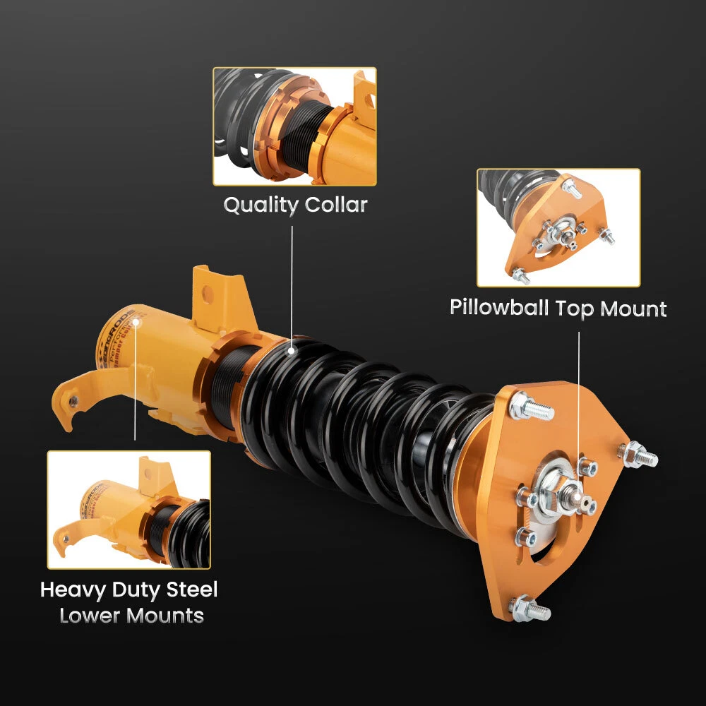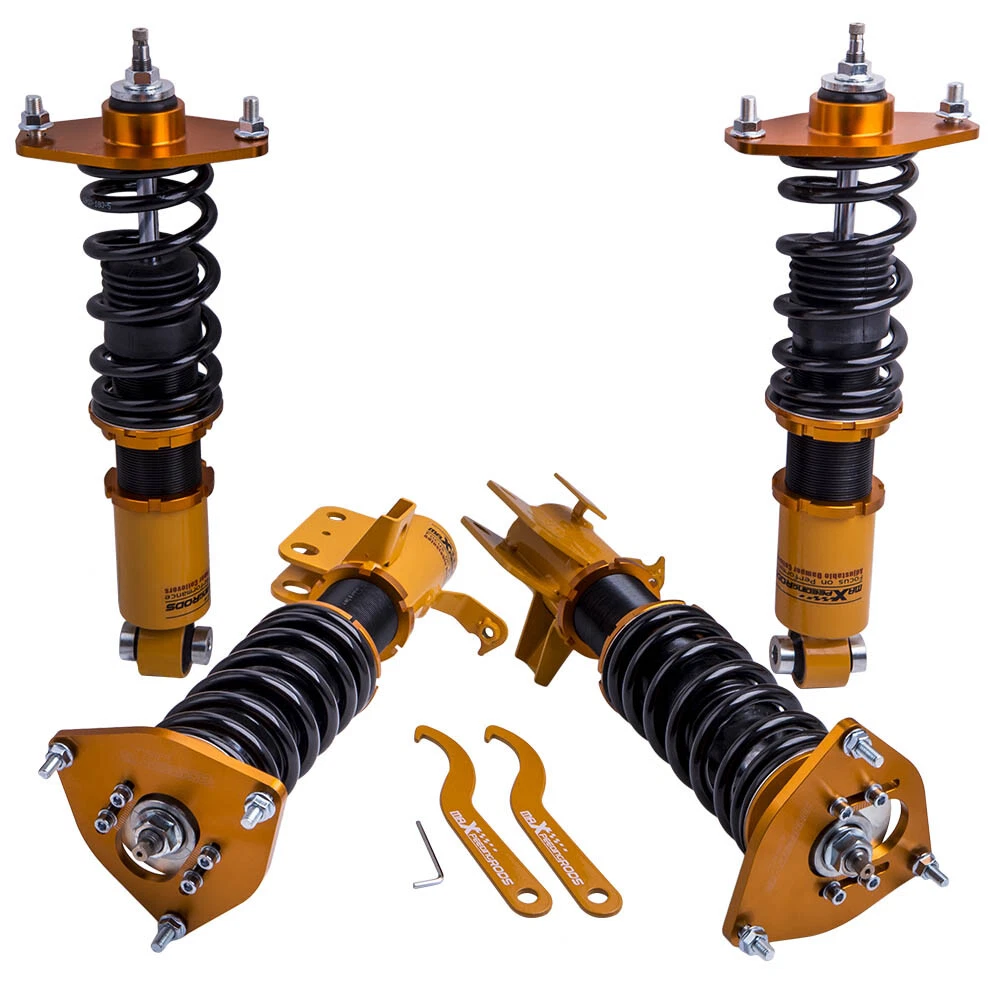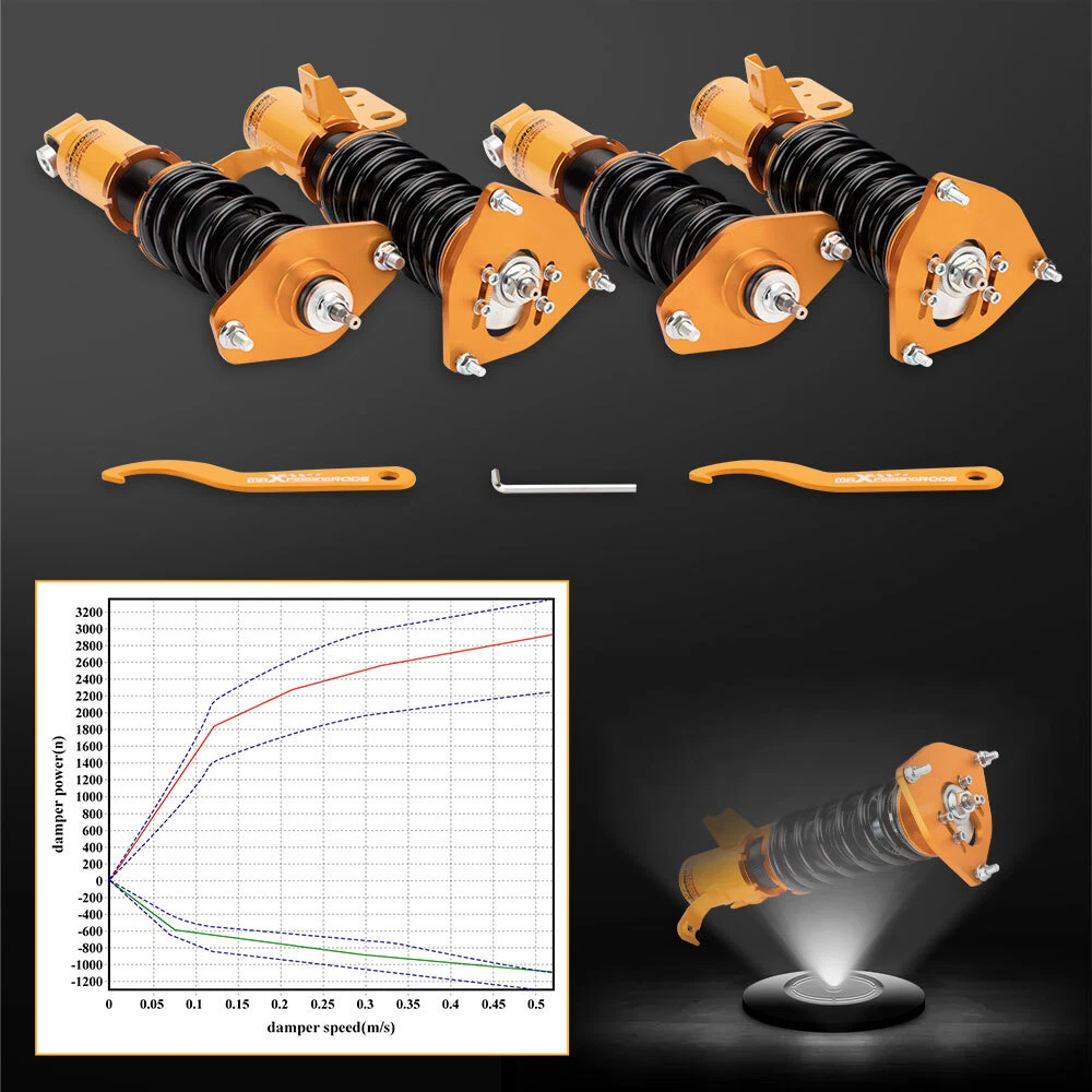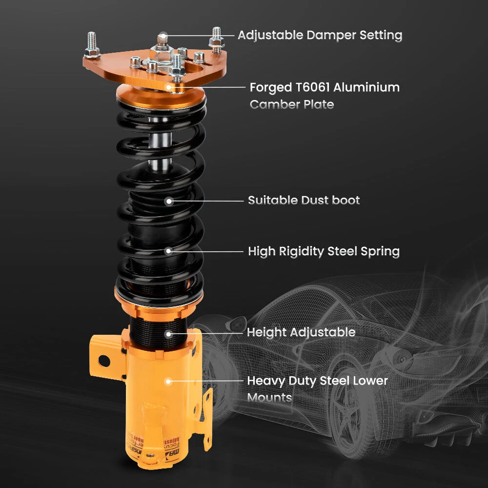 maXpeedingrods Canada Store Home About maXpeedingrods View Feedback Contact Us WHY CHOOSE US 24 Damping Levels Coilover For Subaru BRZ 2012-2020 Toyota 86 2012-2020 Scion Description Introduction MXR-SLC based on MXR-SNA coilovers, which is also height adjustable but adds damping adjustment ability by a knob the top of the shaft. They are also made for street use, but the 24 level rebound damping control allows you the ability to perfectly dial in your coilover setup. You will experience better ride quality in all road conditions. Applications For Subaru BRZ First generation (ZN6/ZC6) 2012-2020 For Scion FR-S 2012-2020 For Toyota 86 2012-2020 Specifications Top mounts: Front camber plate with pillow ball Damping: 24 clicks rebound damping adjustable Shock type: Twin tube Adjustable height: Yes, lowering 1'' to 3'' Adjustable camber plate: Yes Spring preload: 7-10 mm Spring rate Front: 6 kg/mm (336 lbs/in) Spring rate Rear: 5 kg/mm (280 lbs/in) Color: Golden Package included Complete coilovers 2 front and 2 rear as shown in the picture Dimension Size: 63*51*21 cm Weight: 21.24 kg Features 1. Quickly Install---Preload parameter is provided to save your 3-4 hours installation time. 2. Lowered height adjustment from 1" - 3" which allow lower center of gravity and also add a more aggressive stance. 3. A 24 rebound damping adjustment level allows you the ability to perfectly dial in your coilover setup. You will experience better ride quality in all road conditions. 4. Twin-Tube structure allows sufficient stroke within the shock absorber. 5. Pillow ball top mount - It improves the steering feel and response. 6. Rubber top mounts help to deliver a smooth and forgiving ride for city use at any speed and rubber joints assist in absorbing hard impacts. 7. Complete Suspension Kit of 4 Shock Absorbers & 4 Springs for an easy installation. 8. Separate height adjustment does not affect damper stroke. 9. Height can be adjusted with coilovers installed on the vehicle. 10. High Tensile performance spring - STRESS TESTED OVER 600,000 times while the spring distortion is less than 0.04%. Plus the special surface treatment improves the durability and performance. 11. Height Adjustment tools included. 12. Full rebuildable. Notice * Professional installation & alignment suggested. * Please check our store for other auto parts you may be interested in. Other items you might also like Coilovers Coil Spring Shock Strusts For Mitsubishi Lancer (CX/CY) 2008-2016 24 Ways Adjustable Damper Coilovers For Lexus IS300 IS200 JCE10L GXE10 1999-2005 Street Coilovers Suspension For Nissan S13 Silvia 240SX 200SX 180SX 1989-1998 24 Damping Level Coilover For Honda Civic 4-door Sedan FA1 FA2 FA3 FA4 FA5 06-11 24 Ways Adjustable Damper Coilover For Honda Civic EJ EK EM 96-00 Acura Integra Pair Front Coilover Shock For Nissan S13 Silvia 180SX 200SX 240SX 1989-1994 Coilover Lowering Kit For Mazdaspeed 3 Mazda 3 BK 2004-2009 Mazda 3 BL 2009-2013 Coilover Spring & Shock For Honda Accord CG2 CG3 1998-2002 Acura TL CL 99-03 Coilovers Kit Coil Spring Struts For Mitsubishi Lancer CX/CY 2008-2016 Outlancer 24 Ways Adjustable Damper Coilover For Toyota Corolla E140 E160 E170 2014-2019 Coilover Lowering Kit For Toyota Celica 2000-2006 GT GTS ZZT230 1.8 VVTL-i 190 2 Pcs Rear Active to Passive Shocks Conversion Kit for Cadillac SRX 2004 - 2009 About MaXpeedingrods Shipping Policy Returns Policy