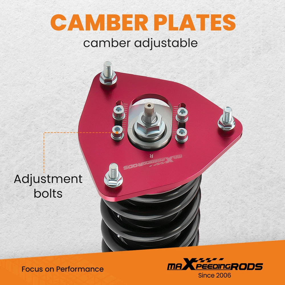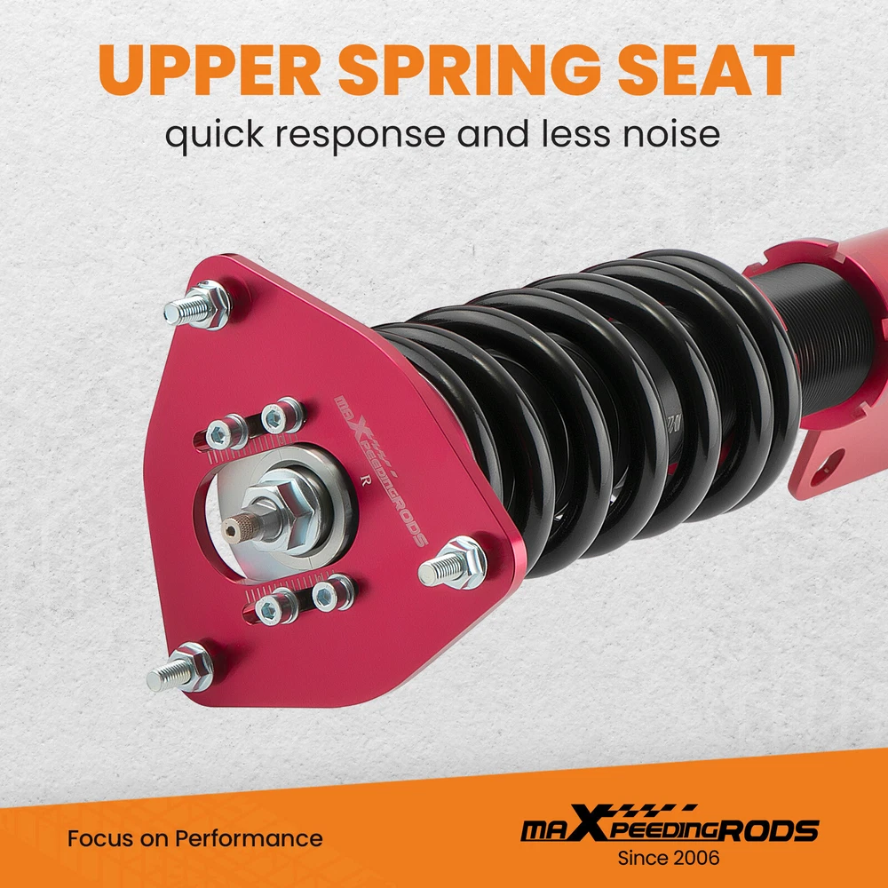 maXpeedingrods Canada Store Home About maXpeedingrods View Feedback Contact Us WHY CHOOSE US 24 Damping Levels Coilover For Subaru Impreza WRX STI GDB GDA GD9 GGA 2000-2004 Description Introduction MXR-SLC based on MXR-SNA coilovers, which is also height adjustable but adds damping adjustment ability by a knob the top of the shaft. They are also made for street use, but the 24 level rebound damping control allows you the ability to perfectly dial in your coilover setup. You will experience better ride quality in all road conditions. Application For Subaru Impreza WRX 2000.08-2007.06 GDA GD9 GGA For Subaru Impreza WRX STI 2000.10-2004.06 GDB (RIM P.C.D.=100) For Subaru Forester SG 2003-2008 For Saab 9-2X 2005-2007 GGA GGE The Coilovers kit will " Lower your car " and DOES NOT keep to the Original Ride Height. Specification Top mounts: Pillow ball top mounts Damping: 24 levels rebound damping adjustable Adjustable height: Yes, lowering 1" to 3" Adjustable camber plate: Front only Spring rate Front: 9 kg/mm(504 lbs/in) Spring rate Rear: 7 kg/mm(392 lbs/in) Shock type: Twin tube Spring Preload: 7-10 mm Color: Red Package included Complete coilovers 2 front and 2 rear Dimension Size: 71*51*21 cm Weight: 29 kg Feature 1. Lowered height adjustment from 1" - 3" which allow lower center of gravity and also add a more aggressive stance. 2. A 24 rebound damping adjustment level allows you the ability to perfectly dial in your coilover setup. You will experience better ride quality in all road conditions. 3. Pillow ball top mount - It improves the steering feel and response. 4. Camber plate top mounts help to eliminate the need for a separate camber kit. 5. Twin-Tube structure allows sufficient stroke within the shock absorber. 6. Complete Suspension Kit of 4 Shock Absorbers & 4 Springs for an easy installation. 7. Separate height adjustment does not affect damper stroke. 8. Height can be adjusted with coilovers installed on the vehicle. 9. High Tensile performance spring - STRESS TESTED OVER 600,000 times while the spring distortion is less than 0.04%. Plus the special surface treatment improves the durability and performance. 10. Height Adjustment tools included. 11. Full rebuildable. Notice * High performance aftermarket parts; professional installation is recommended. * Please check our store for other auto parts you may be interested in. Other items you might also like Coilovers Coil Spring Shock Strusts For Mitsubishi Lancer (CX/CY) 2008-2016 24 Ways Adjustable Damper Coilovers For Lexus IS300 IS200 JCE10L GXE10 1999-2005 Street Coilovers Suspension For Nissan S13 Silvia 240SX 200SX 180SX 1989-1998 24 Damping Level Coilover For Honda Civic 4-door Sedan FA1 FA2 FA3 FA4 FA5 06-11 24 Ways Adjustable Damper Coilover For Honda Civic EJ EK EM 96-00 Acura Integra Pair Front Coilover Shock For Nissan S13 Silvia 180SX 200SX 240SX 1989-1994 Coilover Lowering Kit For Mazdaspeed 3 Mazda 3 BK 2004-2009 Mazda 3 BL 2009-2013 Coilover Spring & Shock For Honda Accord CG2 CG3 1998-2002 Acura TL CL 99-03 Coilovers Kit Coil Spring Struts For Mitsubishi Lancer CX/CY 2008-2016 Outlancer 24 Ways Adjustable Damper Coilover For Toyota Corolla E140 E160 E170 2014-2019 Coilover Lowering Kit For Toyota Celica 2000-2006 GT GTS ZZT230 1.8 VVTL-i 190 2 Pcs Rear Active to Passive Shocks Conversion Kit for Cadillac SRX 2004 - 2009 About MaXpeedingrods Shipping Policy Returns Policy