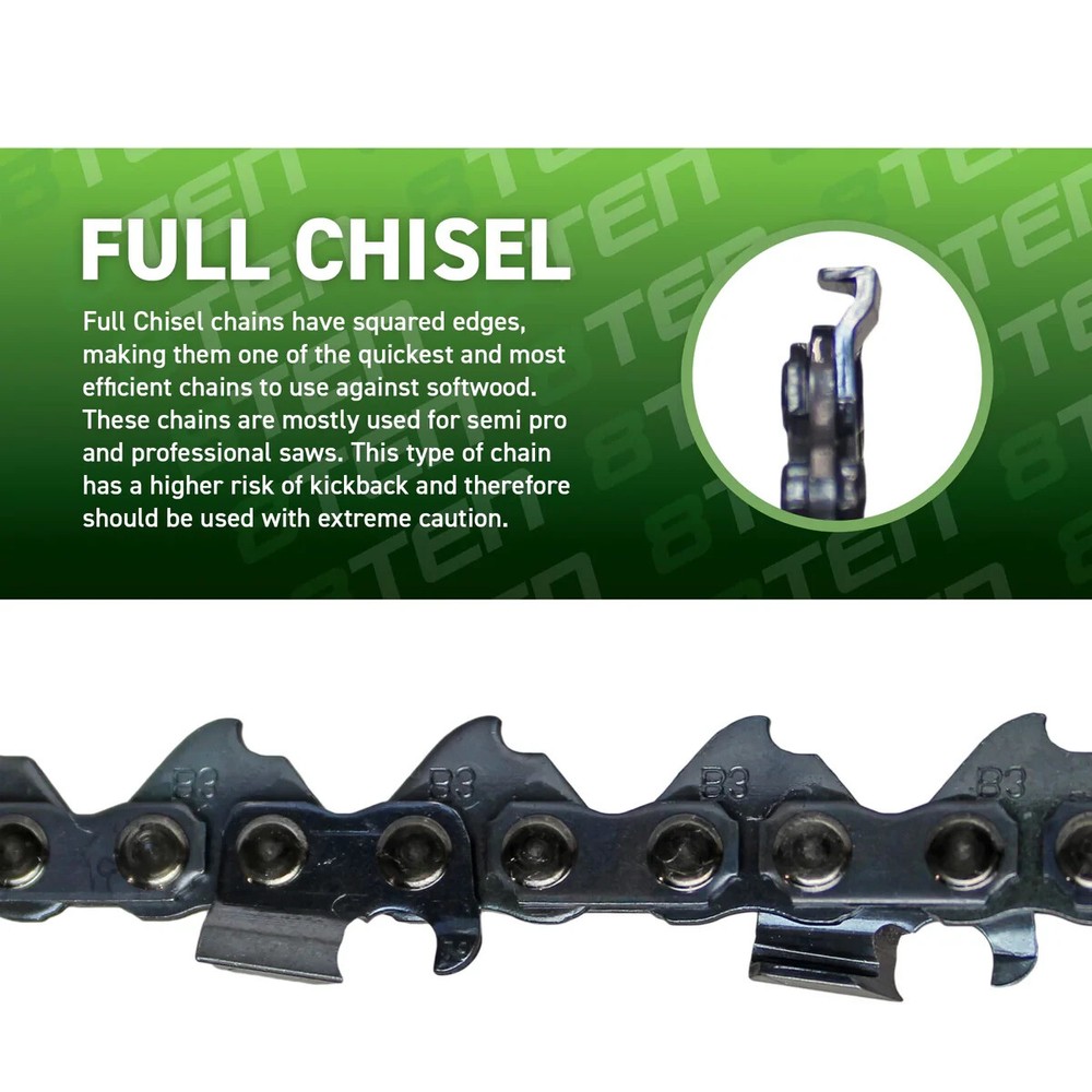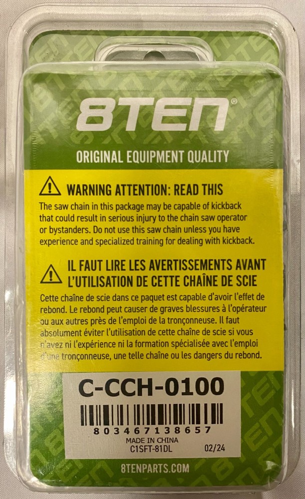 Tracking Number is provided for all listings! -- All items will be shipped out within 0-1 days after purchase! Feel free to ask us any questions you may have for our listings! -- 8Ten~ Full Chisel Saw Chain, 24", 81 Links, 2 Chains, NEW! Both Chains Are New, One New In Package One Without Package MPN: 810-CCC2322H UPC: 803467138657 Chain Gauge: .050 Inch Chain Length: 24 Inch UL Certification: No Chain Drive Links: 81 Chain Type: Full Chisel Chain Pitch: 3/8" / 0.375 Inch Material: Chain Material: 68CrNiMo33 Steel; Rivet Material: GCr15 Steel Brand Type Model Echo Chainsaw CS-590 Echo Chainsaw CS-600P Echo Chainsaw CS-620P Echo Chainsaw CS-620PW Echo Chainsaw CS-680 Echo Chainsaw CS-8000 Echo Chainsaw CS-800P Homelite Chainsaw 330 Homelite Chainsaw 35 SL Homelite Chainsaw 350 Brand Type Model Homelite Chainsaw 350 HG Homelite Chainsaw 350 SL Homelite Chainsaw 360 Homelite Chainsaw 410 Homelite Chainsaw 450 Homelite Chainsaw 460 Homelite Chainsaw 540 Homelite Chainsaw 550 Homelite Chainsaw 650 Homelite Chainsaw 700 G Brand Type Model Homelite Chainsaw 750 Homelite Chainsaw 825 Homelite Chainsaw Super XL 925 Homelite Chainsaw Super XL AO Homelite Chainsaw Super XL Homelite Chainsaw V 955 Homelite Chainsaw XL 12 Homelite Chainsaw XL 15 Homelite Chainsaw XL 400 Homelite Chainsaw XL 700 Brand Type Model Homelite Chainsaw XL 800 Homelite Chainsaw XL 850 Homelite Chainsaw XL 900 Homelite Chainsaw XL 922 Homelite Chainsaw XL 923 Tanaka Chainsaw ECS-505 Tanaka Chainsaw ECS-506 Tanaka Chainsaw ECS-650 Tanaka Chainsaw ECS-655