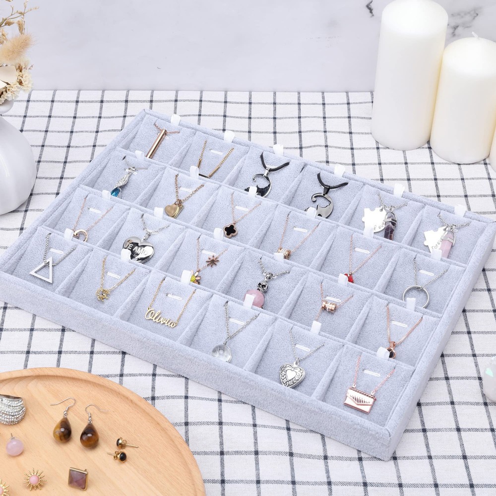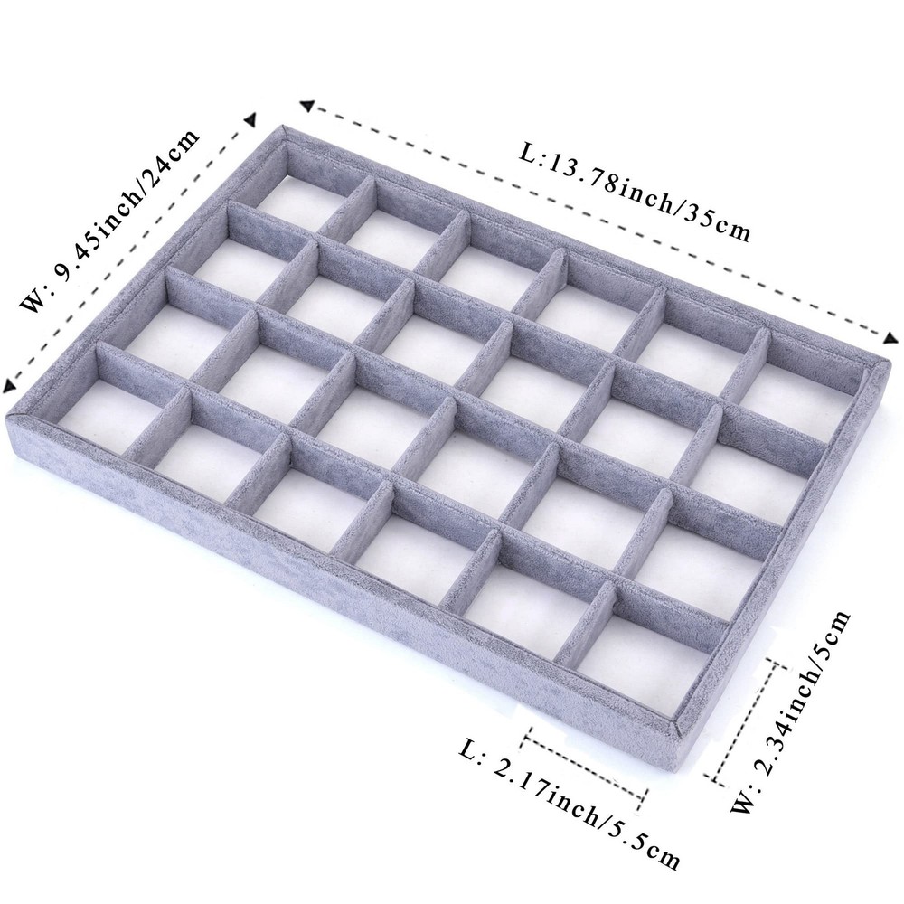 【Premium Velvet】: 24 Grids Jewelry Organizer Tray is made of durable composite board wrapped in glossy ice velvet fabric, perfectly to hold a collection of jewelry, accessories and other knickknacks. 【Stackable Jewelry Tray】: These jewelry display tray organizer can be stacked on your drawer or dresser to save space, and easily split up, combined or stacked, to meet a wide variety of usage scenarios. Perfect for a countertop jewelry display in stores or trade show. 【Removable Dividers】: Removable inner dividers design in this jewelry storage tray, can be reorganized the compartments according to your personalized storage needs, to protect earrings, necklaces, bracelets, brooches, pendants, pins, rings and other collections from any kind of damage or abrasion. 【Wide Application】: Jewelry and other collections put in these jewelry display tray will make them more eye-catching, safer, cleaner and more easy to access. Perfectly use for showers, birthdays, mother's day, holiday gifts or housewarming gift. An ideal gift for Mother's Day, birthdays, Valentine's Day, Christmas and wedding. 【Package】: It comes with 1 Piece of 24 grids jewelry tray organizer in 35*24cm/13.8x9.5inch dimension, attractive and classical. Adjust the size and number of compartments by removing or adding the dividers to meet your personalized storage needs.