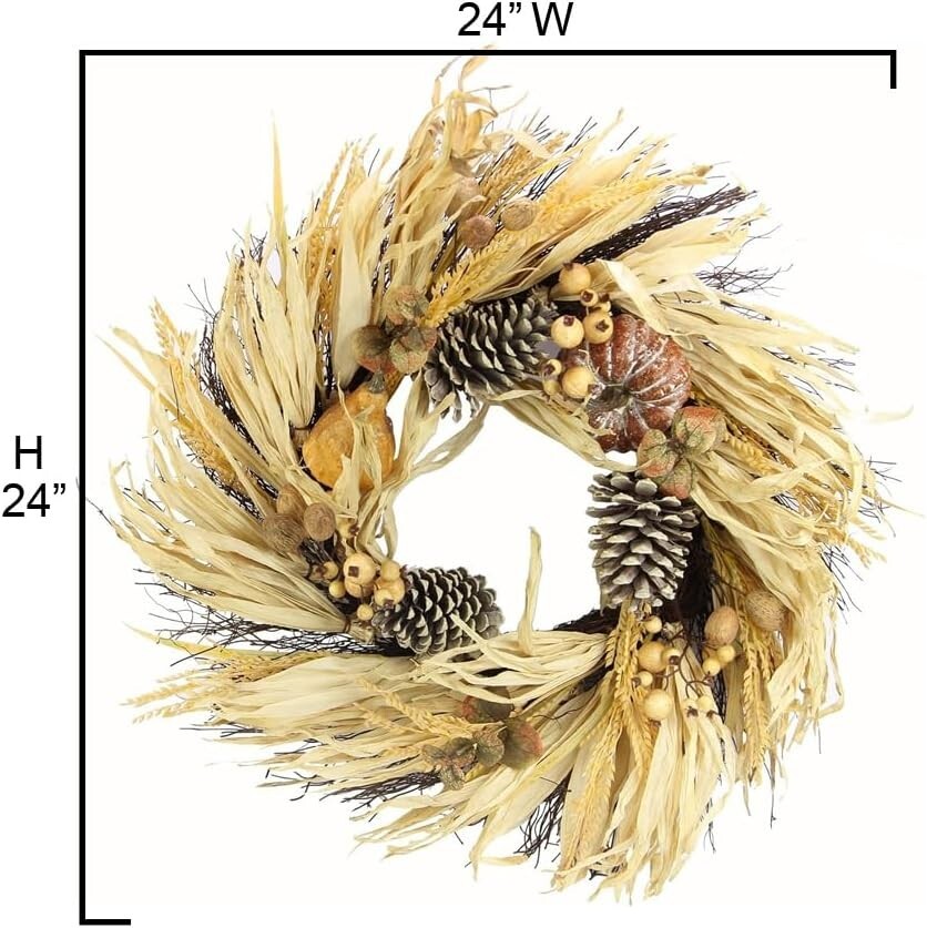 24 Inch Artificial Pumpkin Wheat Berry Corn Husk Wreath For Hanging Wall Window Fornt Door Home Office Farmhouse Thanksgiving Harvest Cemetery Wreaths Indoor Outdoor Decoartion [Classy Fall Décor] Artificial pumpkin wheat berry corn husk fall autumn wreath a great Boho home wall hanging decors fall front door decorations It has a natural look and feel, you will not believe its faux. [Material] The corn husk fall door hanging wreaths for front door fall is made of high-quality material. Widely used as halloween witch wreath, thanksgiving wreaths, holiday wreaths for front door and farmhouse wall décor. [Occasion] This farmhouse wall decor for the home wreath is perfect for decorating your fall front door, window fall decor, wall, fireplace, fall cabin decor, or farmhouse front porch decor. Also as a gift for your family and friends [Note] Indoor use. If displayed outdoors the artificial fall wreaths for front door should be under cover to avoid rain, snow and, not suitable for excessive sunlight exposure. No assembly is required. [Size] 1 unit of fall door wreaths for front door. Item fully expanded size: "H x "W x "D. Item compressed size: 20"H x 20"W x 6"D. Item comes compressed, primping and fluffing are required to match on the image shown. Beautiful 24-inch classy fall decor farmhouse style wreaths for front door is a combination of natural vine, artificial pumpkin wheat berry corn husk is a handmade fall wreath that looks lifelike appearance! This fall wreath front door is uplifting and is perfect for fall autumn, halloween, Thanksgiving or holiday creating a romantic fall joy and its seasonal style for a home office or farmhouse. It is just a simple way to embrace fall season, and perfect accent piece for fall decor for door, fall decorations porch, window, home, walls, enterway, fireplace mantel decor, autumn-themed parties, farmhouse and office fall door decoration. Also as a gift for your family and friends. Recommended for indoor use, but it is possible to display the autumn wreaths for front door outside with covered outdoor locations. Size inch L x inch H x inch D. Item comes compressed, primping and fluffing required to match the image shown. No assembly is required. Actual color/finish may vary slightly from screen display.