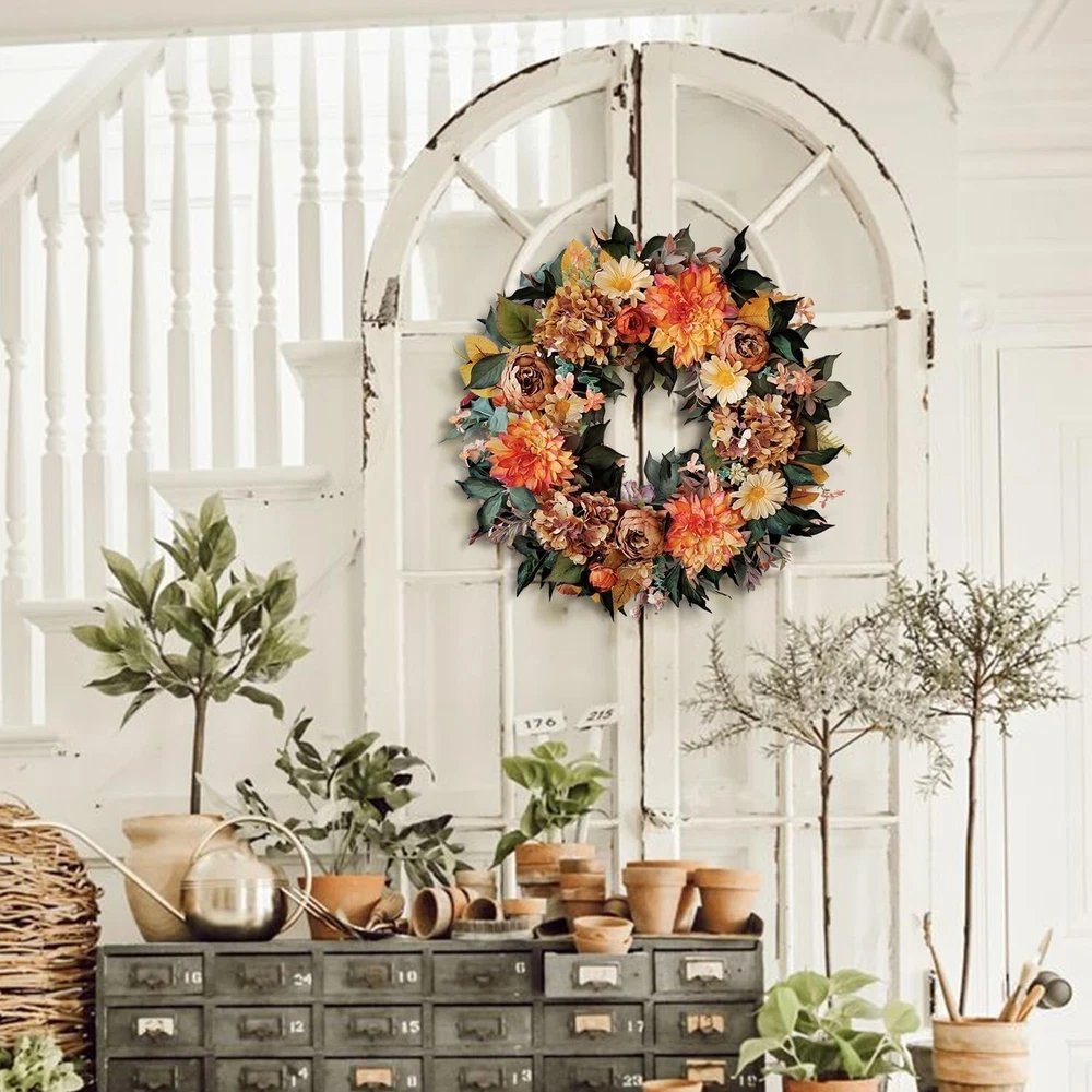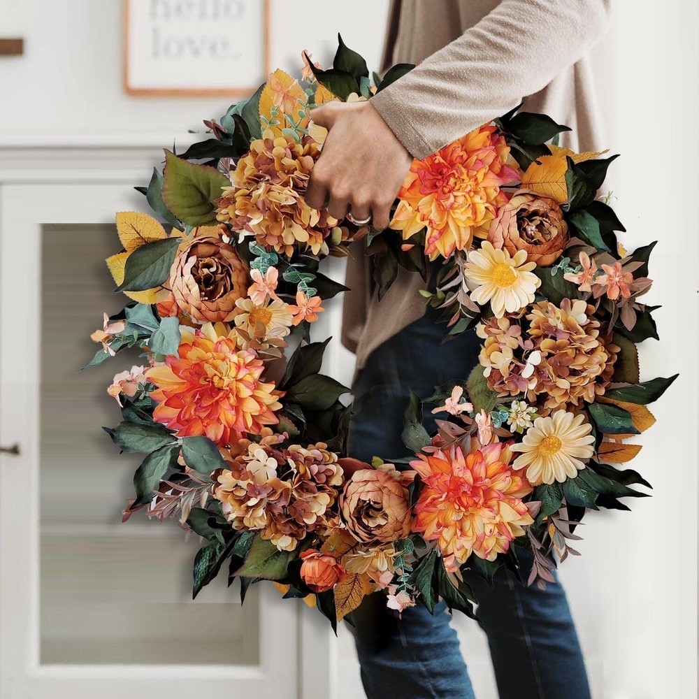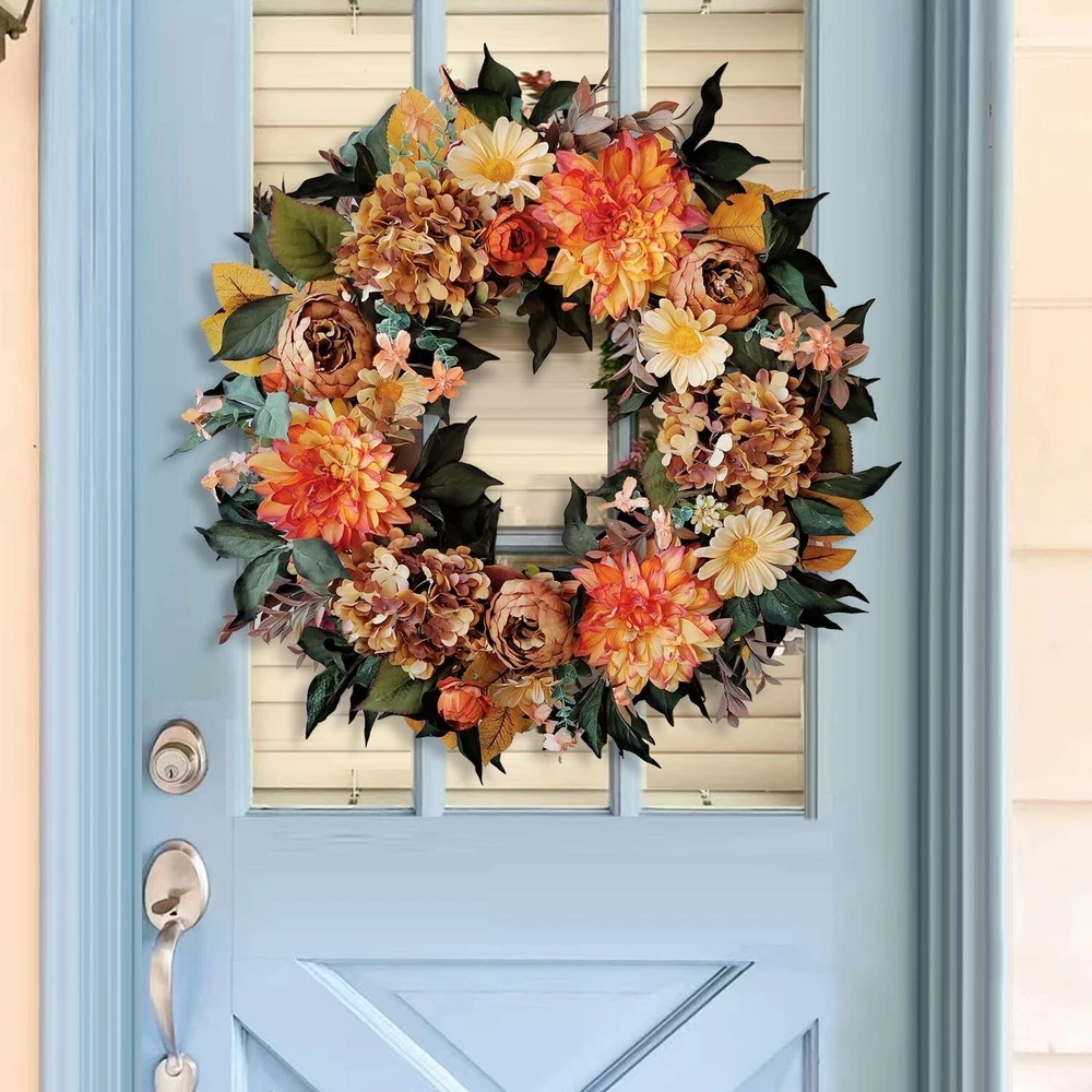 24 Inch Fall Wreath for Front Door with Vintage Hydrangea&Orange Peony and Da...