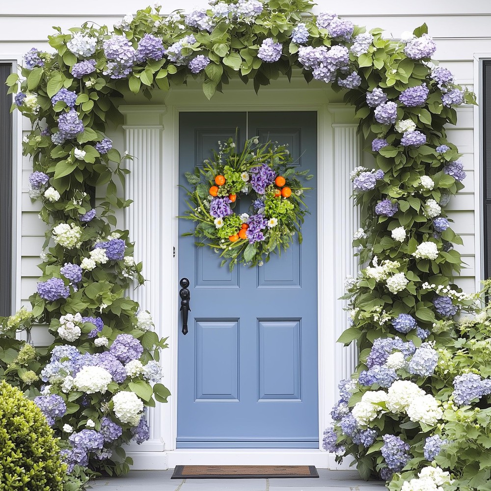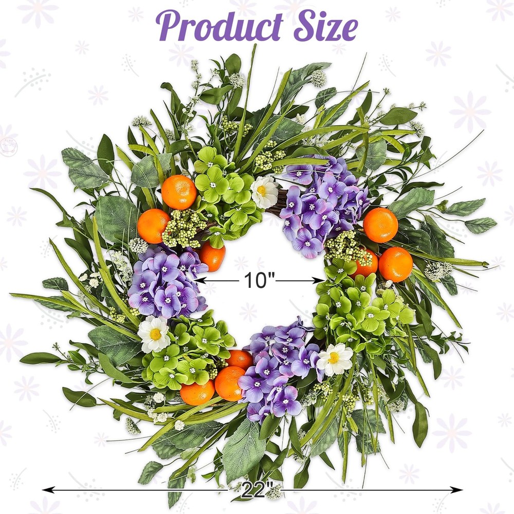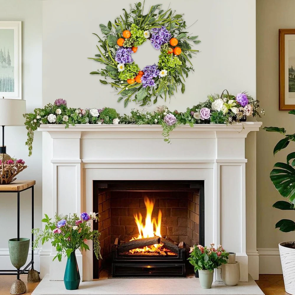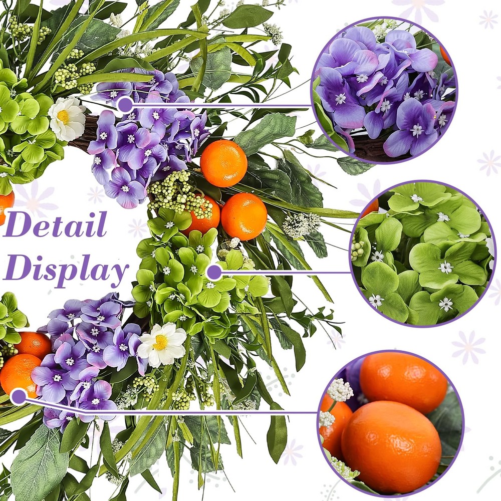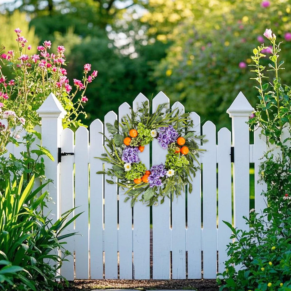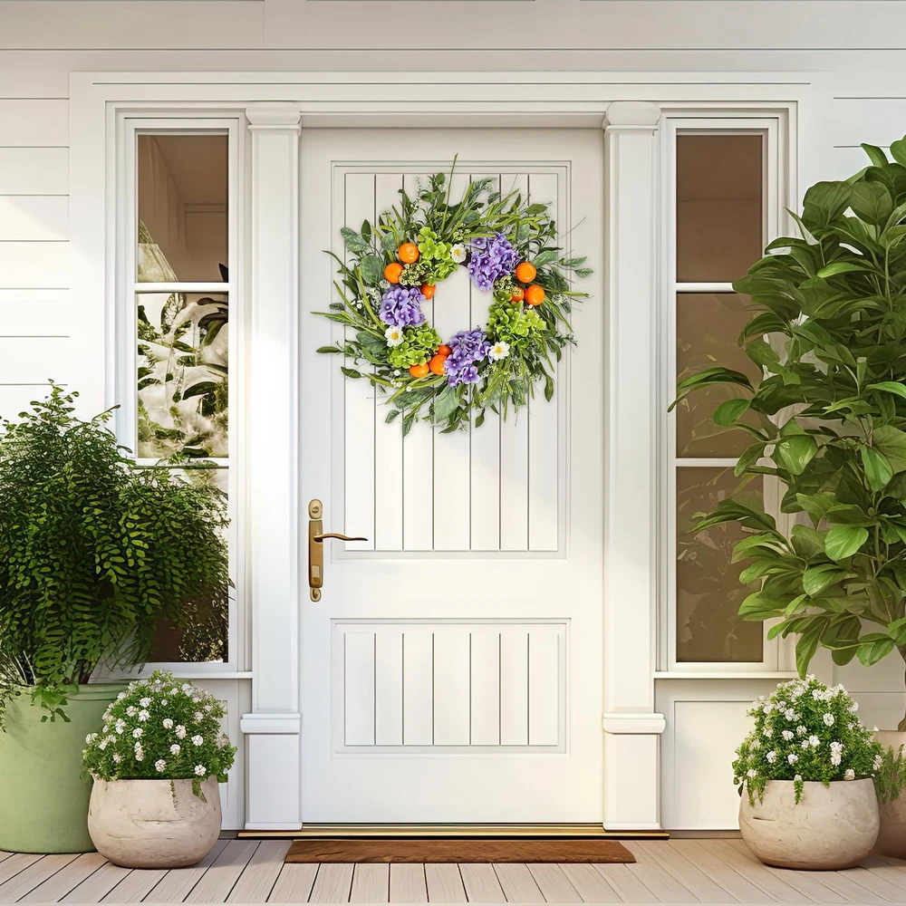 1. This gorgeous wreath adds instant charm to any space—front door, fireplace, or party decor! The lifelike hydrangeas, fruits, and leaves look so realistic, and the high-quality materials make it durable yet eco-friendly. Perfect for spring and summer, it brightens up weddings, farmhouse styles, or everyday decor. Lightweight and easy to hang, it stays vibrant without fading. A must-have for effortless elegance!