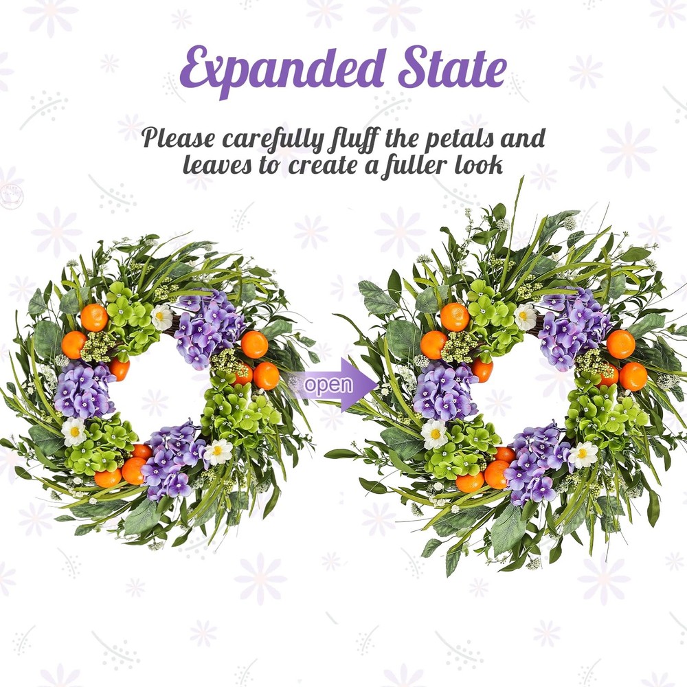 This beautiful artificial wreath is perfect for decorating your front door, porch, wall, window, fireplace, farmhouse, living room, centerpiece party and wedding. At the same time, it can also be used as an unique decoration for various festivals in spring and summer. These flowers and leaves on the spring wreath are made of premium EVA, paper and PET material which are real touch, durable, and environmental friendly. 【Versatile Home Decor】- This beautiful artificial wreath is suitable for decorating your front door, porch, wall, window, fireplace, farmhouse, living room, centerpiece party and wedding. At the same time, it can also be used as an unique decoration for various festivals in spring and summer. It will provide your home a feeling of natural and vitality. 【Realistic Appearance】- These flowers and leaves on the spring wreath are made of premium EVA, paper and PET material which are real touch, durable, and lifelike. This handmade wreath is using hydrangea and realistic fruit on a durable natural grapevine. For spring and summer interior decoration, colorful flowers paired with green leaves make the whole room look lively. 【24 Inch Spring Wreath】- To prevent the wreath from being damaged during transportation, we have tightened the decorations on it, so the wreath you receive will be smaller than its actual size when fluffed. The inner diameter of this artificial wreath is about 9.5" and the outer diameter is about 24". Measurements are at the longest point, tip to tip, display as the pictures. Please carefully fluff the petals and leaves to create a fuller look according to our picture instruction before hanging. 【How to Care for Your Wreath】: Avoid exposing your artificial wreath to direct sunlight and extreme weather conditions. To minimize dust and fading, display them under a form of shade such as a canopy, archway, or pergola. We recommend outdoor display for up to three months per year to keep their colors vibrant. 【How to Care for Your Wreath】: Avoid exposing your artificial wreath to direct sunlight and extreme weather conditions. To minimize dust and fading, display them under a form of shade such as a canopy, archway, or pergola. We recommend outdoor display for up to three months per year to keep their colors vibrant.