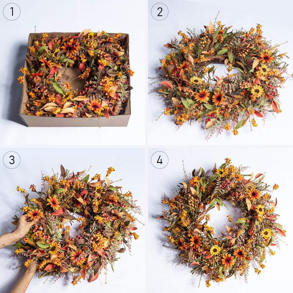 FULL OF FLOWERS AND FOLIAGE-This fall wreath is full of yellow and orange daisies and fall foliage in different colors.There are also many yellow to orange berries included.Our fall wreaths for front door can bring you a strong autumn atmosphere to your home. LARGE SIZE-The outer diameter of the fall wreath is about 24 inches and because it is very full so it’s about 6 inches in depth.If you want to hang it between your front door and storm door,please make sure there’s enough space. DESIGNED FOR FALL DECOR-This fall wreath is suitable for front door, wall,window and farmhouse decor.It can add much more fall color to your season celebration and Thanksgiving. USED INDOORS AND OUTDOORS-This fall wreath can be used indoors and outdoors.But if it is outdoors,please make sure to hang it under cover to avoid direct sunlight and rain.The large autumn wreath is also durable and can be used repeatedly. HIGH-QUALITY-Our fall wreaths for front door are carefully designed and handmade by our professionals.The berries never rot,the flowers never fall,so the fall wreath needs no special cleaning or maintenance.Wipe clean with a dry cloth if you need. 24 Inch Fall Wreaths for Front Door,Suitable for Fall Home Decor and Thanksgiving Celebration Description: Full of yellow and orange daisies and fall foliage in different colors,this large autumn wreath will look great on your front door. Large,Full,Realistic.We believe that when your guests or neighbors see this fall wreaths for front door, you will receive a lot of compliments. Designed for fall,hang this large autumn wreath on your wall or front door to decorate your home. Fall wreaths for front door will be a special gift for your family and friends. Materials:Polyester,Foam,Grapevine. Size:24 Inch. Package:1*Fall Wreaths for Front Door. Note: Since customer satisfaction is our top priority,we are always committed to provide you a positive shopping experience. So if you have any problems with our products ,please don’t hesitate to contact us,we will reply in time and solve the issues as soon as possible.