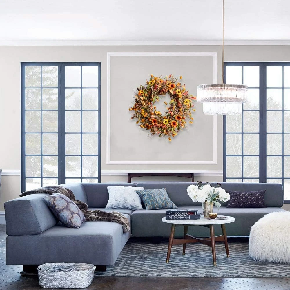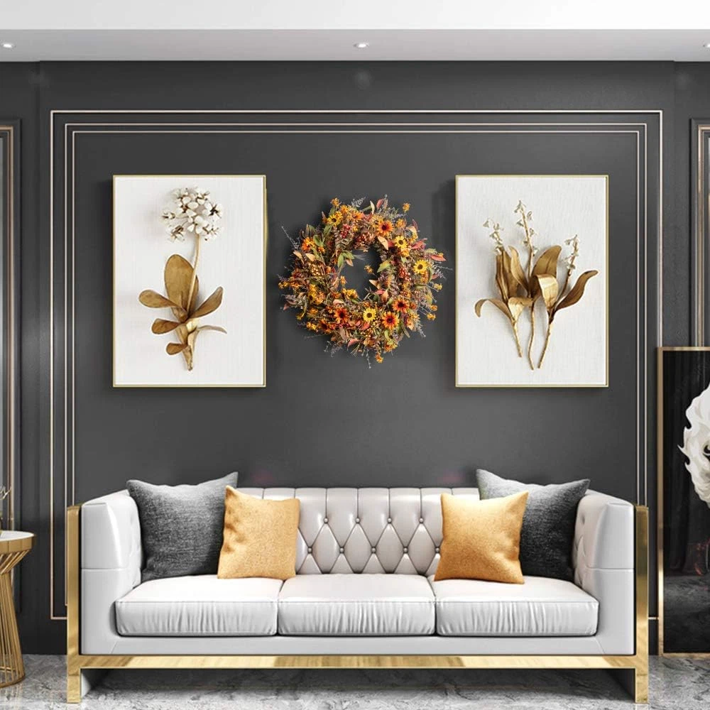 This gorgeous wreath instantly brings cozy autumn vibes to my front door! The mix of yellow and orange daisies, rich foliage, and berries looks so vibrant and full—it’s even prettier in person. The 24-inch size makes a bold statement, and the depth gives it a lush, high-end look. Perfect for sprucing up my porch or even indoors. Arrived well-packed and ready to hang. Absolutely love how it elevates my fall decor without looking cheap or fake. Worth every penny!