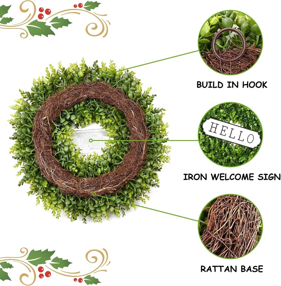 Large Boxwood Wreath Front Door 24'' Artificial Spring Wreath. Wreaths for Front Door Farmhouse Wedding Green Round Indoor Outdoor for Summer Wreath st patrick's day Decoration -Hello Sign All Round Wreath: Add themed decorations according to the seasons and display them in front of the doors and windows, which can be adapted to any season High-Quality Material: Large Spring Summer Wreath Is Made of Artificial Grapevine Bottom And High-Quality Boxwood Wreath, Natural And No Harmful Smell, Indoor Safe to Use Large Wreath: The Artificial Boxwood Wreath Is 24inch In Diameter, Need to Adjust The Leaves to Get The Full Size And Beautiful Appearance Make your spring front door decor stand out Modern Home Decoration: Our Summer Front Door Wreath Can Be Hung Anywhere, Includes A Welcome Iron Sign, Suitable for Indoor-Outdoor Living Room Walls, Windows, Above The Fireplace. Also A Great Choice For Holiday Celebrations or Gift Ideas. Handmade: We Uphold The Artisan Spirit, Each Leaf, And Each Vine Is Not Produced by Machine but Purely by Hand, round wreaths for front door Bringing The Breath of Spring Tips: "HELLO" is removable Should You Have Any Problem With Our Products, Please Immediately contact me, We Will Reach Out to You Asap.