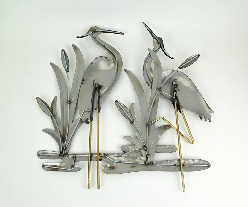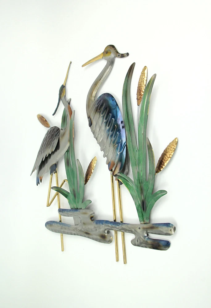 Give your home an air of style and grace with this heron among the reeds sculpture. Creatively crafted from galvanized metal, the hand-painted accents bring this pair of blue herons to life with a touch of rustic appeal. Measuring 24 inches long, 1.75 inches wide, and 23.75 inches high; it sports two built-in hangers for quick and simple hanging with two screws (not included). Makes for a great accent or centerpiece in your living room, bathroom, kitchen, or bedroom; or hang it outside on a fence, near a pool or garden area. Our eBay Store About Us Add to Favorite Sellers 24 Inch Metal Heron Wall Art Hanging Home Garden Decor Indoor Outdoor Sculpture OVERALL SIZE - 24 Inches Long, 1.75 Inches Wide, 23.75 Inches High DURABLE MATERIAL - Crafted From Galvanized Metal For Years Of Maintenance Free Display GRACEFUL STYLE - Depicts A Pair Of Herons Amongst The Reeds EASY INSTALL - Built-In Hangers For Quick And Simple Display With Two Screws (not included) HOME DECOR - Great For A Themed Living Room, Bathroom, Kitchen, Or Bedroom Give your home an air of style and grace with this heron among the reeds sculpture. Creatively crafted from galvanized metal, the hand-painted accents bring this pair of blue herons to life with a touch of rustic appeal. Measuring 24 inches long, 1.75 inches wide, and 23.75 inches high; it sports two built-in hangers for quick and simple hanging with two screws (not included). Makes for a great accent or centerpiece in your living room, bathroom, kitchen, or bedroom; or hang it outside on a fence, near a pool or garden area. Product Details Color Multicolored Height 23.75 Length 24 Weight 2.5 LB