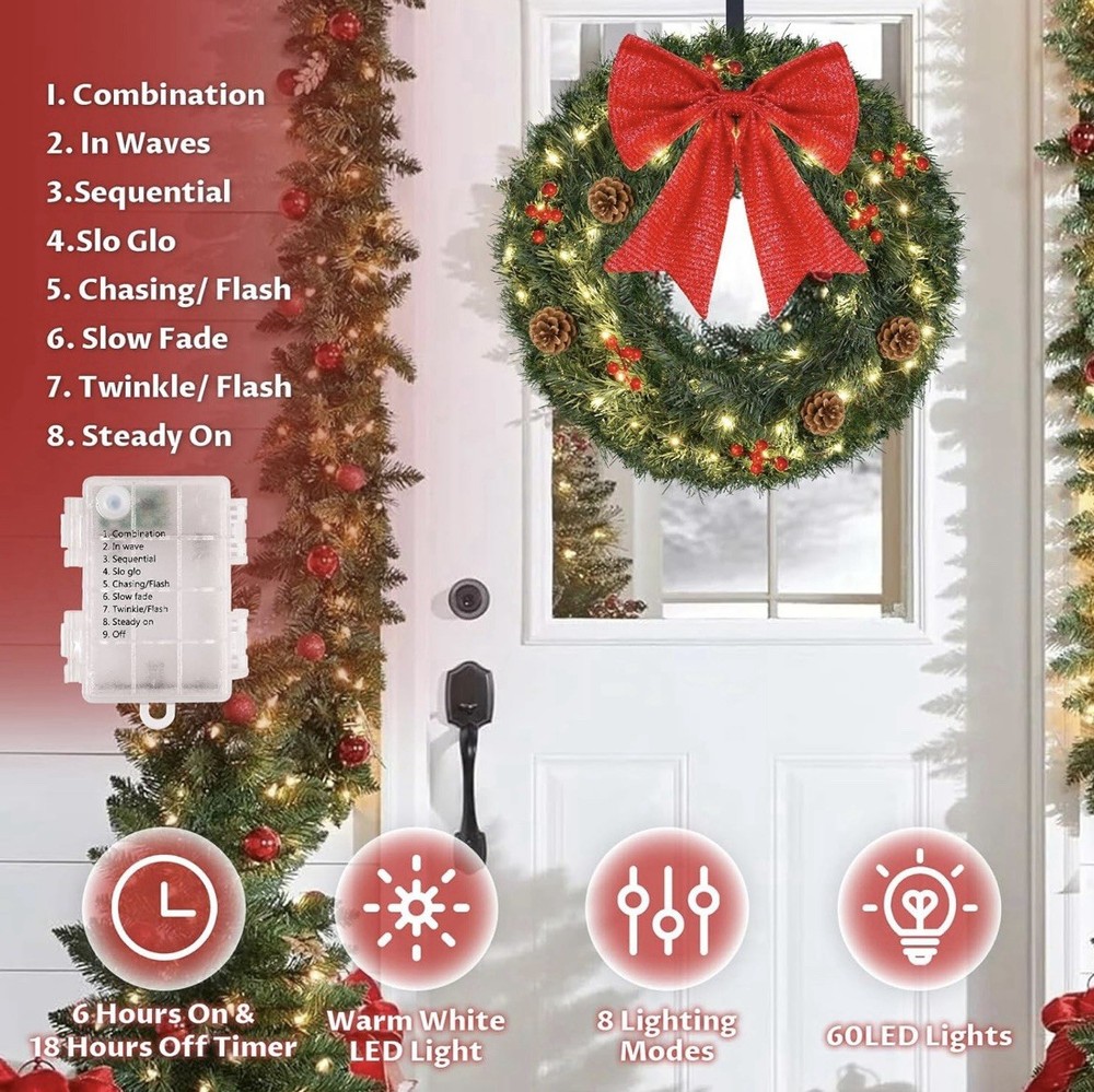 Add a festive touch to your home with this 24" Green Light up Christmas Wreath. It's adorned with warm white and colorful LED lights that create a charming and romantic atmosphere. The wreath comes with a convenient timer, ensuring that the lights turn on and off automatically, day and night. Crafted from durable plastic, this artificial wreath is designed to last for seasons to come. It features a delightful pug in a Christmas wreath style, complete with a bow, hanger, and pinecones for a natural look. Perfect for decorating your door or any space in need of a bit of holiday cheer. Item is New in Box. Box was opened to assure all pieces there. Small damage to box but does not affect wreath! See pics!