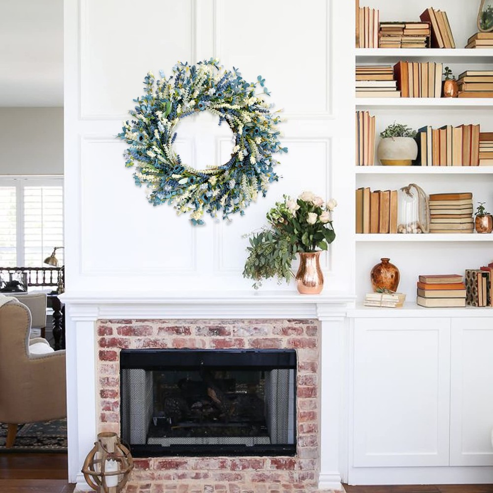 [Blue Flower Wreath For Front Door] Light blue wild flowers matches Lavender flowers and ivory flowers, kinds of flowers mix together makes the wreath thick and large, extra soft touching little leaves give the wreath additional lovely elements, and the whole wreath is life looking. [Blue Flower Wreath For Front Door] Light blue wild flowers matches Lavender flowers and ivory flowers, kinds of flowers mix together makes the wreath thick and large, extra soft touching little leaves give the wreath additional lovely elements, and the whole wreath is life looking. [24 Inch Summer Spring Wreath] The outer diameter of this Spring Summer blue wreath measures 24 Inch, this size is really suitable for who are seeking the large size and leafy full wreath for home decoration, such as hanging on the front door, back door, inside doors and decor your window and yards etc. [Wild Flowers & Lavender Wedding Wreath] If you are planning an romantic spring or summer wreath inside or outside party, this wild flowers lavender wreath will be a good choice as a wedding decorating wreath for hanging on the doors, windows, walls, chairs and cars etc. [Rustic Farmhouse Coastal Wreath] This Style of this floral wreath is rustic and farmhouse, this wreath can be easily matched all kinds of home decorating style, even your door is wood color or metal finish. This Coastal will bring elegant to your home. [Tips] 1.Fluff off the wreath to a perfect shape before hanging. 2.Please indoor use and covered outdoor use to keep the wreath long-lasting.