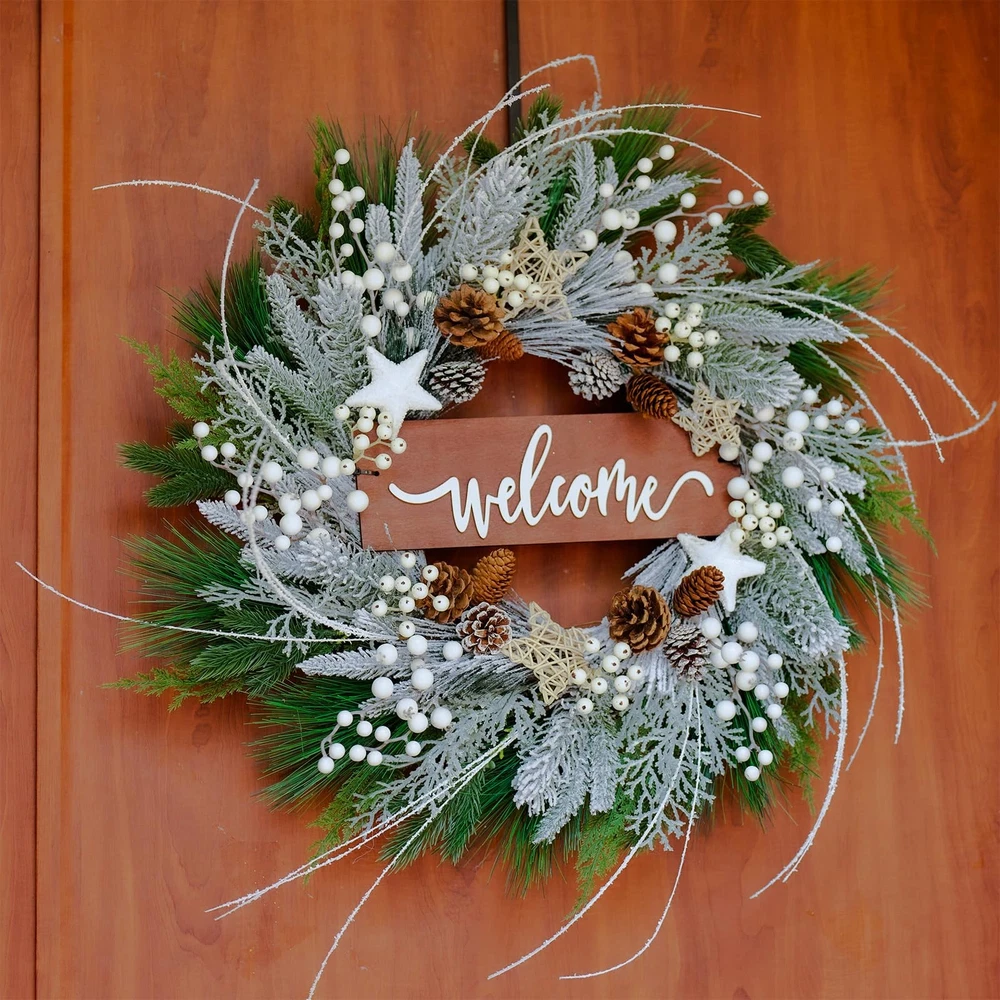 Eye-catching Christmas Wreaths for Front Door,Suitable for Farmhouse Home Door Decor and Spring Winter Christmas Festival Celebration Green Wreath Feature Handmade; Full and Realistic; Durable&High Quality; Premium Materials; Lush Appearance; Vibrant Colors We believe that when your guests or neighbors see this spring wreaths for front door, you will receive a lot of compliments. Designed for spring summer fall winter all season year round,hang this large winter wreath on your wall or front door to decorate your home. Green wreaths for front door will be a special gift for your family and friends. Materials Silk, Polyester, Foam, Grapevine. Size 22-24 Inch. Please Note The green wreath is durable and can be used indoors and outdoors, but please avoid direct sunlight and rain. So if you have any problems with our products ,please don’t hesitate to contact us,we will reply in time and solve the issues as soon as possible Unique Christmas Door Wreath:The Christmas wreaths for front door is based on green and white pine needles, adorned with white berries of varying sizes and brown pine cones. It features an eye-catching "Welcome" wooden logo in the center. This simple but exquisite design makes this greener wreath a bright landscape on the front door, instantly enhancing the festive atmosphere High Quality Welcome Wreath:The vibrant and realistic winter front door wreath handcrafted by professional florists,they have rich experience and skills with great attention to detail and craftsmanship! So the winter wreath for door is very sturdy and durable,not easy to fall off Full In Shape & Premium Materials:This fall outdoor winter wreath's fake greenery, various grain berries and colorful flowers are made of premium silk, sponge, professional paper and natural vines base! Sufficient materials were used for each greener wreath,so the winter outdoor wreath looks very full and no bald spots Multi-functional Christmas Decorations For Home:The large winter front door wreath could be used indoor outdoor fall door decor,Winter welcome sign.Of course the winter pinecones wreath also Ideal for farmhouse home wall,door,window,kitchen,living room,window,fireplace,front porch decor.It can also be used on harvest day and Thanksgiving,Christmas to add holiday color and warmth to your home Easy To Adjust:To prevent the winter outdoor wreath from being damaged during transportation,the big outdoor christmas wreath packed tightly in a sturdy 14 inch box.So before hanging,please refer to product instruction card to adjust the fluffiness of the fall leaves wreath between to make it look fuller and more beautiful Perfect Size:The winter wreaths for front door outside is about 22-24 inches in diameter when fully unfolded. It can be easily bent to reshape- please expand and fluff the roots to achieve the fullness required for the wreath. Reusable Cedar Wreath:The large everyday wreath is durable, can be used indoors and outdoors.Delivered with a premium brown box to store the front door wreath,which will protect your gorgeous winter wreath when the season is over. Also, it can be regarded as a gift for your family and friends