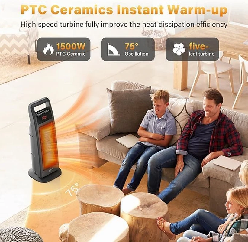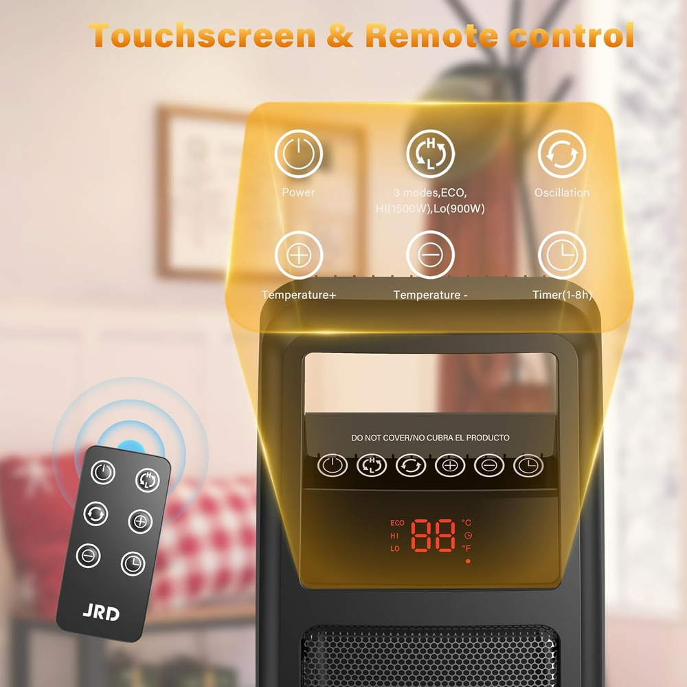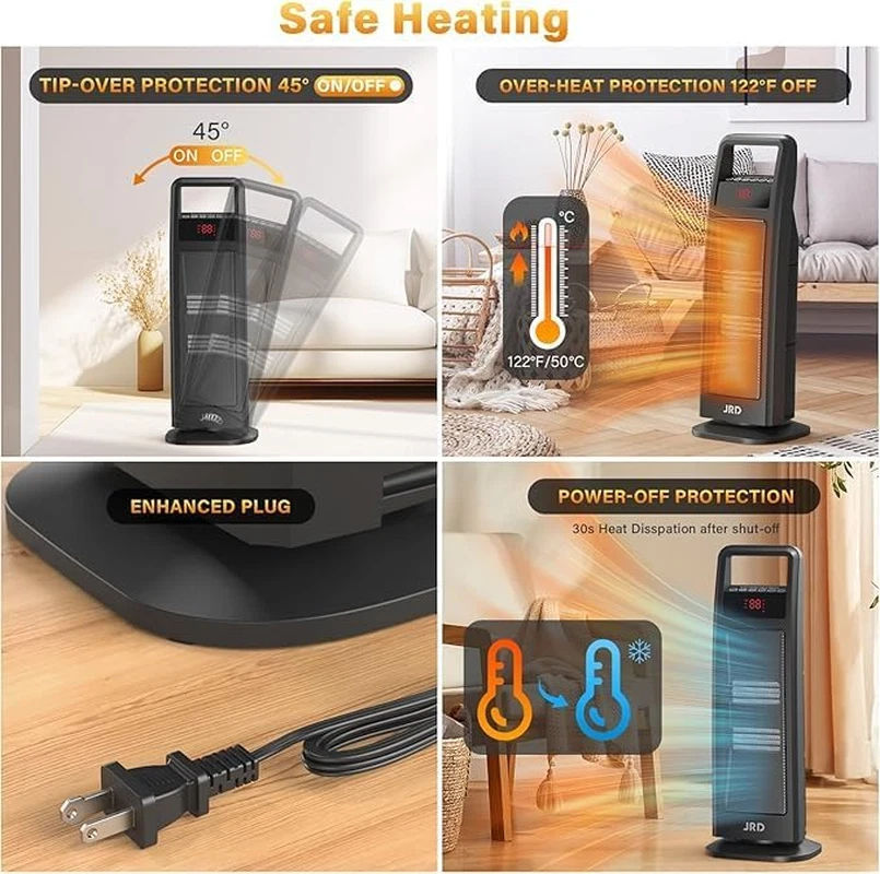 【Powerful and Faster Heat】The indoor space heater with 1500W advanced PTC Ceramic Heating, providing rapid and efficient heating in seconds, can quickly heat an area of 300 square feet. The heater boasts 75°oscillation, ensuring efficient and widespread heating in your room 【Multiple Safety Protection】The electric heater with ETL-Certified Safety, made of V-0 flame retardant materialsand avoiding any fire hazard. It will shut off automaticlly when reaches limit 122 °F or left unattended for 12 hours. Reinforced plug to ensure the heater is safe to use at all times, perfect choice for families with children and pets 【Energy-saving Eco mode】The space heater for indoor use allows you to choose the mode you like(High/Low/ECO Mode), HI mode support instant heat in seconds(1500W). Smart ECO Mode features a 41-90°F thermostat in 1°F increments that independently adjusts its power (900W or 1500W) based on ambient temperature, keeping your room at constant temperature and saving more energy bills throughout cold days 【Easy to Use】With one-touch control panel , it is easy to change the temperature and mode. You can also use the remote control to operate the heater from up to 24 feet away while working. The portable design combined with the ergonomic built-in handle, will allow you to easily move your space heater to any room you want. Keep your office, kitchen, bedroom, guest room, study or living room warm always in Winter 【Noiseless Experience】Operating at just 36dB, this room heater utilizes oblique airflow technology to effectively reduce wind noise, making it 12% quieter than traditional electric heaters. It is comfortably quiet to use in a bedroom while sleeping. Ideal to set this portable heater wherever you want to make it warm 【Easy Assembly and After-sales】It jsut takes 1 miniutes to assemble the base to enjoy the heater immediately. We offer a 12-month money-back guarantee, lifetime after-sales support, as well as round-the-clock online service for 12 hours every day.(remote 2AAA batteries not included) Product Description 1 Tip-over protection 2 Overheat protection 3 ETL listed 4 Safety Material 5 30s Heat Disspation 1-8H Timer Function Set your timer from 1 hour to 8 hours before going to bed, saving energy and preventing overheating