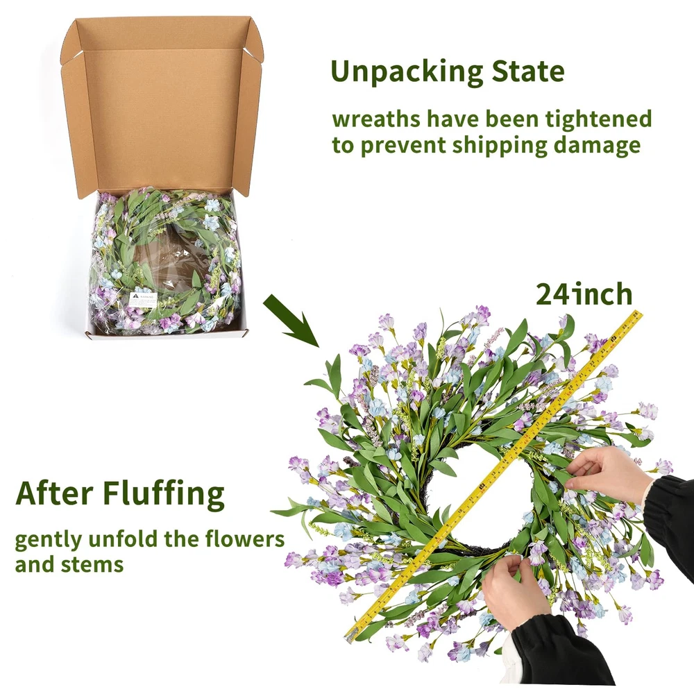 24 Inch Spring Wreath 【Material】The Spring wreaths for front door is made of EVA and paper, and the base is made of grapevines, purely handmade. No need to worry about falling or wilting. Rich color matching, suitable for any decoration scene, full of strong artistic flavor 【All Season Wreaths Decor】The garlands for decoration is suitable for living room, bedroom, dining room, fireplace, window, wall, mirror, porch, balcony, stairs, shop, office, hotel, wedding, villa, photography background and more. The Spring door wreath can be used all year round, for your home brings unlimited energy, color and perfect decorative effect 【24'' Large Door Wreath】To protect it from damage during shipping, the spring wreath is folded. The maximum adjusted size is about 24 inches. You can gently expand the flowers and stems as needed to adjust to the desired effect and shape 【Tips】Since the spring wreaths for front door is made of paper, avoid contact with rain and water. It can be used indoors and outdoors. For outdoor use, it is recommended to hang it on a covered porch out of direct sunlight, rain and snowfall to prevent the wreath from fading 【110% Satisfaction】Since the Spring door wreath are handmade, each wreath is unique, so there will be a slight variation in size and appearance. If you find any problems after receiving the goods, please click ''Contact Seller'' to contact us and we will definitely give you a perfect reply as soon as possible (within 24 hours)