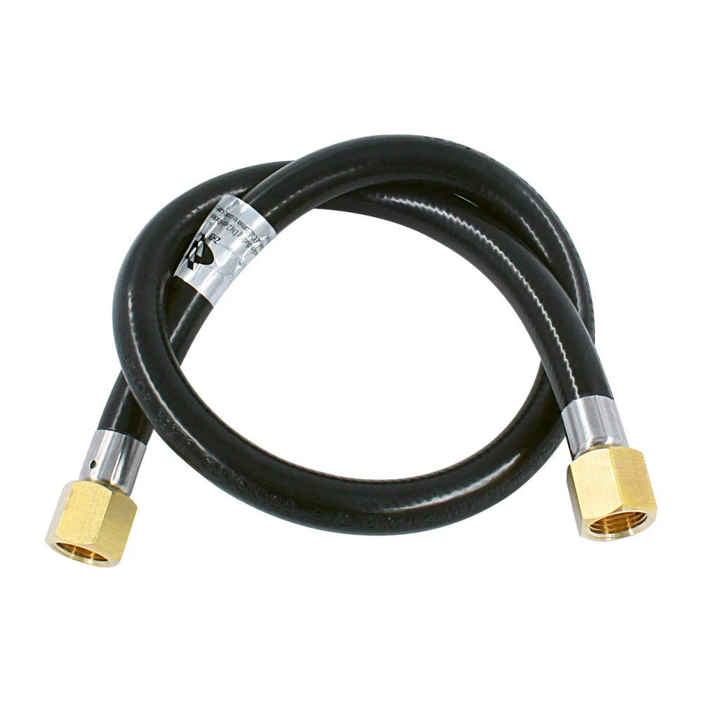 - Firepalce Flex Black PVC Rubber Hose 24Inches Long Low Pressure Rating 1PSI Max. - 3/8"Swivel Flare Female Ends on Both side - Suitable for any gas appliance hose extension or inlet Connection, Mostly for BBQ Grill, Fireplaces, Fire Pit Propane. - Standard flare fittings in Solid Brass - CSA approved hose 5/16" Inner Diameter