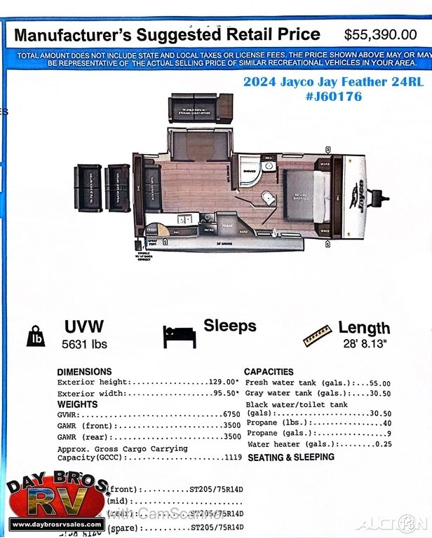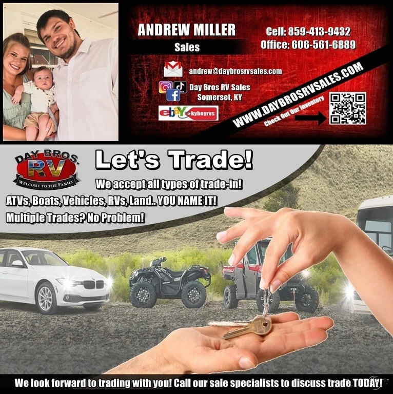 Vehicle Information Year: 2024 Make: Jayco Model: Jay Feather Condition: New Contact Day Bros RV Sales 3054 South Laurel Rd London Kentucky 40744 View Map Ask for: Andrew Miller Contact: Contact Us Office: (866) 822-2319 Hours Mon, Tues, Thurs, Fri: 09:00 AM-06:00 PM EST Wednesday: 09:00 AM-05:00 PM EST Saturday: 09:00 AM-04:30 PM EST Sunday: Closed Why Buy From Day Bros In Kentucky **Click "See full description" in Item Description for more specs and photos!** Come visit us in scenic Laurel County, KY! Our location in London, KY is just five miles off Exit 38 on I-75 and places us in the middle of some of the most beautiful scenery in the country. We're just north of Cumberland Fall State Resort Park, a vacation destination that's home to the "Niagara of the South." Cumberland Falls is one of the largest waterfalls in North America and one of the precious few places in the world where you can see a moonbow. People come from all across America to take in the beauty of this local treasure, and with its RV park you can make a long weekend of your purchase from Day Bros. It's also home to miles of hiking trails, making it the perfect RV destination. Come on by and plan to stay for a few days after you drive your new purchase off the lot! If anything goes wrong, we're right here to help make sure you make that long drive home with a reliable coach. A little closer but no less beautiful is Levi Jackson State Park, which is just up the road from our dealership. A historic park encompassing nearly 900 acres, you can visit parts of the Wilderness Road, where early settlers traveled to reach Kentucky. You can retrace the steps of Wilderness Road with two hiking trails totaling 8.5 miles. Levi Jackson is also home to an RV park for that long weekend--why not celebrate the purchase of your new coach with a mini vacation! Levi Jackson also boasts the Mountain Life Museum, which brings visitors into a pioneer settlement for some historic fun every Friday and Saturday Memorial Day through Halloween. Don't hesitate to ask us where to find good food and good fun in the local towns while you're here. London and Corbin are experiencing an exciting downtown revival of great food and local shops, and if you give us a call you can schedule a visit during one of our famous events, such as the World Chicken Festival. We want your RV buying experience to be a fun as possible and our location means there's plenty to be had. To get started on your RV buying journey, call us at 1-866-546-9579 or visit our website at www.daybrosrvsales.com NOTE: Some of our RVs are located at our NEW location in Monticello, KY! See pictures for more info. Andrew Miller (866) 822-2319 3054 South Laurel Rd London Kentucky 40744 Day Bros RV Is Located In Scenic London, KY Credit Application Directions to Dealer Contact Us BBB Accredited Business London, KY Monticello, KY 24 Jayco Jay Feather 24RL Travel Trailer Towable RV Camper Slide Theater Seats Video Apply Now Secure Credit Application Applying for a vehicle loan online is one of the quickest and easiest application methods. Our secure application is easy to complete, all you need are a few personal and employment details. Credit Application Directions to Dealer Contact Us Options and Standard Features Basic Information Year: 2024 Make: Jayco Model: Jay Feather Trim: 24RL Stock Number: J60176 VIN: 1UJBB0BN8R1J60176 Condition: New Type: Travel Trailer Length (Feet): 29 Sleeping Capacity: 4 Title: Clean Exterior Exterior Color: White Interior Interior Color: White Convenience Leveling Jacks Included: Standard Slide-Outs & Awnings Slide Outs: 1 Awnings: 1 Holding Tanks Water Capacity (Gallons): 51-60 Specifications GVWR (lbs): 6750.00 Hitch Weight (lbs): 640.00 Similar Vehicles Check out similar vehicles in our inventory. View Inventory Welcome Section Welcome Day Bros RV Sales is located in the Southeastern part of KY in the town of London, 5 miles off of exit 38 from I-75. We are one of the fastest growing dealerships in the Southeastern United States. We also have a location in Monticello, KY near Lake Cumberland and Somerset, KY to serve even more customers and make sure our stellar service is even easier to access! We’ve built our business from a small used RV lot to one of Kentucky’s top sellers of incredible brands such as Thor Motor Coach, Winnebago, Holiday Rambler, Coachmen, Tiffin, Forest River and more! Our expert staff work in perfect harmony to make sure our customers have a wonderful experience from selection to financing to driving their unit off the lot, and our certified technicians make sure you’re taken care of for the life of your rig. We have been selling motorhomes on eBay for over 27 years, and in that time we’ve become a top seller with 100 percent positive feedback. We have one of the largest selections of new and pre-owned motorhomes, 5th wheels, and travel trailers. We have been family owned and operated for over 25 years and we're still growing! Sales Department 1-866-546-9579 Our team is absolutely the best in going above and beyond to make your eBay buying experience a great one. With over 100 combined years of industry experience our helpful team understands RVs. Whether you know what you want or you’ve yet to make up your mind, our sales team can guide you through the selection process without pressure to buy. Day Bros understands you’re making a big purchase, and we can give you all the information you need to make sure it’s the perfect purchase for you. We also accept trades. We can give you an estimate on a trade in as little as 15 minutes. If you have questions, or want to talk about a trade-in, call us at (866) 546-9579, visit us at www.daybrosrvsales.com, or email us at sales@daybrosrvsales.com Parts & Service Department 1-866-546-9579 Our business is located on acreage of easy to access blacktop--there’s no mystery on where to pull in or how to maneuver into our 18-bay service and full body collision center. We have a full servi