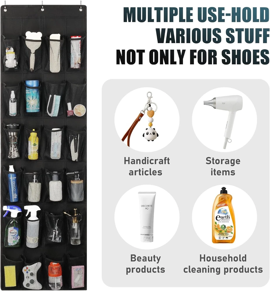 24 Large Pockets Upgraded Over the Door Shoe Organizer, Enhanced Black Product Details Specific Uses For Product: Shoes Material: Non-Woven Mesh Special Feature: Portable, Moistureproof, Abrasion Resistant, Foldable Color: Black Brand: HARBULE Product Dimensions: 62"D x 4.5"W x 19"H Shape: Rectangular Capacity: 4E+1 Pounds Unit Count: 1.0 Count Number of Items: 1 Maximum Weight Recommendation: 40 Pounds Manufacturer: HARBULE Part Number: over the door shoe organizer Item Weight: 0.317 ounces Country of Origin: China Item model number: Triple Hook 24 Compartment Hanging Bag Item Package Quantity: 1 Special Features: Portable, Moistureproof, Abrasion Resistant, Foldable Included Components: Hooks Batteries Included?: No Batteries Required?: No Specific Uses For Product: Shoes Material: Non-Woven Mesh Special Feature: Portable, Moistureproof, Abrasion Resistant, Foldable Color: Black Brand: HARBULE Product Dimensions: 62"D x 4.5"W x 19"H Shape: Rectangular Capacity: 4E+1 Pounds Unit Count: 1.0 Count Number of Items: 1 Mounting TypeNumber of Compartments: Hanging Mount24 DIFFERENT FROM OTHERS: This door hanging shoe storage box has 24 pockets and can hold up to 40 pounds of items. Contains three V-elcro stickers to prevent shaking, made of durable non-woven fabric with thick stitching and tear resistance. Durable and able to accommodate all your shoes. HIGH QUALITY BREATHABLE MATERIAL: This hanging shoe rack for door has high breathability, and the mesh pocket promotes air circulation, allowing the shoes to dry quickly. In addition, the transparent mesh fabric makes it easy to quickly find each pair of shoes. NOT JUST FOR SHOES: Measures 62 by 19 inches with each pocket measuring 7.8 by 4.3 inches,over the door shoe rack superior choice for storing nearly anything.Easily store crafting supplies, pantry items, beauty items, or household cleaning supplies in a highly organized and efficient manner. NO HARDWARE SETUP REQUIRED: Organizers can easily hang this hanging shoe rack for closeton most doors, including closets, mud rooms, bathrooms, garages, and other places. Say goodbye to bulky storage boxes that consume valuable space. Eazy to fold, and convenient to store when not in use. YOU WILL GET: 1* shoe rack for front door entrance Pocket, 3* Over the Door Hooks, 3* Double Sided Tape. Each pocket is 9-1/2“ high and 4-1/3” Warm tips adult shoes in a bag to put a shoe more convenient to take and put.If you have any questions, please feel free to contact us, we will reply you within 24 hours.