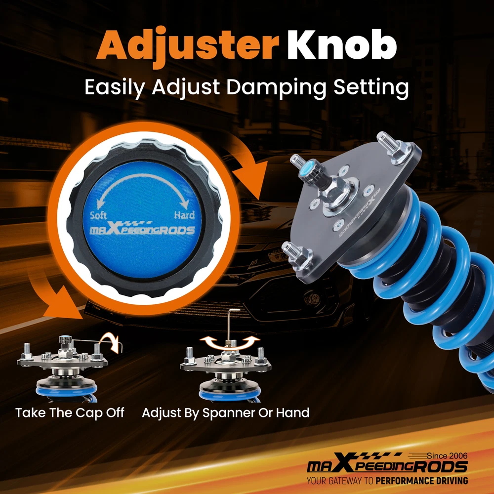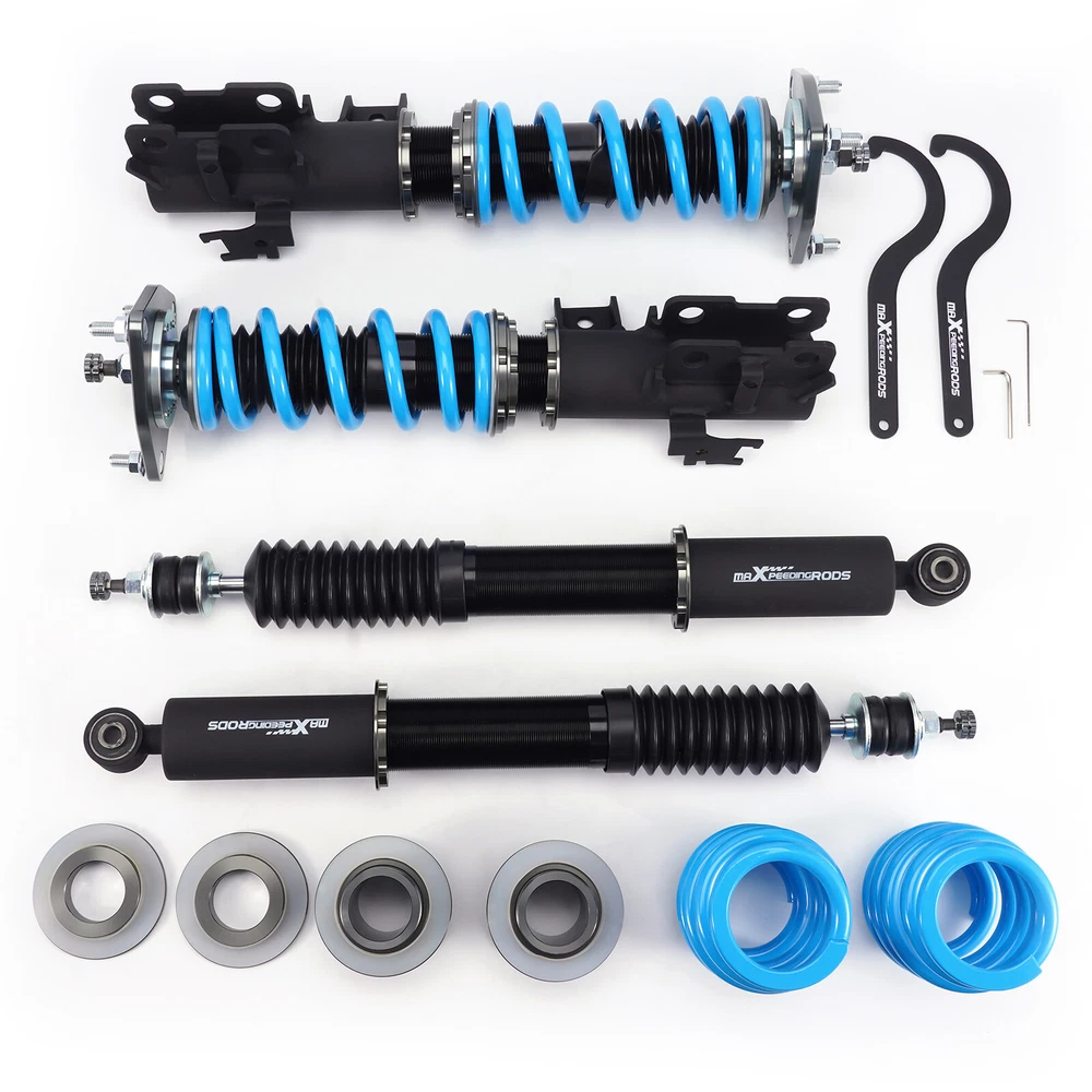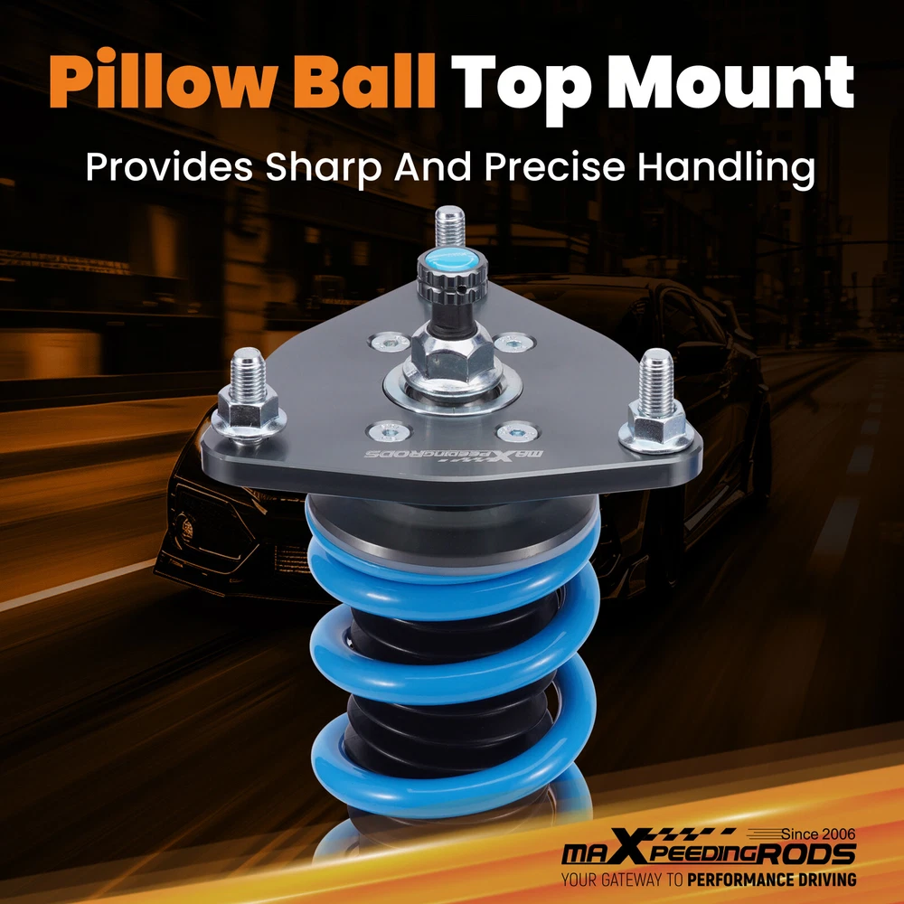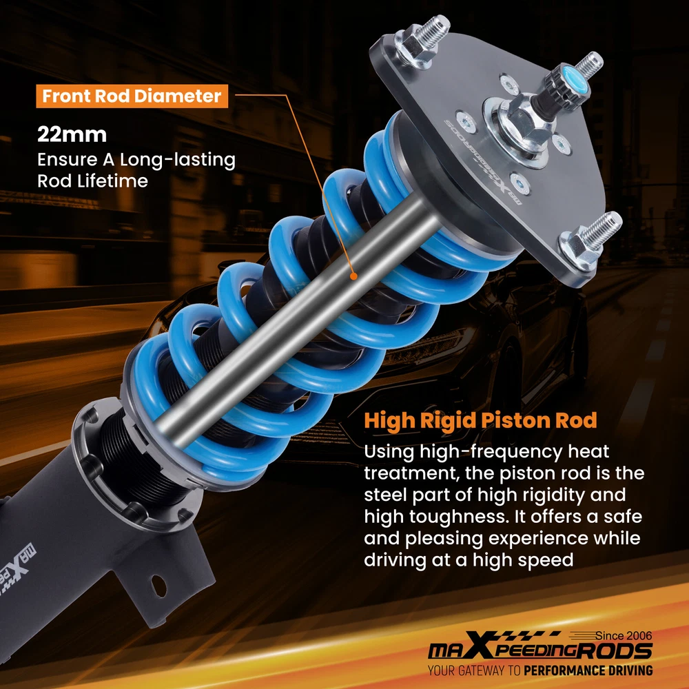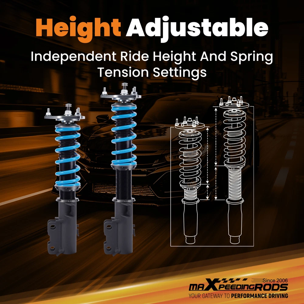 ZJPSS 24 Level Damper Adjustable Coilovers Lowering Coils For Scion xB 2008-2016 MaXpeedingrods T6 Coilovers Suspension Kit Front + Rear For Scion XB 2008-2015 Drops From 1 to 3 Inch From Factory Ride Height Full Threaded Absorber Tube Casing For Independent Height Adjustment. Rebound Damping Force Adjustable 24 Step To Adjust Soft / Hard Adjustment According To Your Preference. Durable Cold Wound Steel & Heat Treated Coils High Rigidity 55CrSi Steel Cold-bent Coil Springs - Over 600k Continuously Stress Test With 0.04% Distortion Rate. Specification Front Spring rate 8 kg/mm (448 lbs/in) Rear Spring rate 7 kg/mm(392 lbs/in) Front Spring length 200 mm Rear Spring length 140 mm Front spring inner diameter 62 mm Rear spring inner diameter 62 mm Adjustable camber plate Yes Damping adjustable Yes, 24 levels of rebound damping force Height adjustable Yes, lowering 25-75mm depending on the vehicle models Package included 2 Front + 2 Rear Warranty 2 Years MaXpeedingrods T6 lowering coilover, features 24 clicks adjustable rebound damping, independent ride height and spring tension settings, developed high viscosity index damping oil, 55CrSi steel cold-bent springs and decent outlook to provide perfect balance between comfort and performance. This suspension system is ideal for daily driving and occasional, light track use. High quality components are adopted to ensure product durability and stability. Each application is fully test fitted and completely road tested to guarantee all our customers perfect performance and comfort expectations. Features 1. Lowered height adjustment from 1" - 3" which allow lower center of gravity and also add a more aggressive stance. 2. Adjustable pre-load spring tension to reduce the shaking motion to a certain extent. 3. High Viscosity Index damper oil ---make damping more stable and smooth in wide temperature range. 4. 24 Clicks of Rebound Adjustments -- This allows you the ability to perfectly dial in your coilovers system. For a nice comfortable driving, set damping to full soft. For more spirited driving, set it to 16 clicks. For occasional track days, set it to full stiff. 5. CNC machined Aluminum top mounts and lockers -- - excellent strength, and save weight 6. High Rigidity 55CrSi Steel Cold-bent Coil Springs --- more than 600,000 times continuously test to assure it's high tensile strength. 7. All inserts come with fitted long rubber boots --- To protect the damper more well and be durable. 8. Advanced Twin-Tube Technology ---provides excellent handling & control characteristics for most driving conditions. 9. Anodized Shock Body With Anti-Corrosion Coating - Anodized Aluminum And Powder Coated Carbon Steel Parts. 10. Test for the best ---Every parts were tested on our professional machine before assembled and tested by our professional racers on road. 11. Clean room assembled ---maintain higher level of accuracy and reliability. Fitment For Scion XB 2008-2015 Specification - Damping adjustable: Available, 24 levels of rebound damping force - Shock structure type: twin -tube - Front top mount structure: Pillow ball - Rear top mount structure: OE top mount required - Camber adjustable: Not available - Height adjustable: Yes, lowering 25-75mm depending on the vehicle models - Spring Rate Front: 8 kg/mm (448 lbs/in) - Spring Rate Rear: 7 kg/mm(392 lbs/in) - Front spring inner diameter: 62 mm - Rear spring inner diameter: 62 mm - Spring length Front: 200 mm - Spring length Rear: 140 mm - Spring Preload advised: 7-10 mm - Color: Black body with blue spring Package included 2x Front coil-overs 2x Rear shock absorbers 2x Rear spring kits 1x Allen wrench 2x C spanners ★ 30-day Money Back & 24-Month Replacement Guarantee. Please feel free to contact us if there is any question. Height Adjustable Lowering Kit; 24 Clicks of Rebound Damping Force Adjustment; Independent Ride Height And Spring Tension Settings; High Rigidity 55CrSi Steel Cold-bent Springs; Anodized Shock Body With Anti-Corrosion Coating; Full 2 Years Warranty From Date Of Purchase. Other items you might also like Street GT35 GT3582 Universal Turbo Anti-Surge T3 Flange 4 Bolts Turbocharger Upgrade GT35 GT3582 Universal Turbo Anti-Surge T3 Flange 4 Bolts Turbocharger Engine Crankshaft & Connecting Rods for Toyota Highlander Camry 2.4L 2002-2009 Crankshaft Connecting Rods & Bearings Kit for Toyota 2.4L 2AZ-FE 13401-28030 Shipping Terms of Sales Payment Contact us All orders will be shipped within 1 business day after payment has been processed. For orders placed before 5:30 AM PST on business days, most items will be shipped out on the same day. All orders will be shipped with a tracking number via USPS, UPS, or FedEx Express and delivered within 2-6 business days We do not ship to P.O. Boxes, APO/FPO addresses, or Military Mail Boxes. Please ensure your address is confirmed by PayPal before checkout, as we only ship to confirmed addresses. 30-day free return and money back guarantee If you are not satisfied with your purchase, you can return the item with its original packaging to us for a full refund with no restocking fee. Please note that the return cost should be paid by the seller. One Year Unlimited Mileage Quality Guarantee If you receive incorrect items, items that are damaged during transportation, or defective items, we will accept returns and cover the return freight. Please note that the return cost should be prepaid by the buyer. After inspecting the faulty item, we will issue a refund of the return cost to the buyer. We offer a full refund or replacement for all faulty items, which includes the cost of original shipping. Please contact us before initiating a return. Our representatives will provide you with detailed instructions on how to proceed. Our guarantee covers only the cost of the item. We are not responsible for installation or other fees, such as labor, towing, additional repairs, or related expenses. We only accept payment through Paypal for all orders, which should be made t