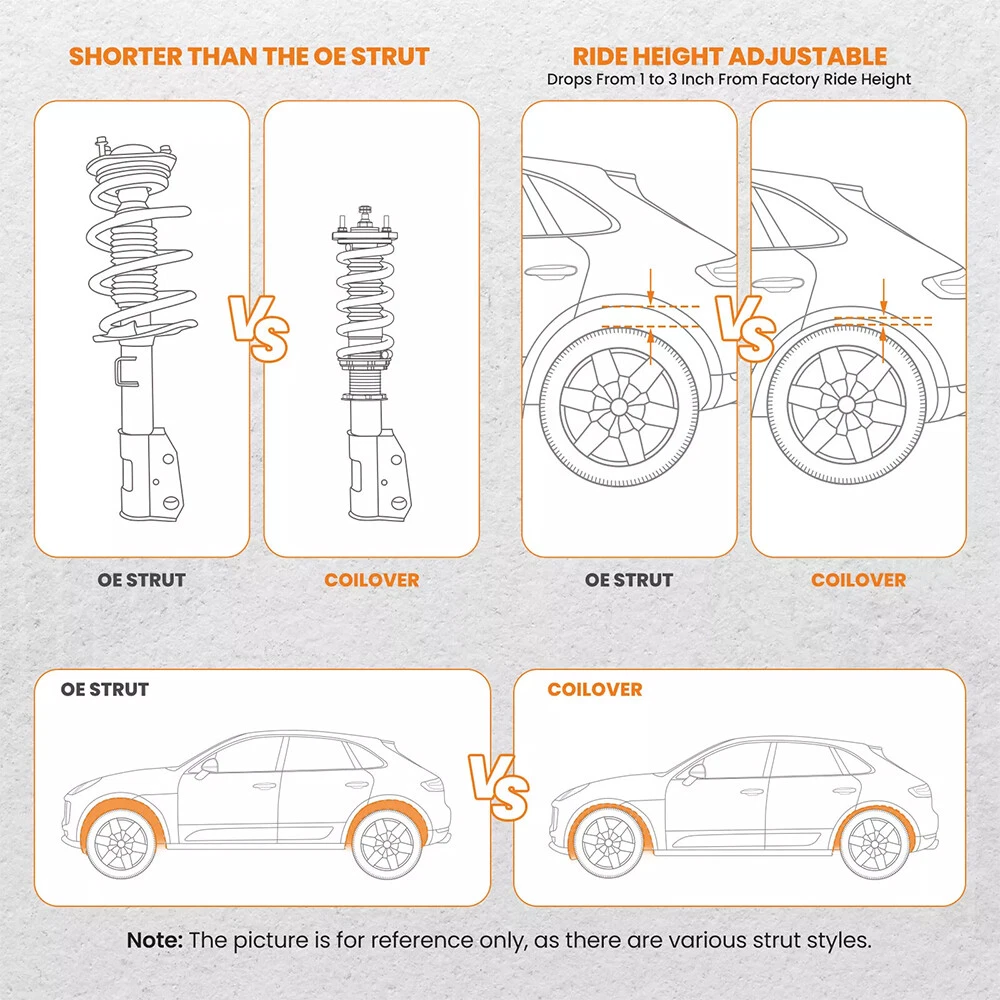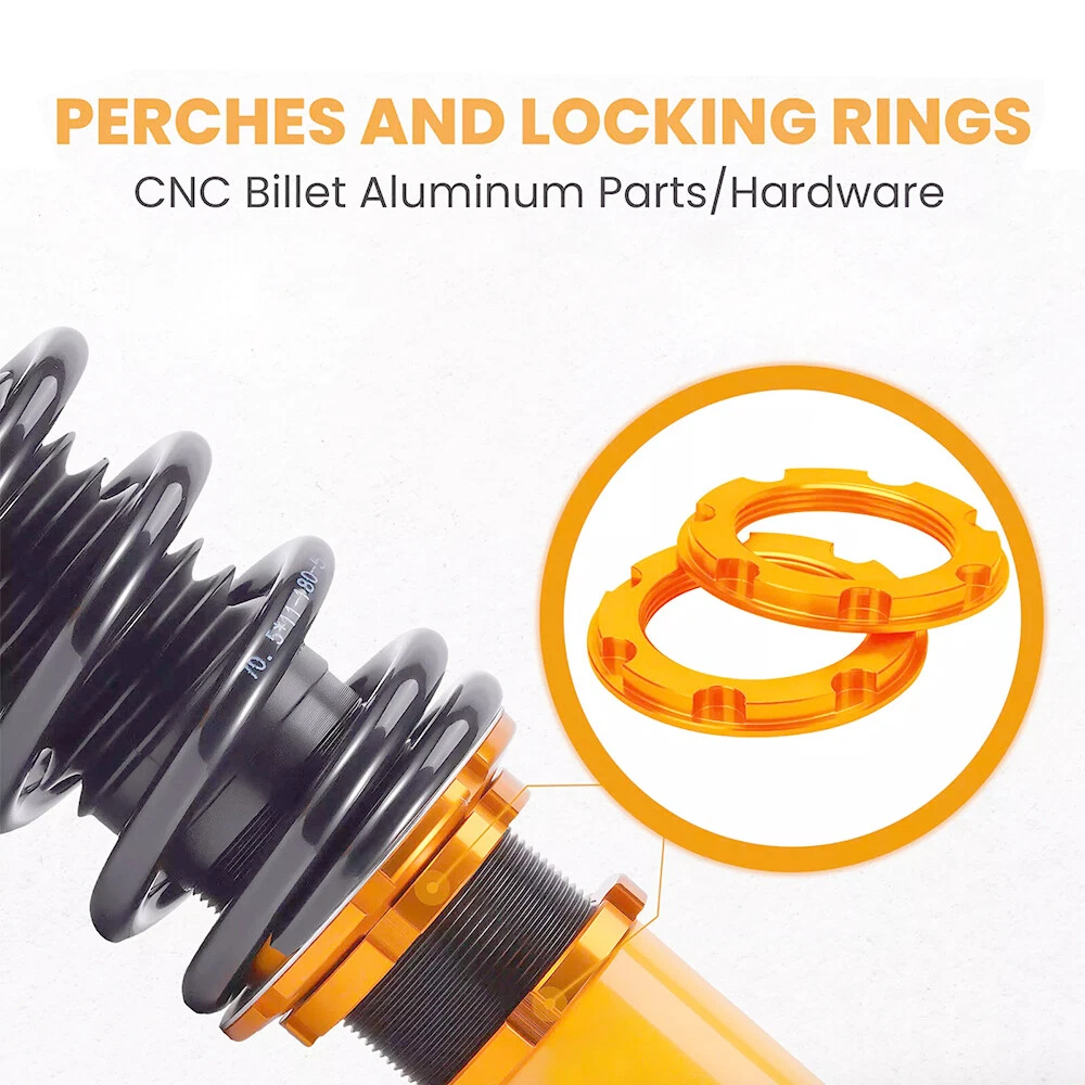 Features - 24 Step to adjust soft / hard adjustment according to your preference - Ride Height Adjustable - Drops From 1 to 3 Inch From Factory Ride Height - 55CrSi high strength durable cold wound steel & heat treated coils - Manufactured from high quality T-6061 billet aluminum with an anodized finish for superior strength and corrosion protection. - Improved Handling and stability without premature tire wear - Improved Vehicle Stability and traction in hard cornering situations - Full threaded absorber tube casing for independent height adjustment - Twin-Tube System for Comfortable Ride on Streets Application For Honda Civic / CRX 1988-1991 EE EF EC For Honda Civic 1992-1995 EJ EG EH fork type For Honda Civic 1996-2000 EK For Acura Integra 1990 -1993 DA DB fork type For Acura Integra 1994-2001 Specifications - Front and Rear top mount: rubber - Damping: 24 levels rebound damping adjustable - Spring rate Front: 8 kg/mm (448 lbs/in) - Spring rate Rear: 5 kg/mm (280 lbs/in) - Spring length Front: 180mm - Spring length Rear: 180mm - Adjustable height: lowering 1-3inch - Coilover overall length Front: 365mm-410mm - Coilover overall length Rear: 435mm-480m - Shock type: Twin tube - Spring Preload: 7-10 mm Package included - Complete 2 Front + 2 Rear coilovers - A pair of wrenches for height adjustment - For some vehicles, you will need sleeves and washers that already included in our package.